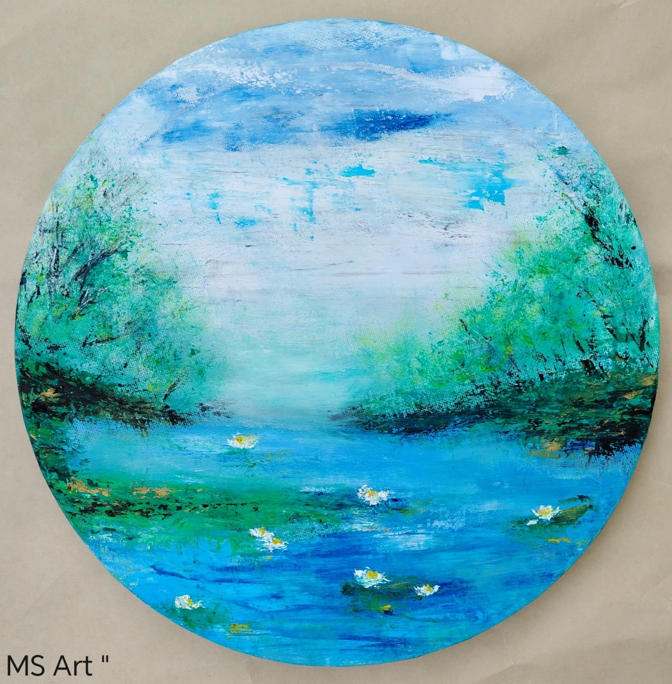 Спокойствието на езерото " #Artpainting #Oilpaints #Abstract #Абстрактна #картина с #маслени #бои върху #кръгло #платно с подрамка, диаметър 30 см.