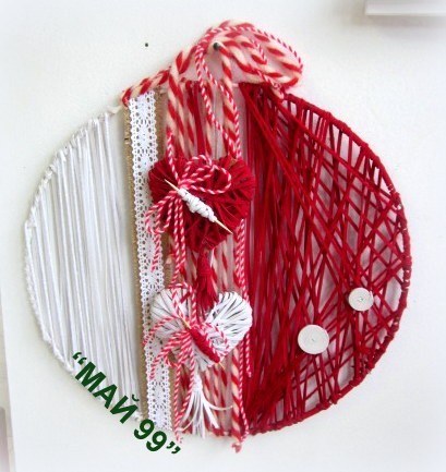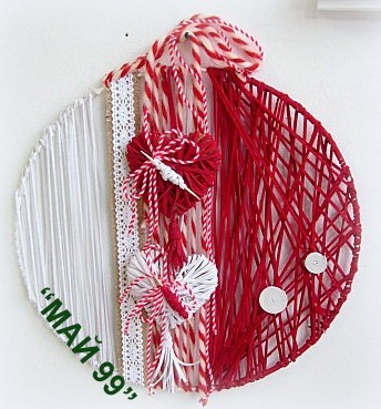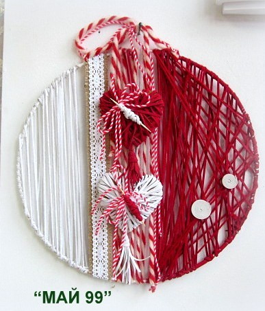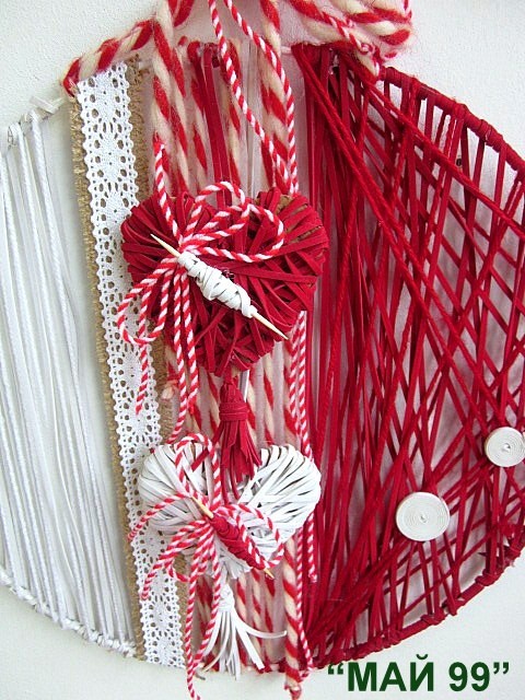 Пано /мартеница за баба Марта ф 30 см. на основа метален обръч, обвит двустранно с ленти от кожа и прежда /бяла и червена/,преплетени сърца от кожа и пресукана прежда мартеница! Различно и оригинално пано за св.Валентин или баба Марта за вашия дом,офисили къща за гости!