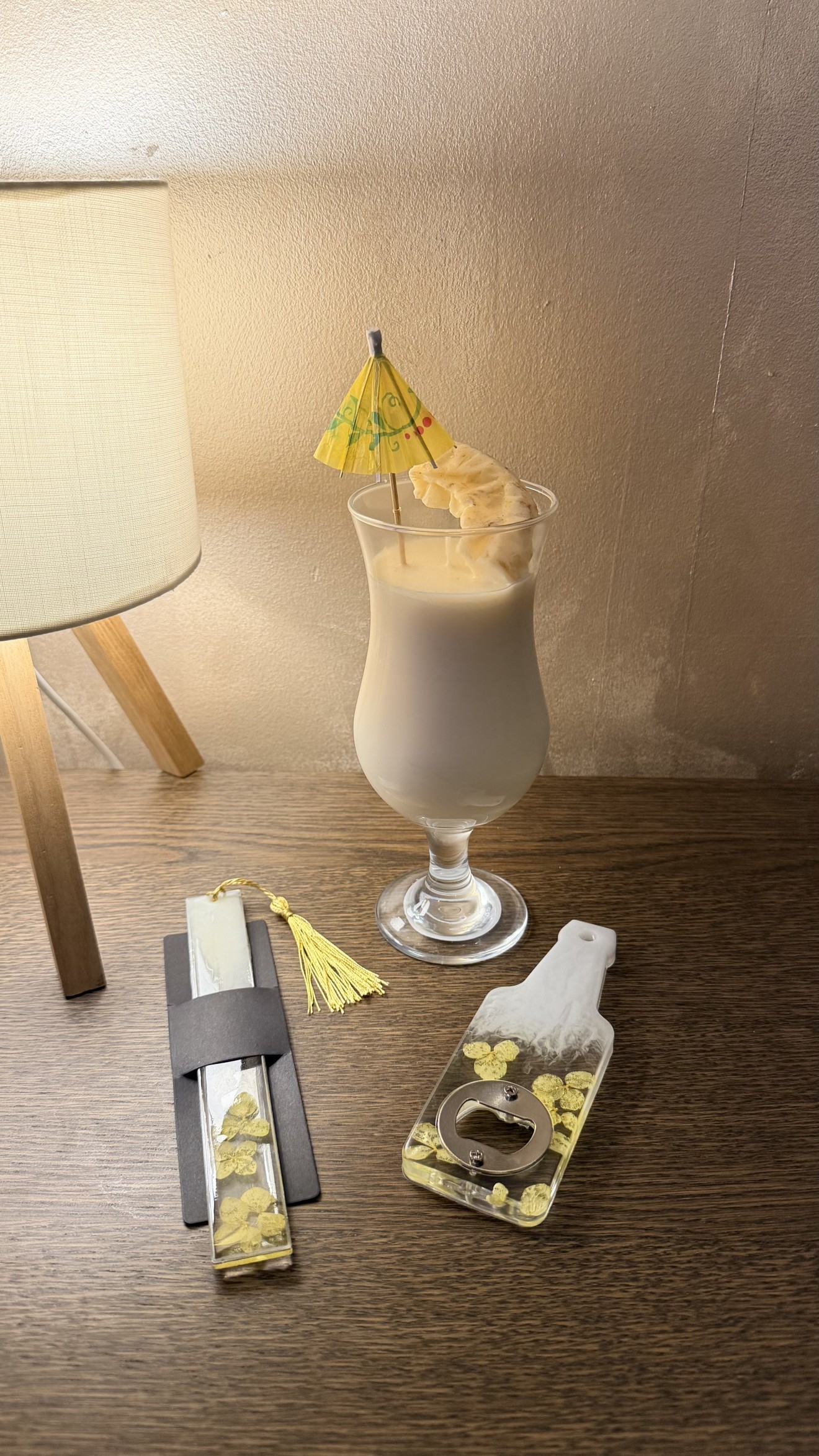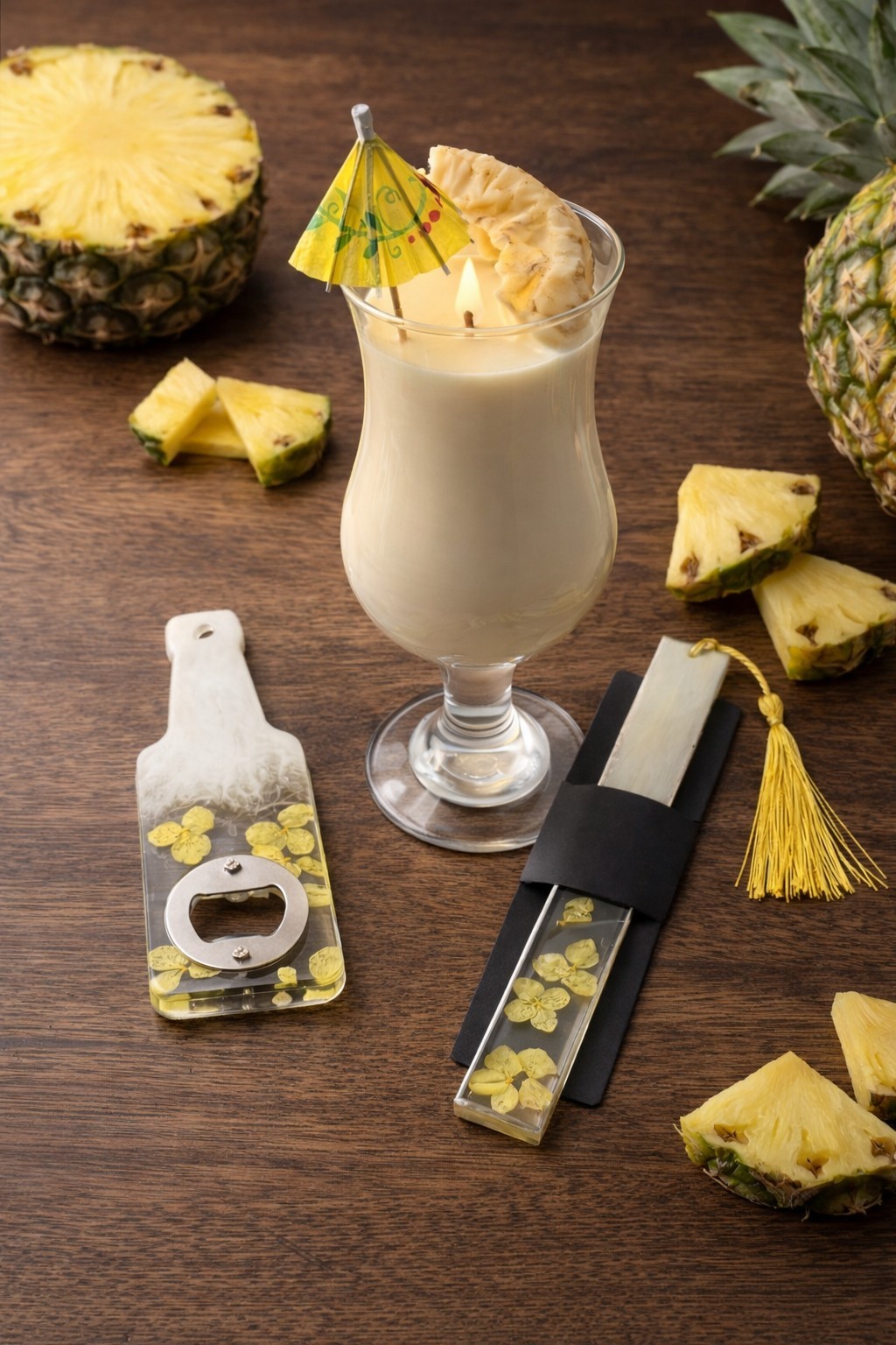 Колекцията Sweet Sips те пренася директно на плажа – там, където слънцето залязва бавно, а в ръката ти има студена Pina Colada. Тази свещ изглежда като истински коктейл – с нежна „пяна“ и резенче ананас от восък, а ароматът ѝ носи усещане за кокос, ананас и безгрижни летни вечери. Стил, настроение и сетивно изживяване в едно – перфектният подарък за любителите на коктейлни аромати и лятното настроение. ⸻ ☕ Включва: • Свещ тип напитка Pina Colada – реалистичен външен вид и тропически аромат. • Книгоразделител от епоксидна смола – в жълто и млечно-кокосови нюанси. • Отварачка от смола – вдъхновена от същия коктейл, стилна и практична.