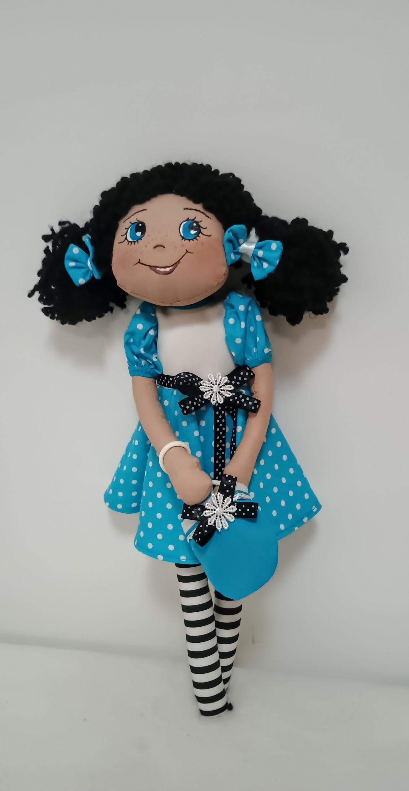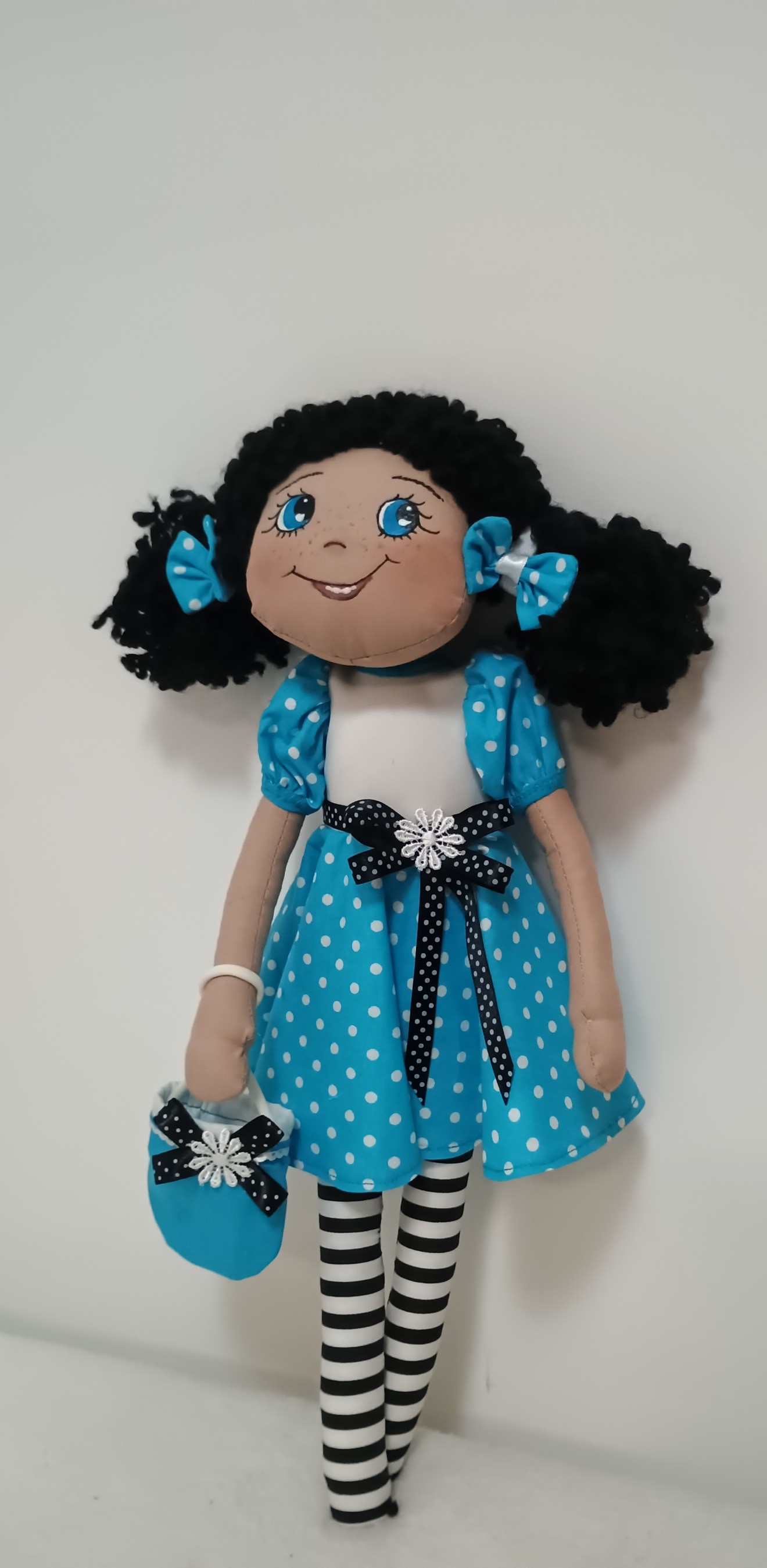Кукла Радост е много щастлива, защото има малка чанта, в която може да сложи 2 бонбона. Ръчно изработена от памучен плат, лице, изрисувано с текстилни и акрилни бои,силиконов пух за пълнеж, коси от къдрава прежда.Рокличка с Буфон ръкав, която се закопчава отзад със секретно копче.Височина 45 см.Налична.
