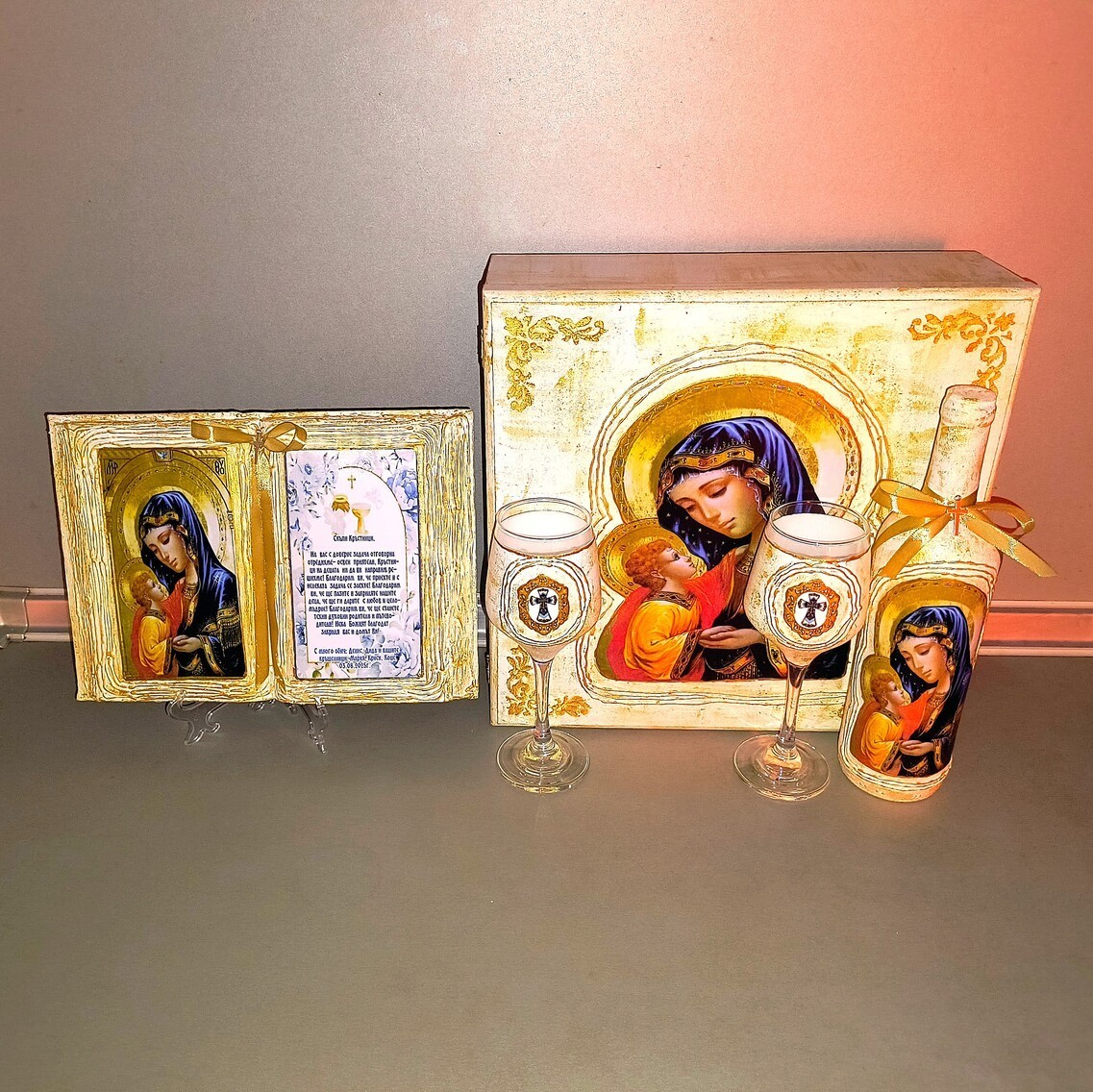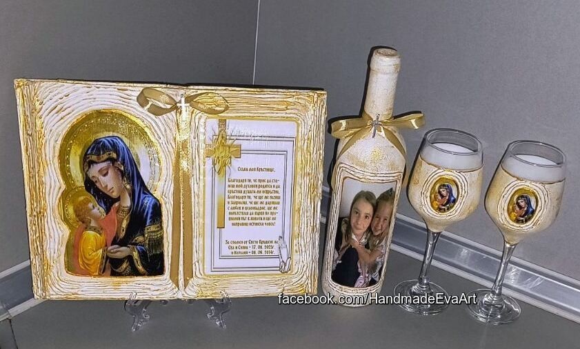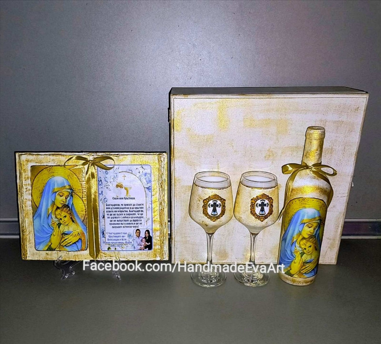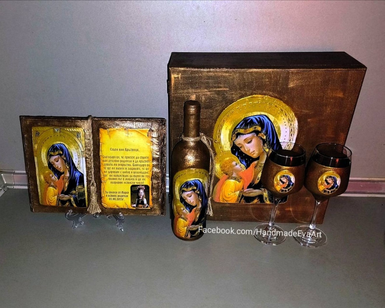 Подарък за Кръстници (-ца, -к)- ръчно изработени с икона по избор (+ снимка) и личен поздрав: - Старинна книга - Бутилка+ 2 или повече чаши -Кана -Гарафа -Декоративни свещи -Подаръчни кутии Получава се уникален подарък за кръстници, както и за всеки друг повод. Изцяло авторска изработка! #подаръккръщене #рисуваностъкло #стариннакнига #ръчноизработенподарък #ръчнаизработка #подаръккръстници #подаръккръстница #подаръккръстник #кръстници #кръстница #кръстник