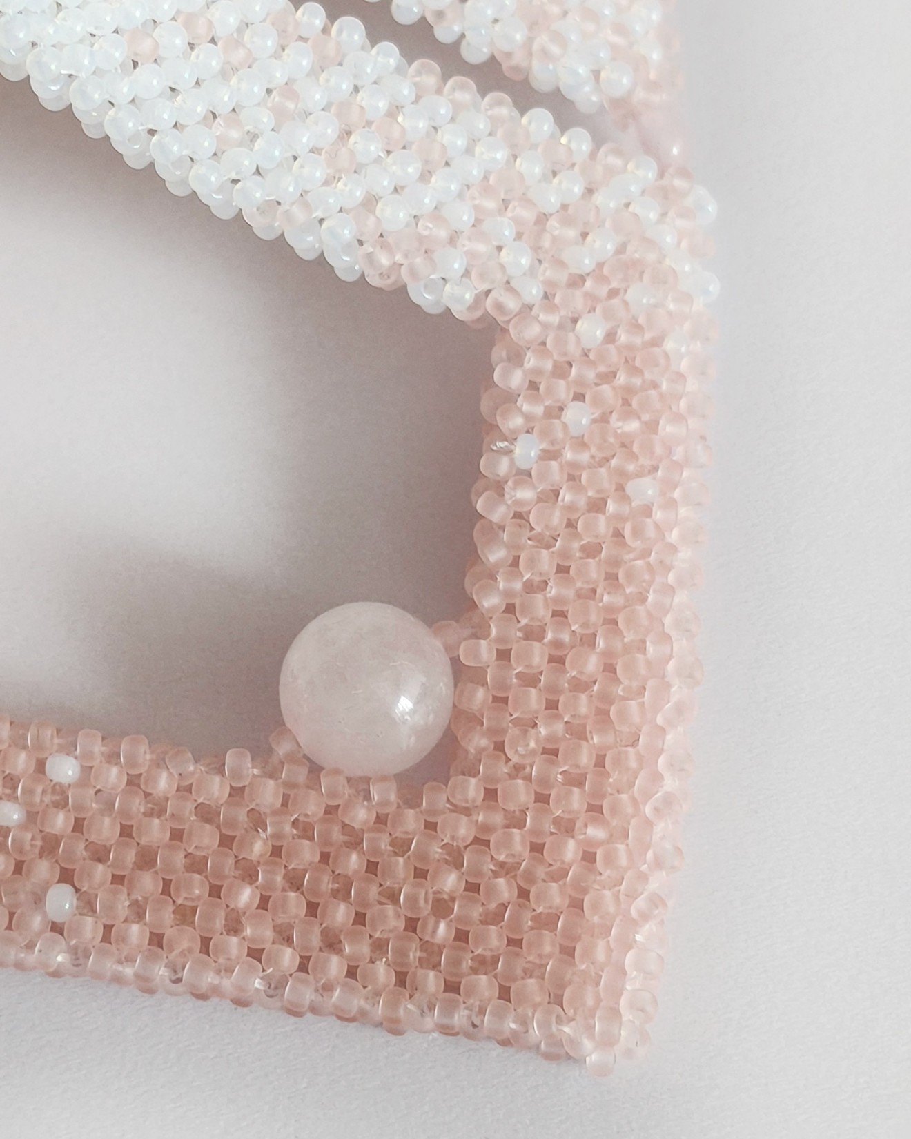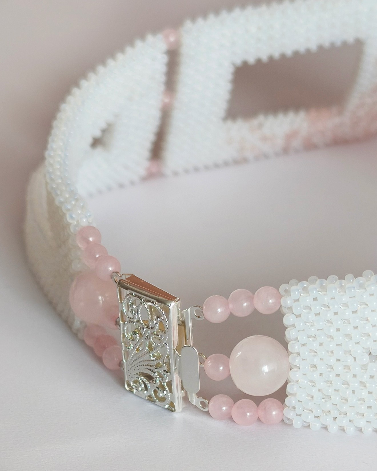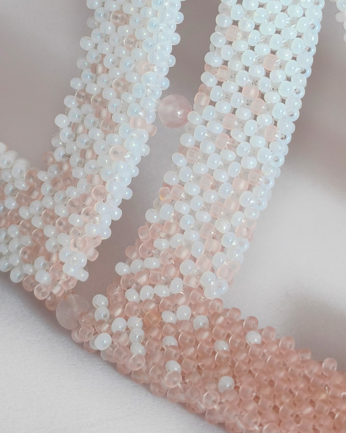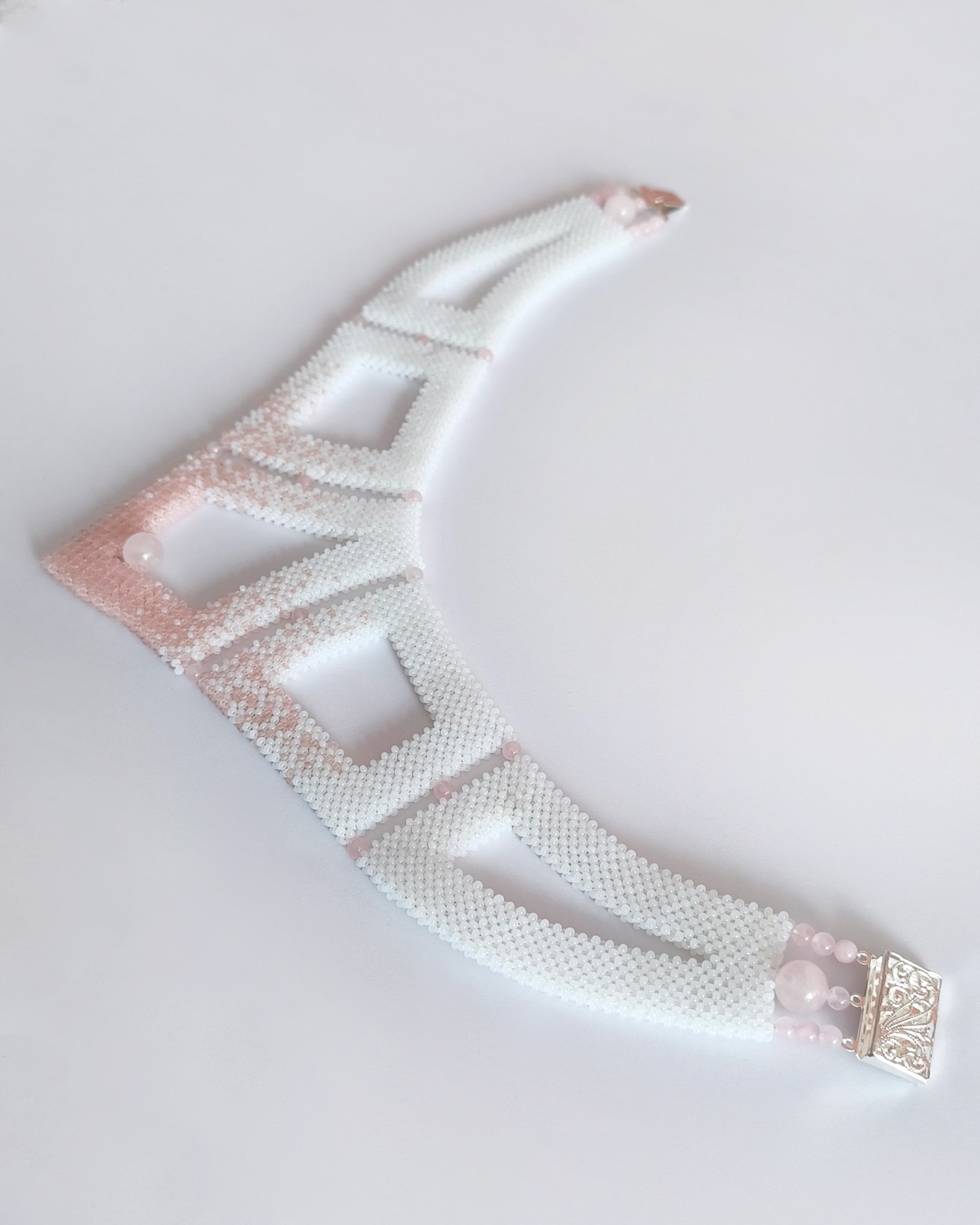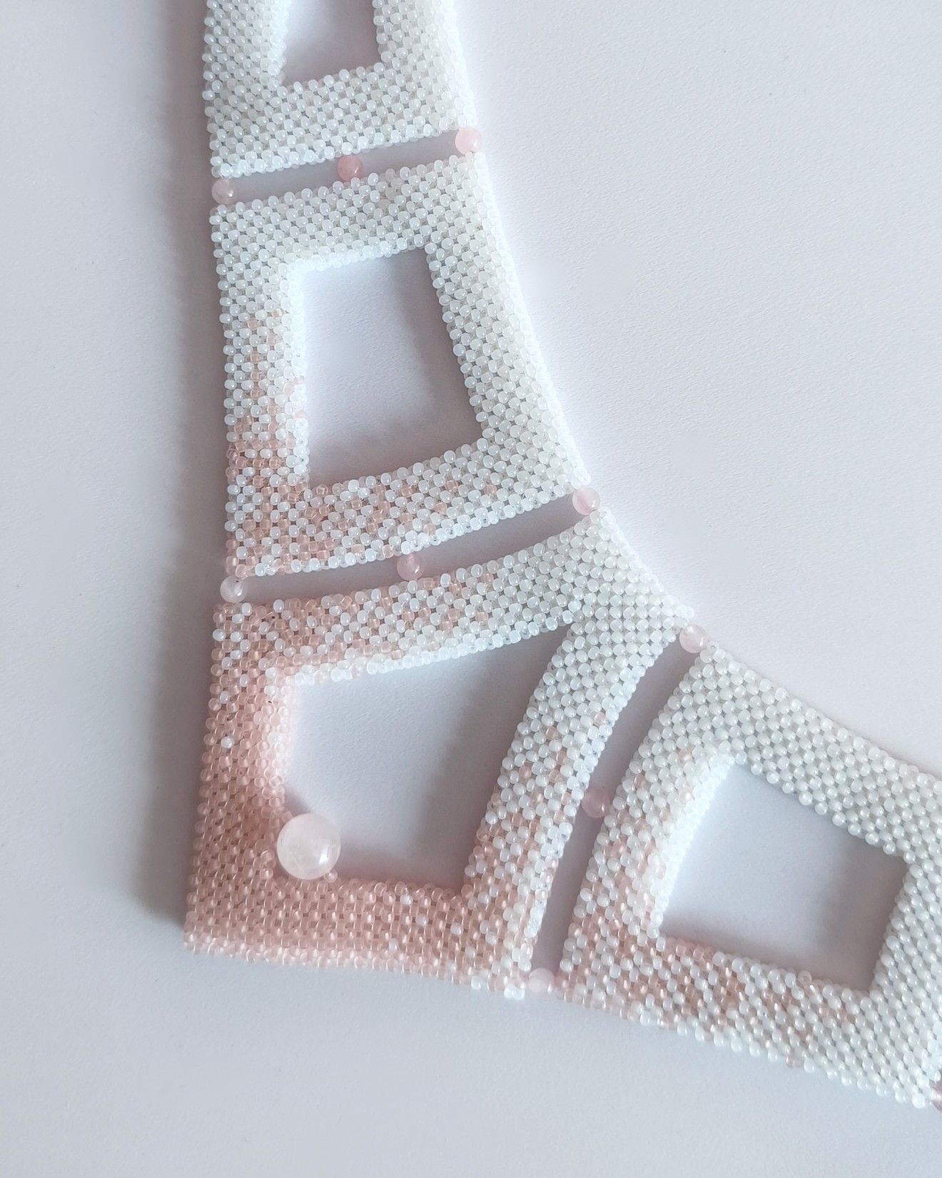 - Чешки мъниста: млечно бели и розови - Дължина на колието: ~37 см със закопчалката - Размери на средния, най-голям елемент: 7.5х10 см - Плетено на ръка Можете да разгледате и други модели във - Фейсбук: collier.jewelry.j.j - Инстаграм: collier.j.j