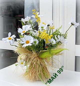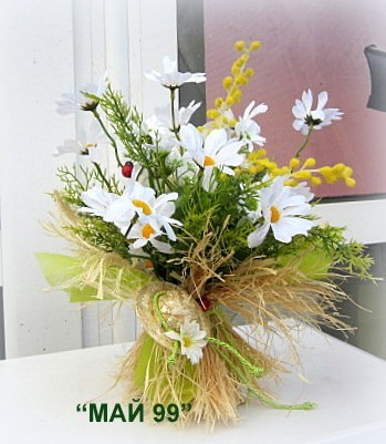 Стоящ букет нежни,бели изкуствени маргаритки с височина 30 см./27 см. в обемната част,обвит с кокосови влакна,слама и блезо зелен физелин,зелен шнур и 8 см.сламена шапка шапка! Чудесен пролетен декор!