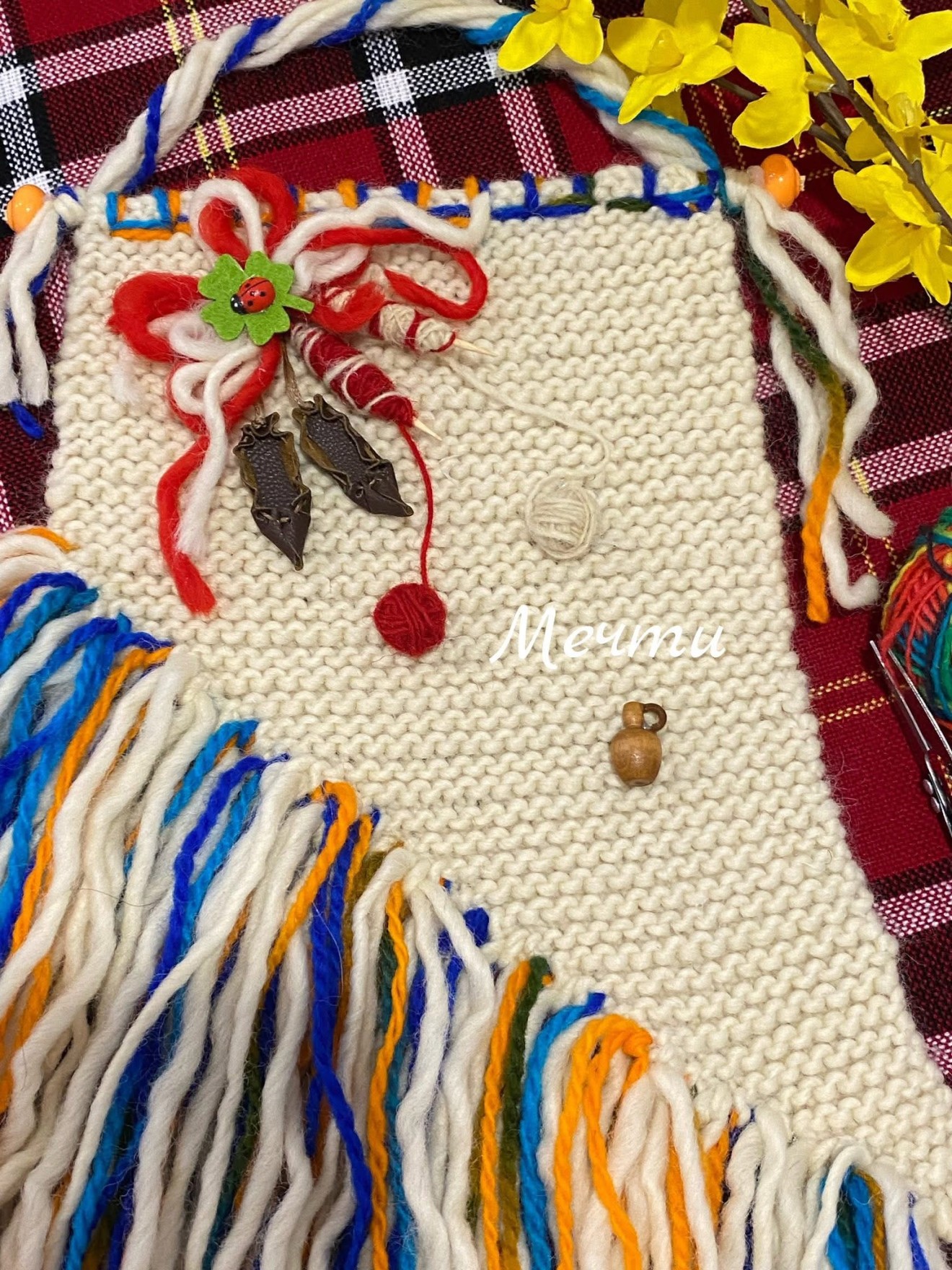Ръчно изплетени от вълнена прежда, декорирани с цървулки, житни кълнове, вретенца, кълбенца, стомнички, детелинки... Приблизителни размери; дължина с ресничките-35см. ширина-18см. За здраве и берекет!