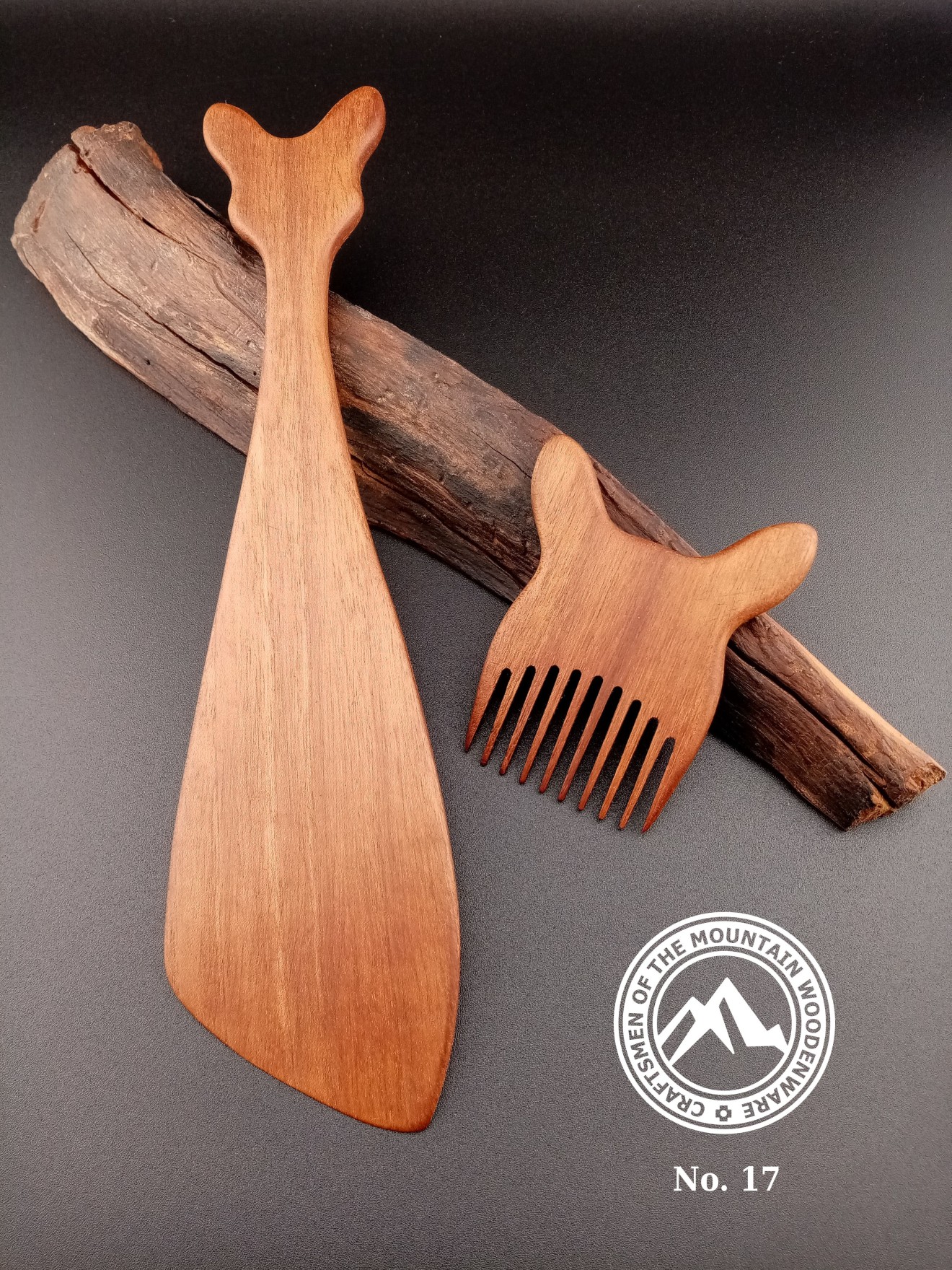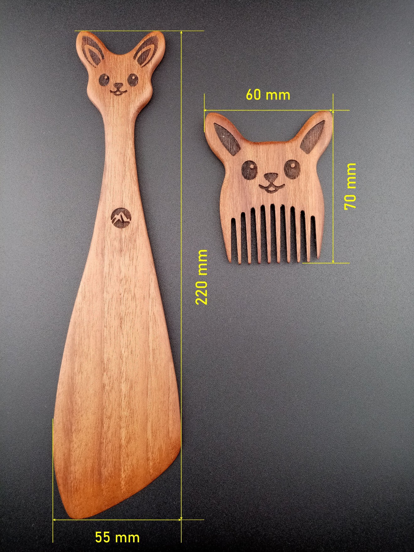 Детски комплект, изработен от орехова дървесина, с шпатула за готвене и гребен за коса със зайче.