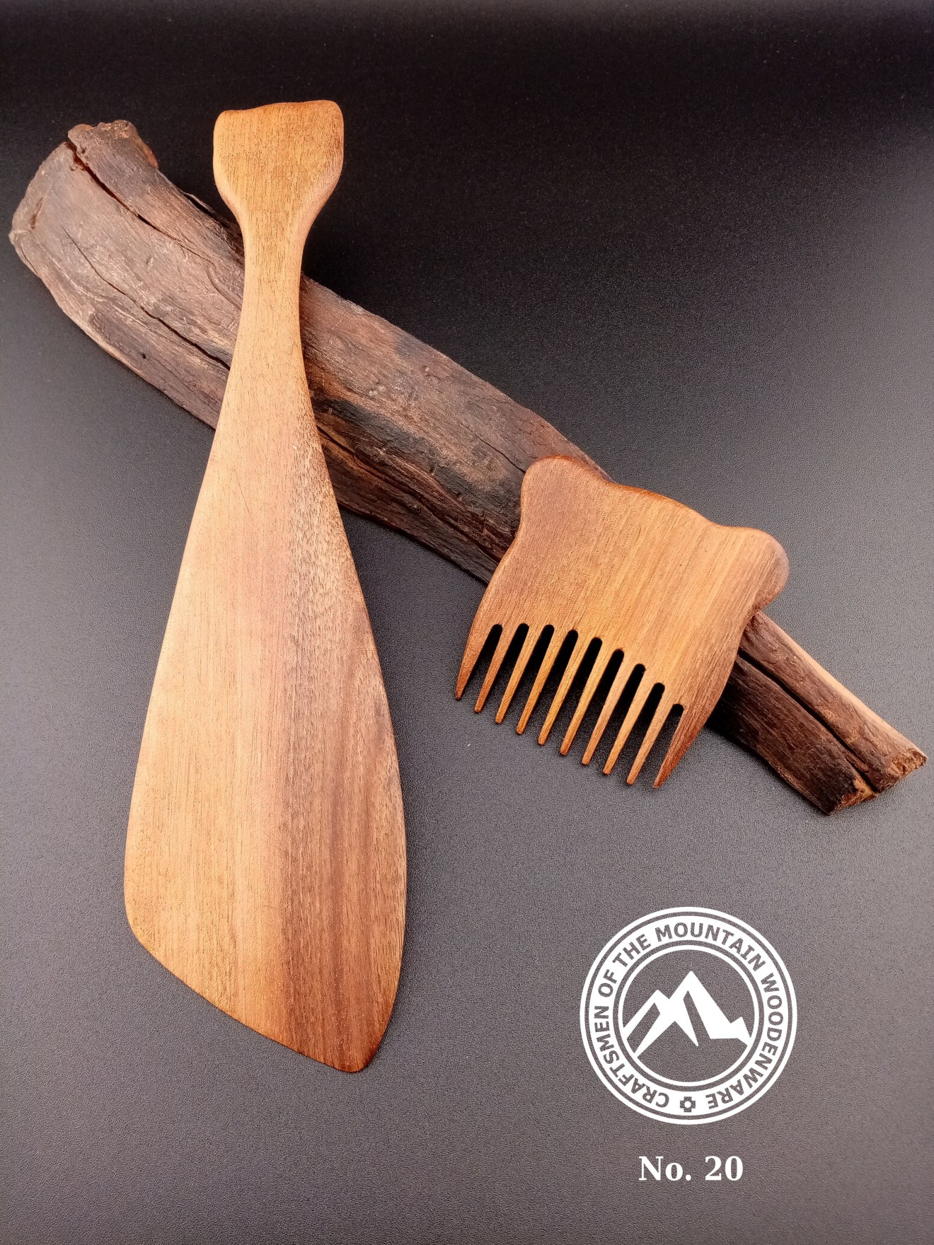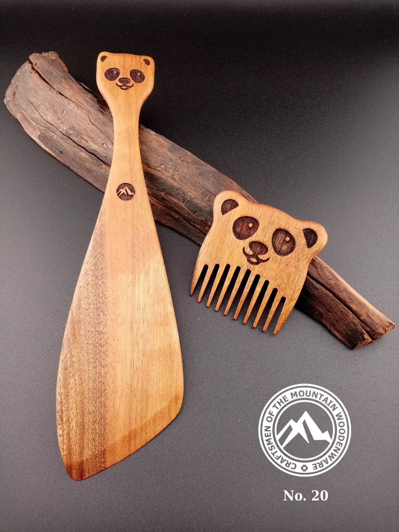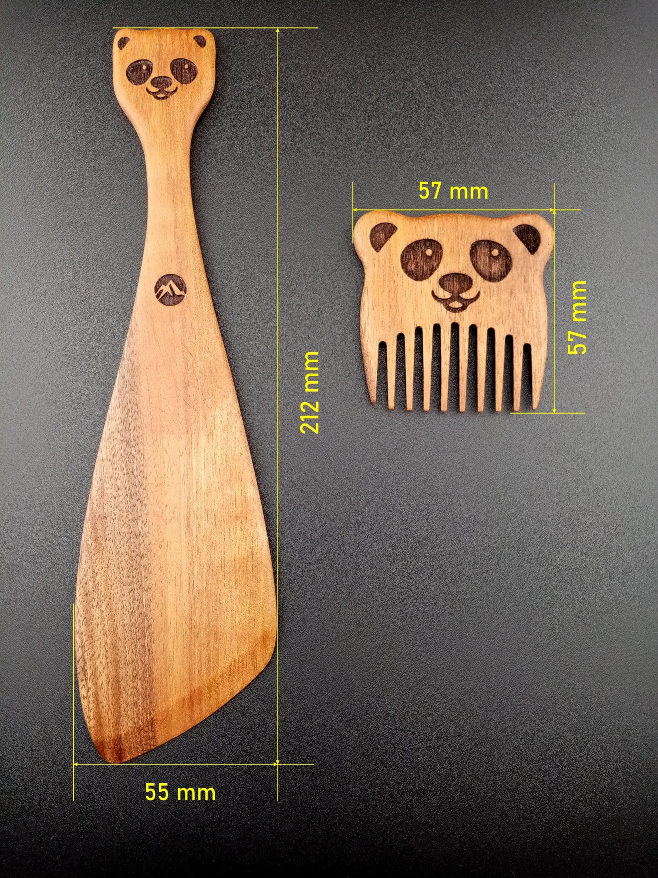 Детски комплект, изработен от орехова дървесина, с шпатула за готвене и гребен за коса с панда.
