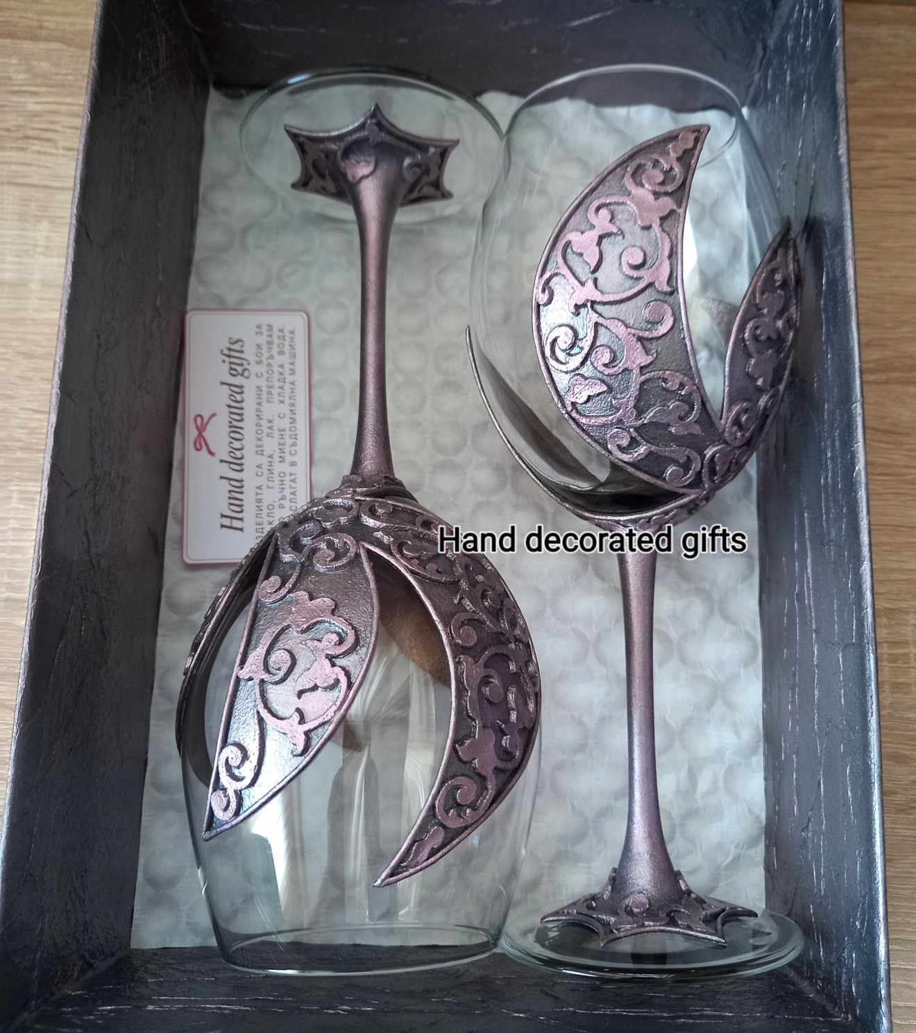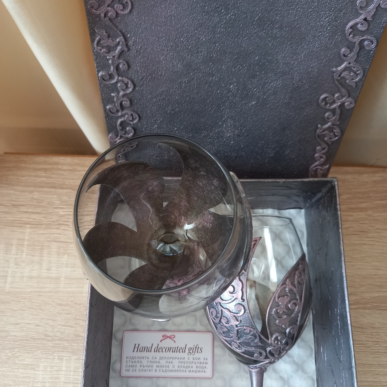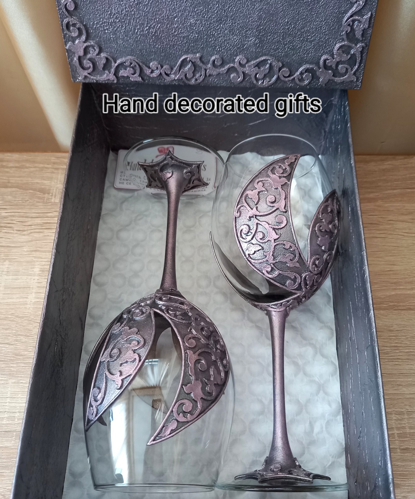 Две големи чаши за вино в декорирана кутия.Използвала съм бои за стъкло, глина, лак. Препоръчвам само ръчно миене с хладка вода на чашите и почистване с влажна кърпа на кутията.