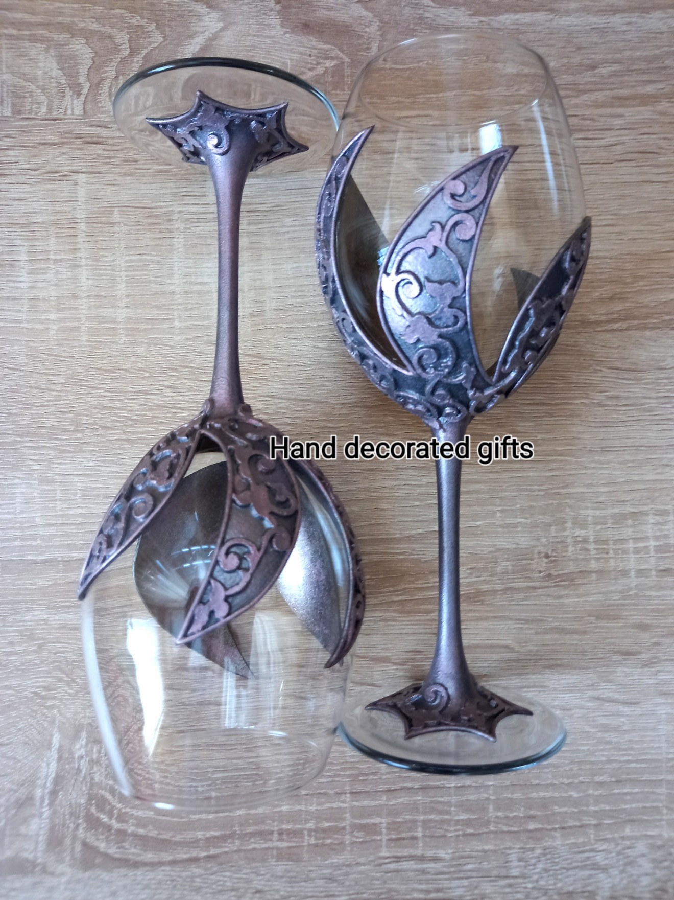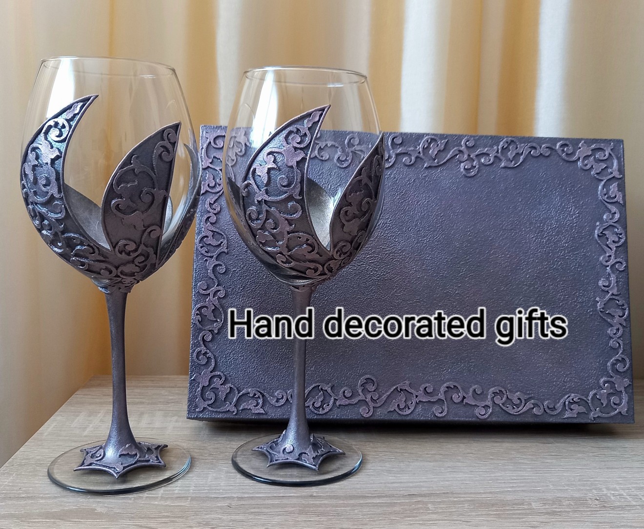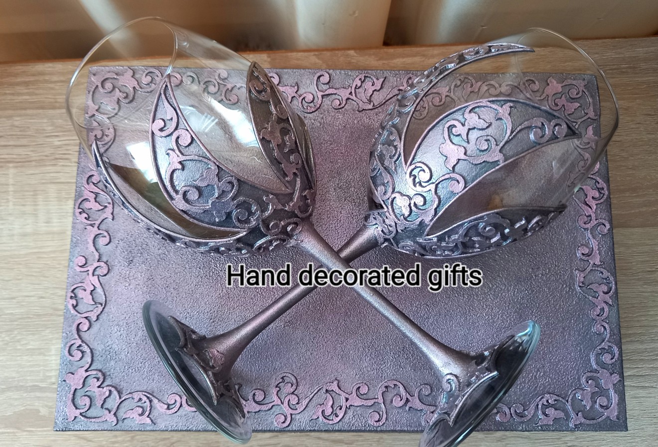 Две големи чаши за вино в декорирана кутия.Използвала съм бои за стъкло, глина, лак. Препоръчвам само ръчно миене с хладка вода на чашите и почистване с влажна кърпа на кутията.