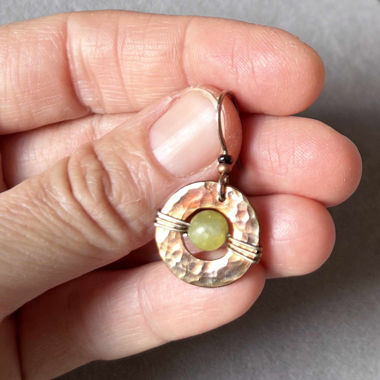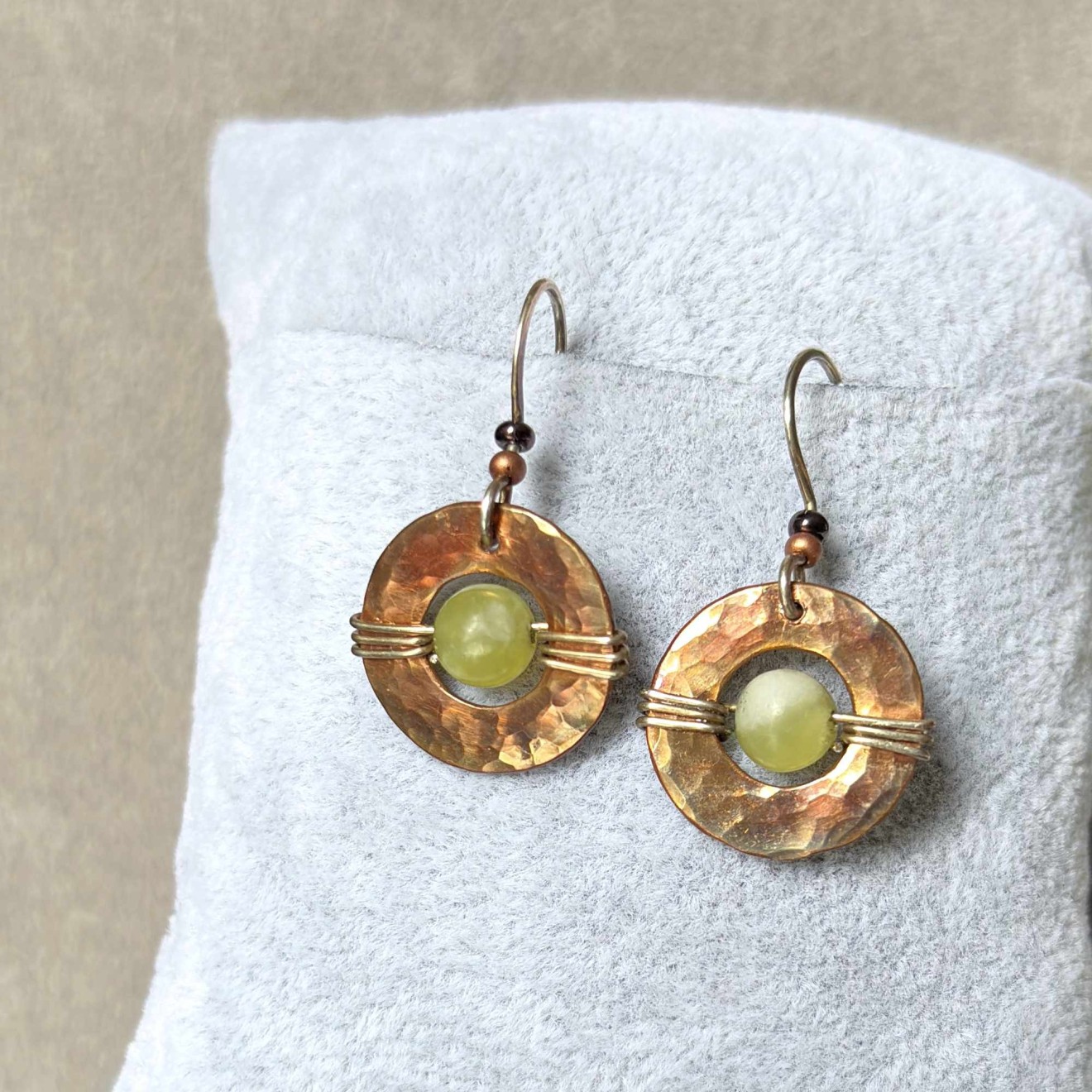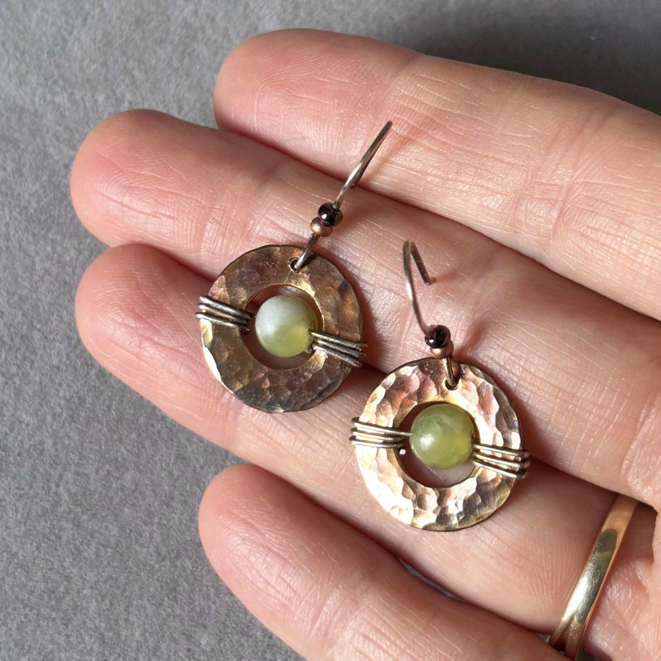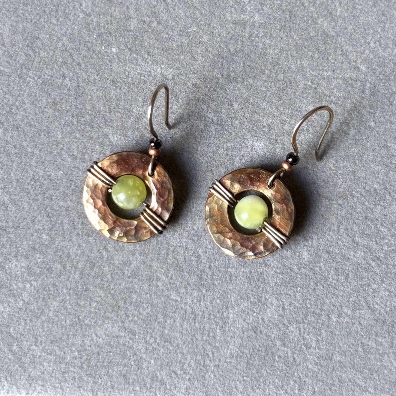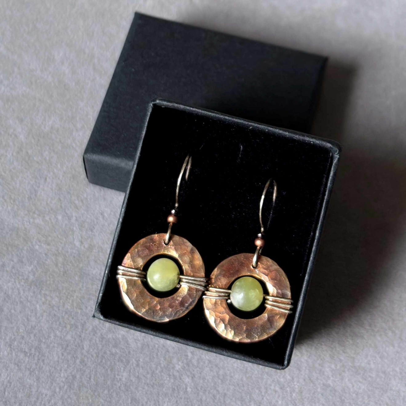 Ръчно изработени обеци в бохо стил с естествени камъни. Основа: Ръчно ковани медни шайби с уникална многоцветна патина. Камък: 6 мм естествен зелен жадеит, вплетен в отвора на шайбата. Кукичките: Ръчно изработени от оксидирано сребро 925 (подходящи за чувствителни уши). Детайли: Стъклени мъниста в меден цвят и тъмно бордо за допълнителен акцент. Защита и дълготрайност: Металът е защитен с професионален бижутерски лак и финиширан с Renaissance Wax (музеен клас вакса). Това предотвратява оксидацията, не цапа кожата и запазва цветовете на патината непокътнати. Налични са само в един екземпляр. За поръчка, пишете ми на лично съобщение.