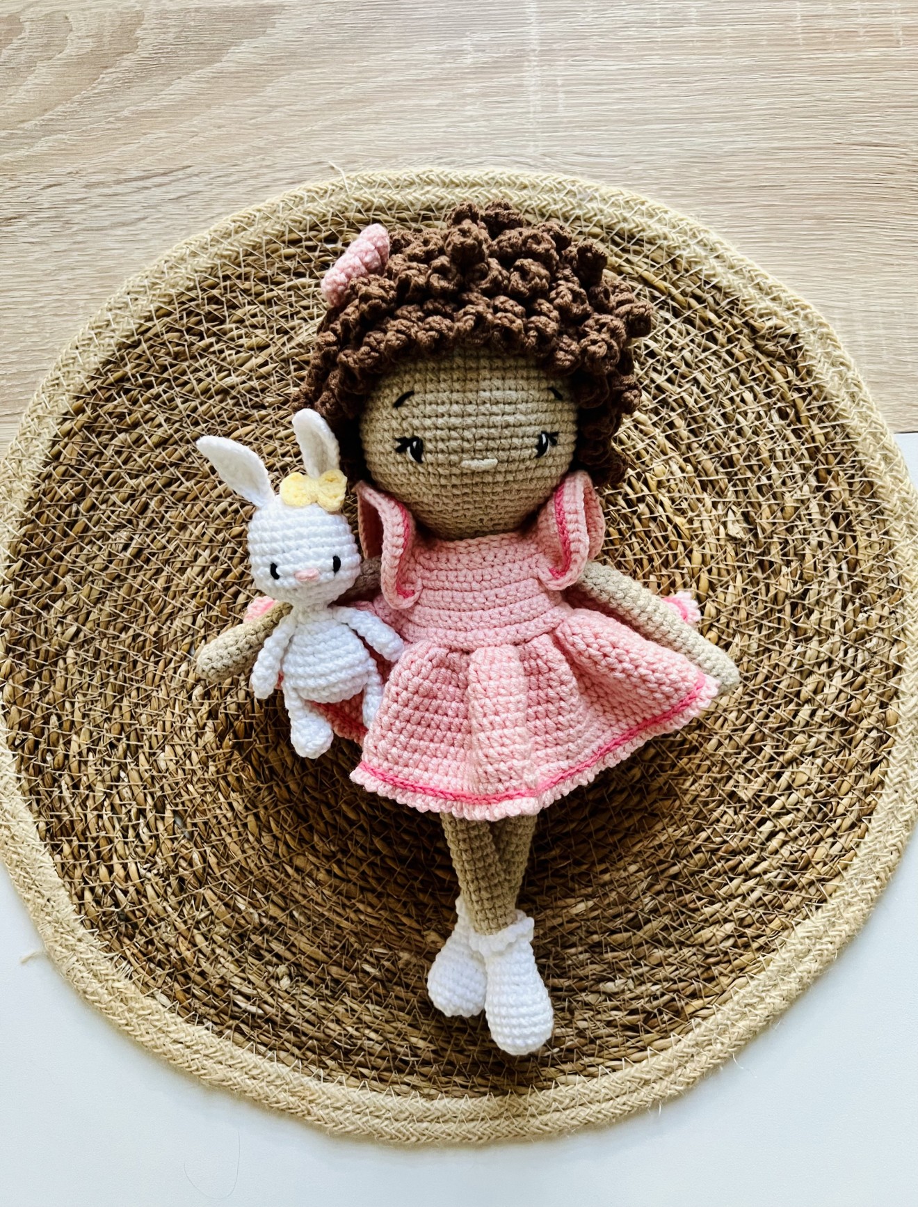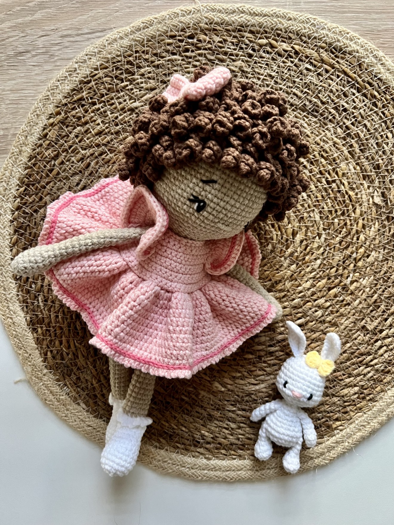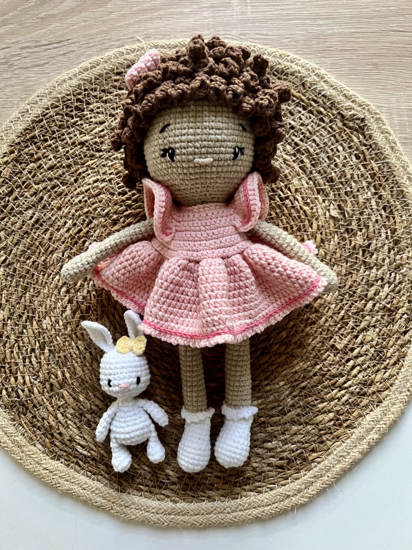 Височина около 25 см Кокетна кукличка с приятелче - зайче.