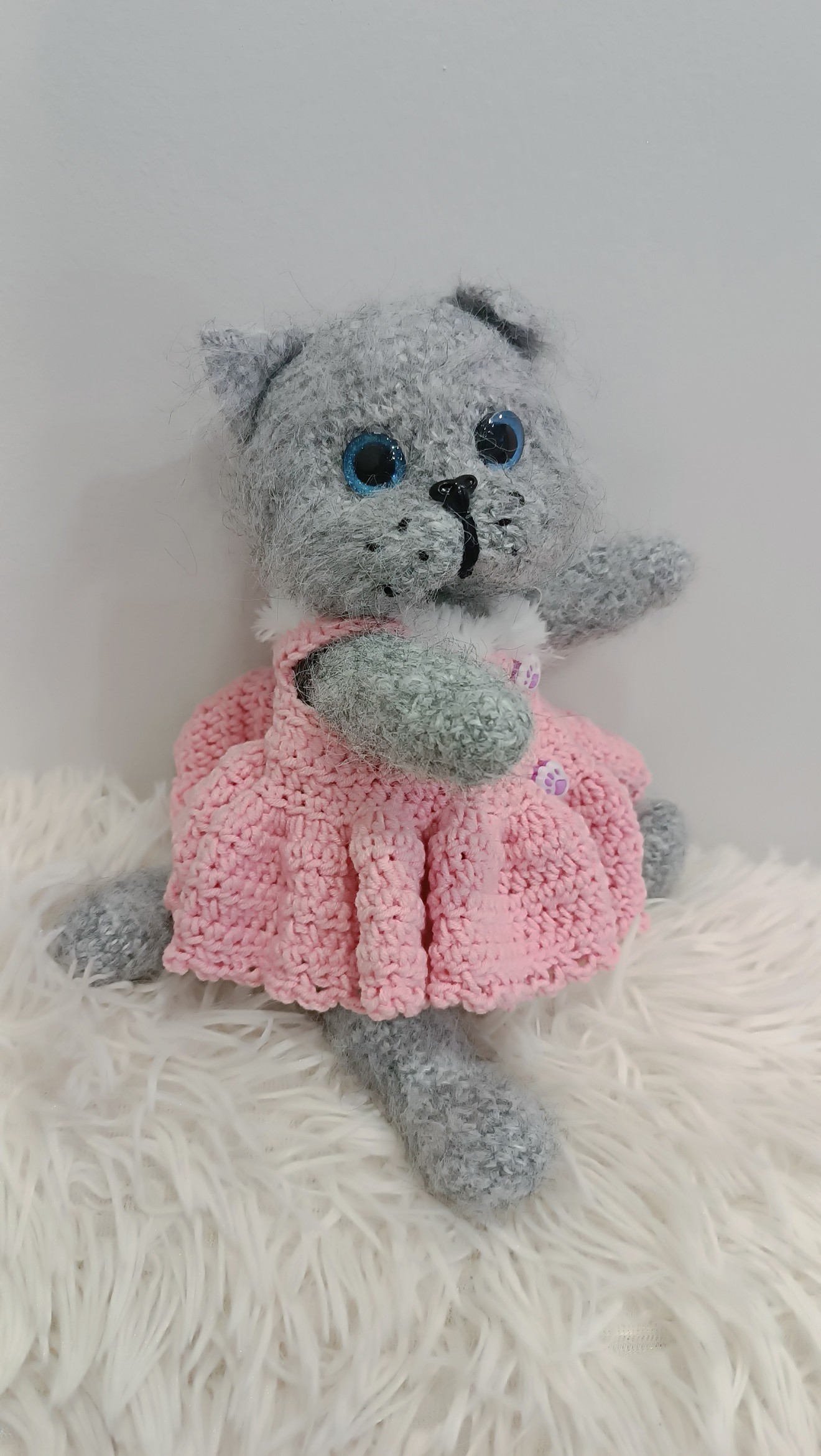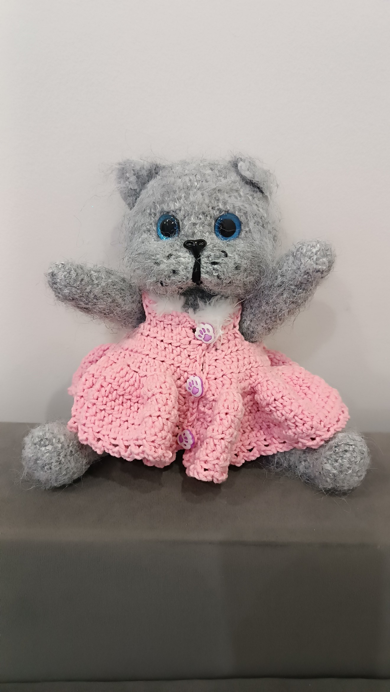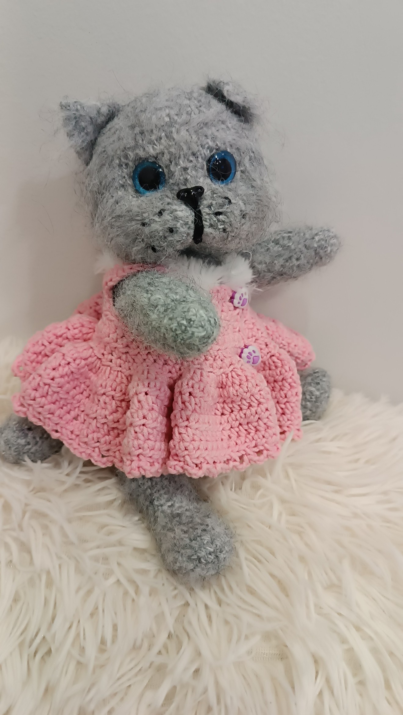Ръчно плетено сиво коте с големи сини очи и мека пухкава текстура. Облечено е в нежна розова рокличка с копчета лапички, което му придава сладък и игрив характер. Подвижни лапи и глава.Идеално за подарък или уютна декорация.