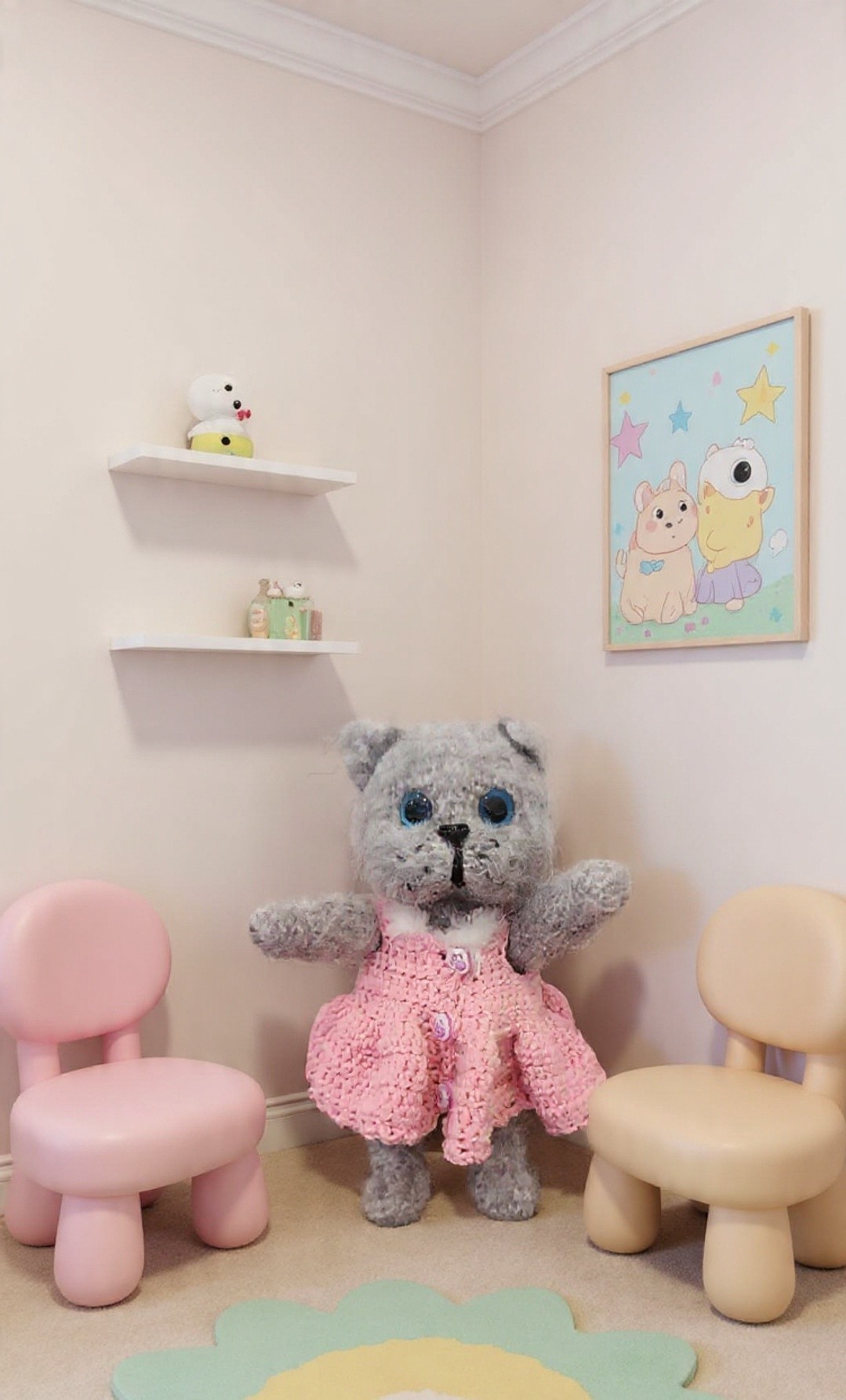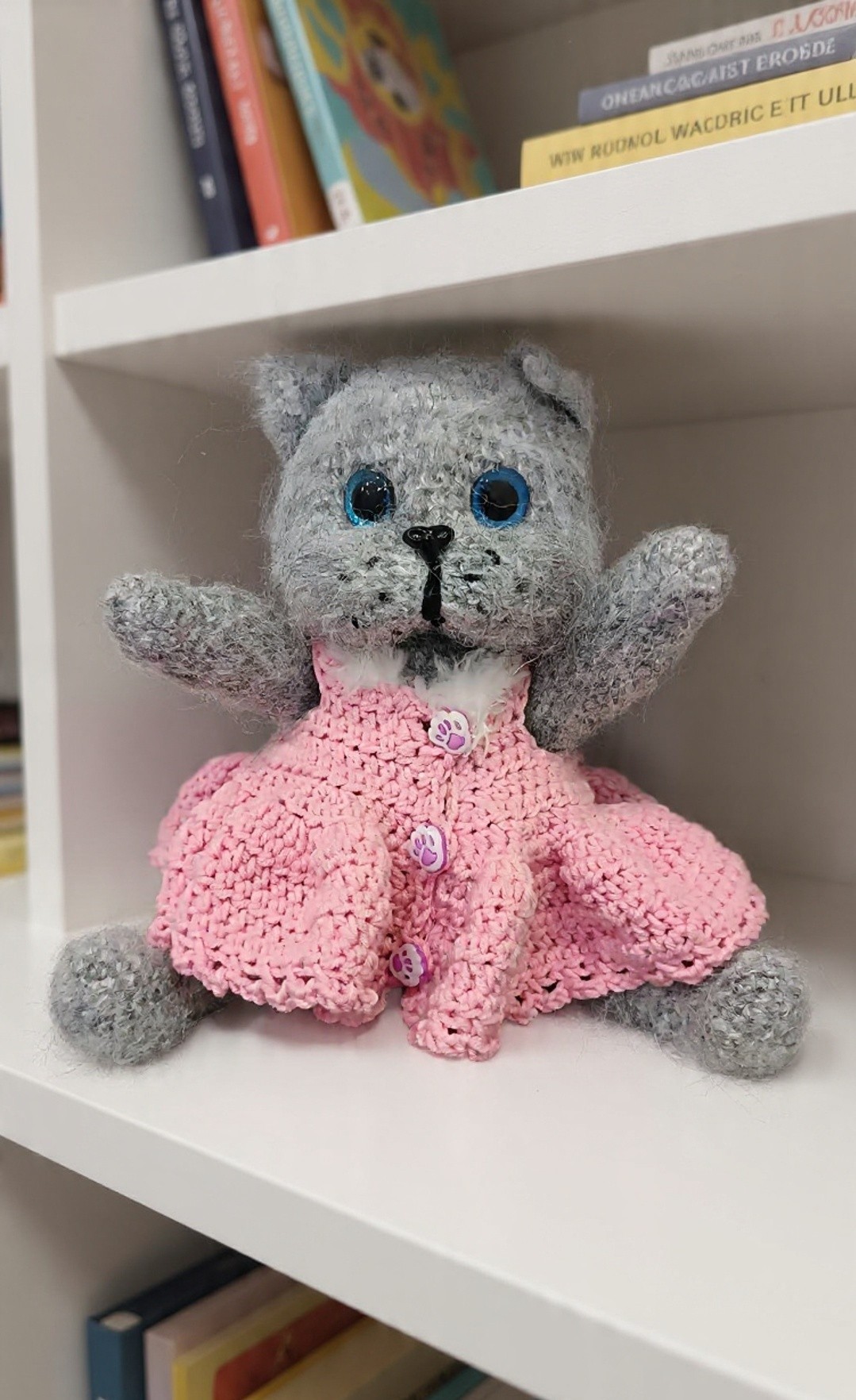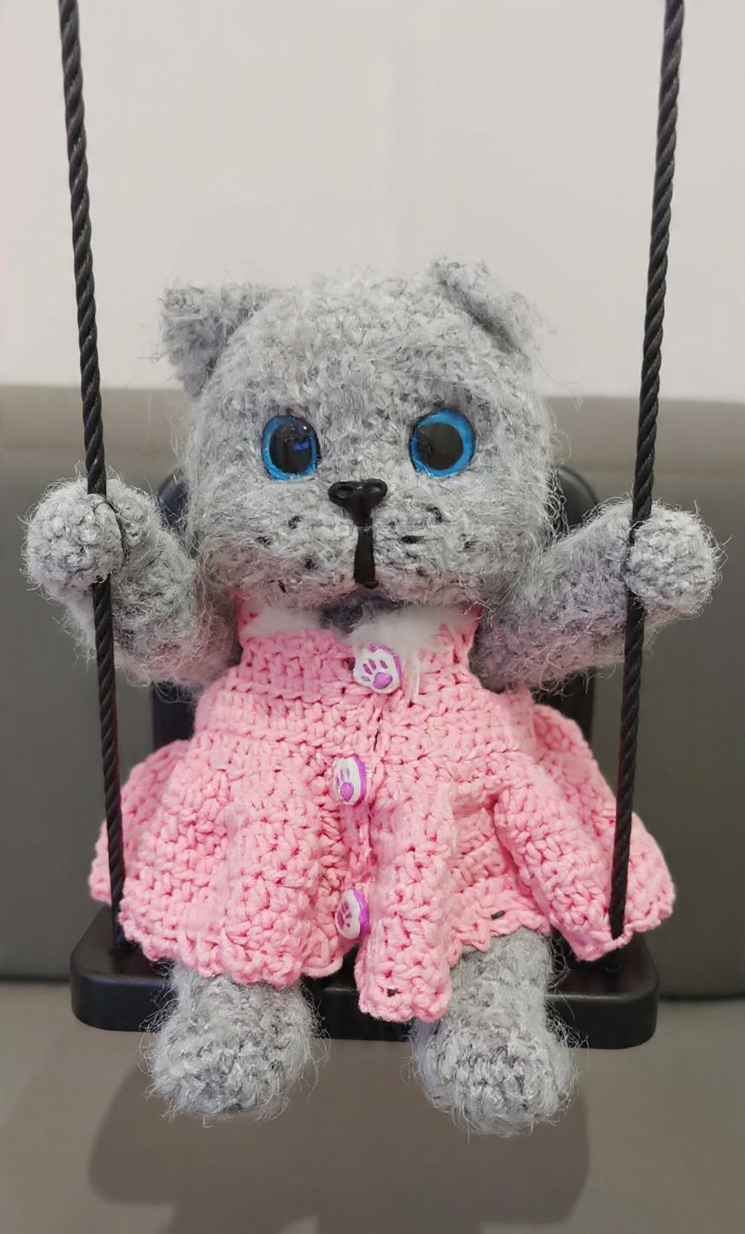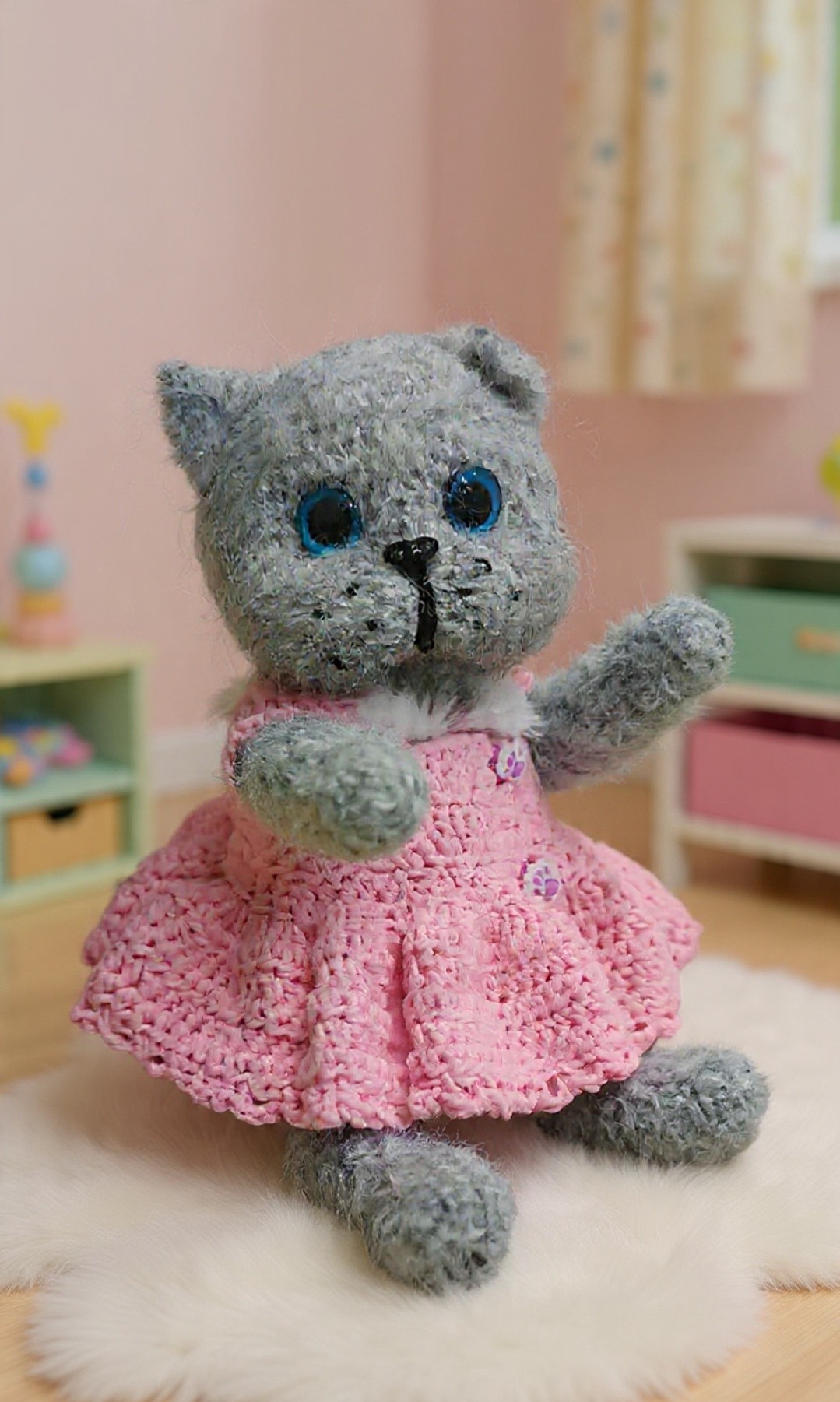 Ръчно плетено сиво коте с големи сини очи и мека пухкава текстура. Облечено е в нежна розова рокличка с копчета лапички, което му придава сладък и игрив характер. Подвижни лапи и глава.Идеално за подарък или уютна декорация.