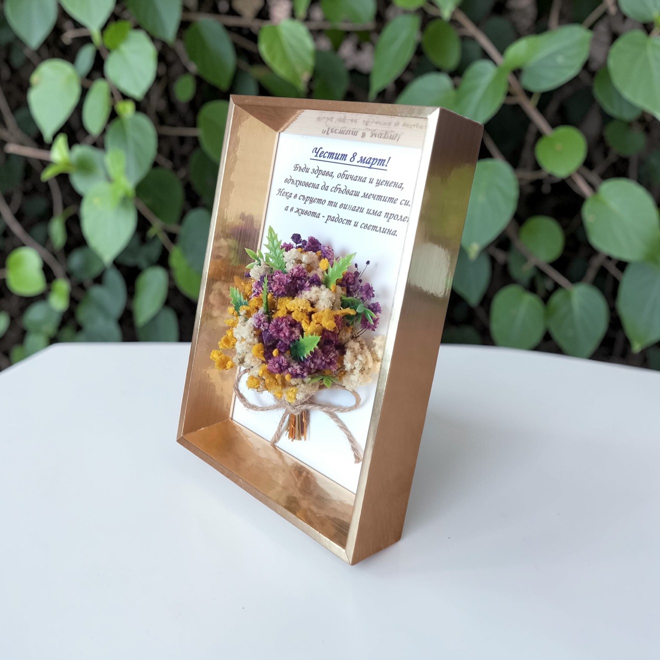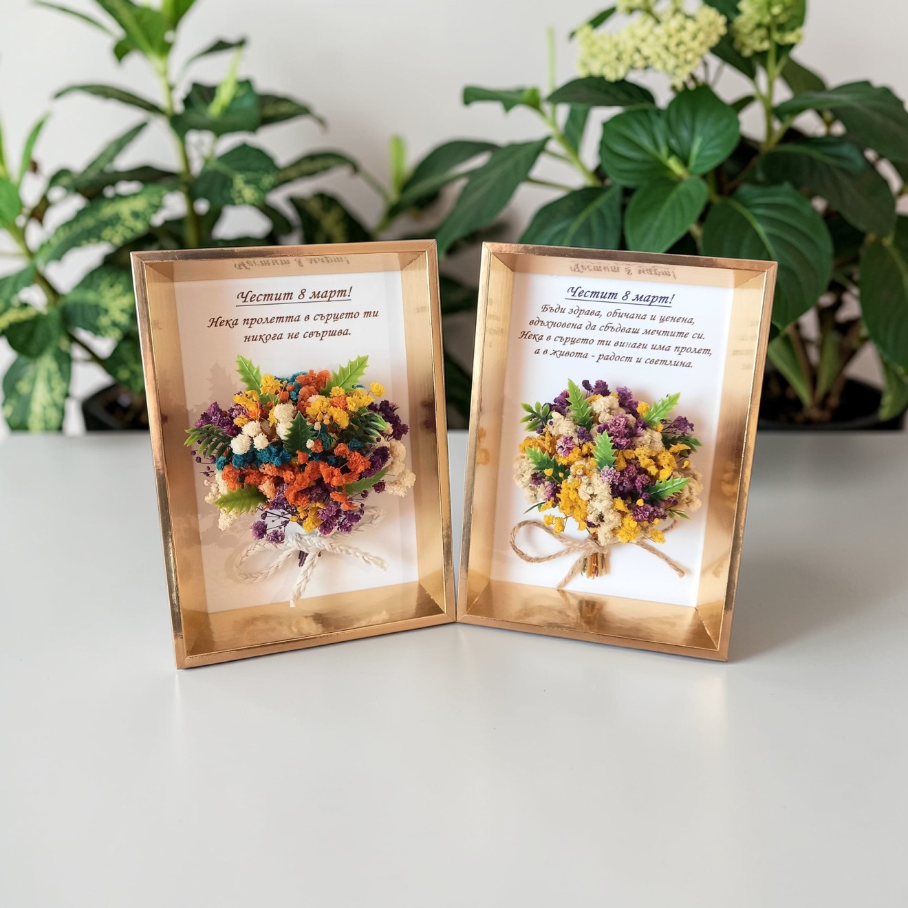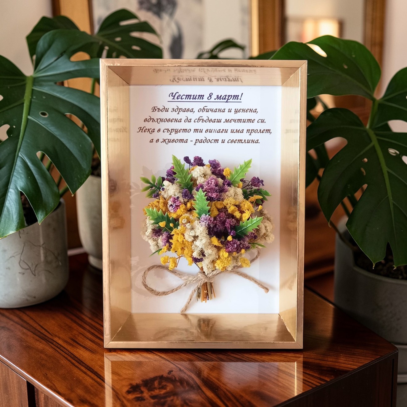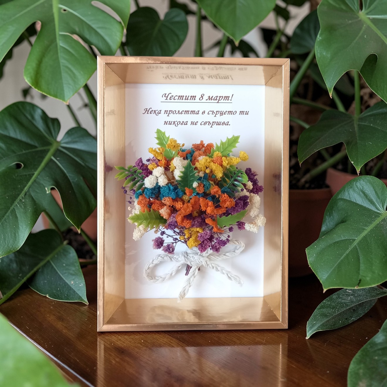 🌸 Подарък за 8-ми март – картина с букет от сухи цветя! 🌸 Стилен, нежен и различен подарък, който остава във времето 💝 Ръчно изработена картина със сухи цветя в елегантна рамка – готова да впечатли от пръв поглед ✨ 💌 Надпис по желание – лично послание, име или специален текст 🎁 Подходяща за мама, баба, любима, учителка или колежка 🌷 Дълготрайна красота без нужда от поддръжка Подари емоция, а не просто цветя 💕 📩 Поръчай сега и зарадвай специална жена!