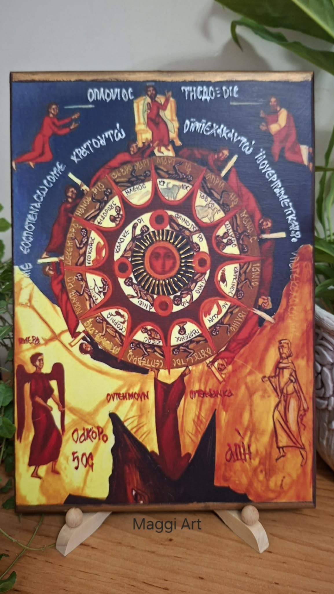 Икона"Колеото на живота" датираща от 1649г. се намира в църквата"Рождество Христово"-Арбанаси. Изработена с техника художествен декупаж,акрилни бои,байц,антични и битумни пасти,контури и пчелен восък. Масивна дървена основа с размер 20/30/2см. При желание всяка икона може да бъде персонализирана с текст-пожелание.