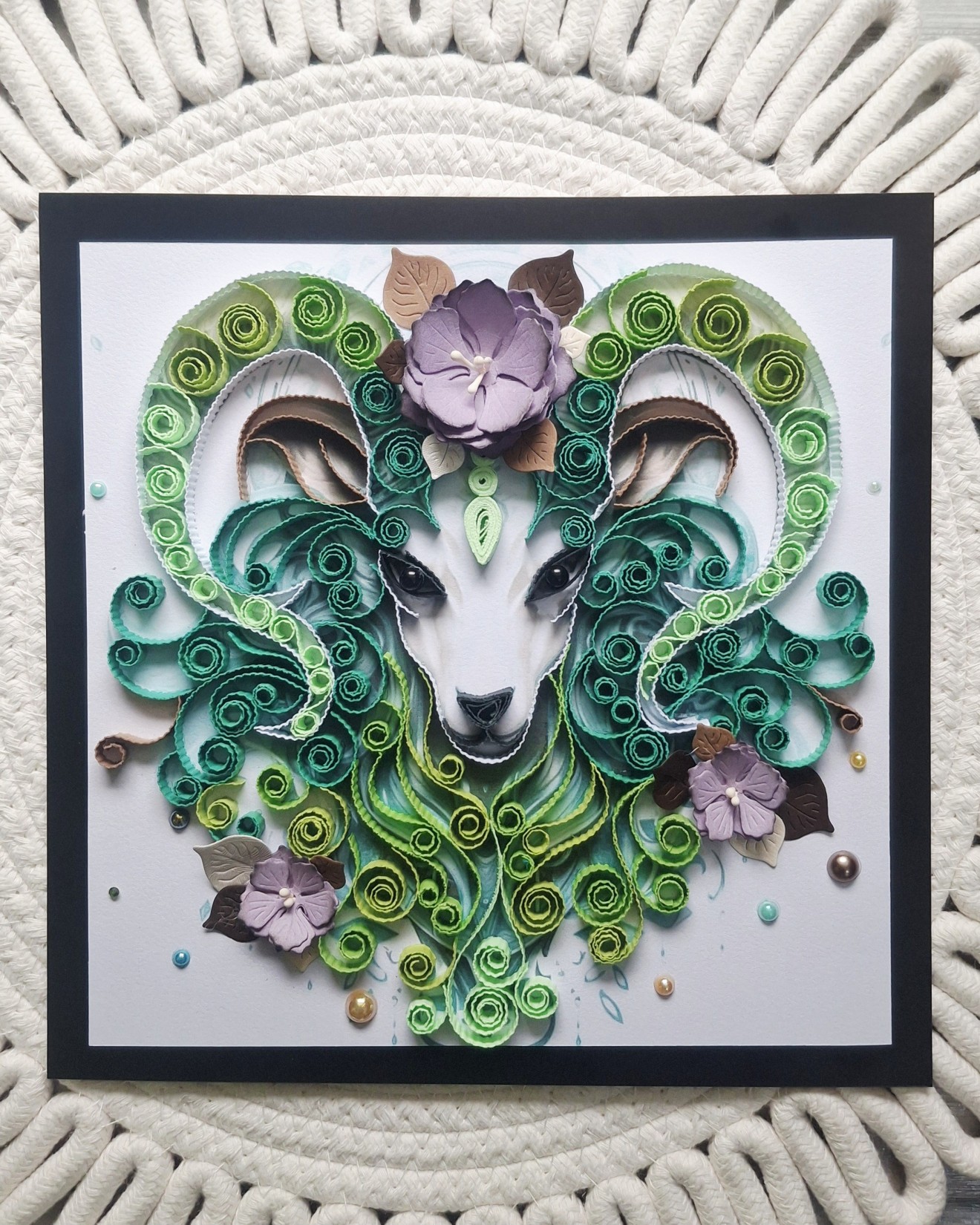 Подарете или украсете с нещо различно - това квилинг пано е специално за зодия Овен! Ръчно изработено с внимание към формата и детайлите. Използвани са зелени нюанси и пищни елементи, за да се подчертае енергията на Овен. Подходящо за подарък или декорация - всяко пано е уникално и няма две еднакви. Размер и цветови акценти могат да бъдат адаптирани според вашето желание. Направете подарък, който съчетава креативност, красота и личен знак за вашия любим Овен!