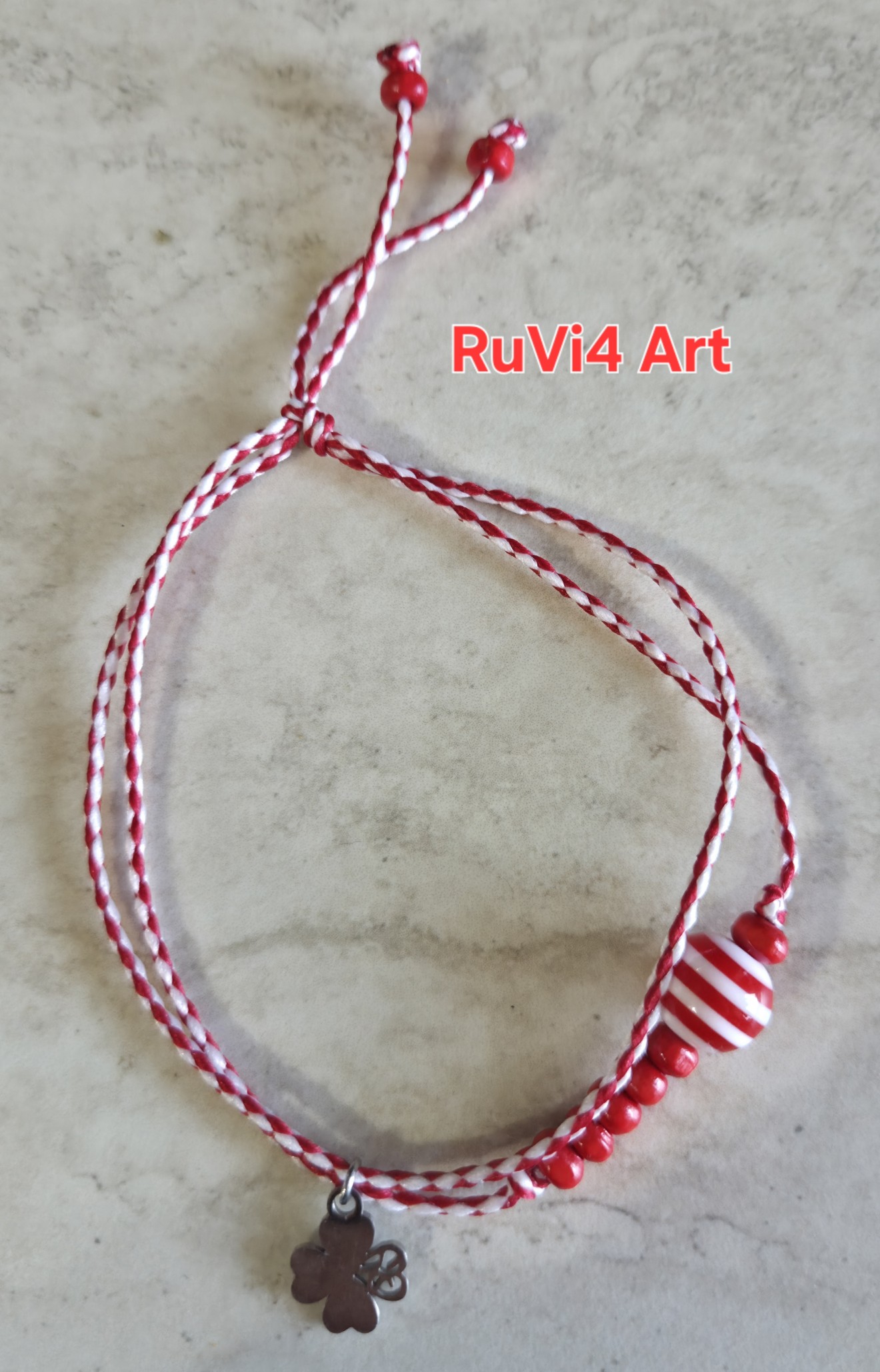 Мартеница, изработена с пластмасови и дървени мъниста, с червено-бял шнур.