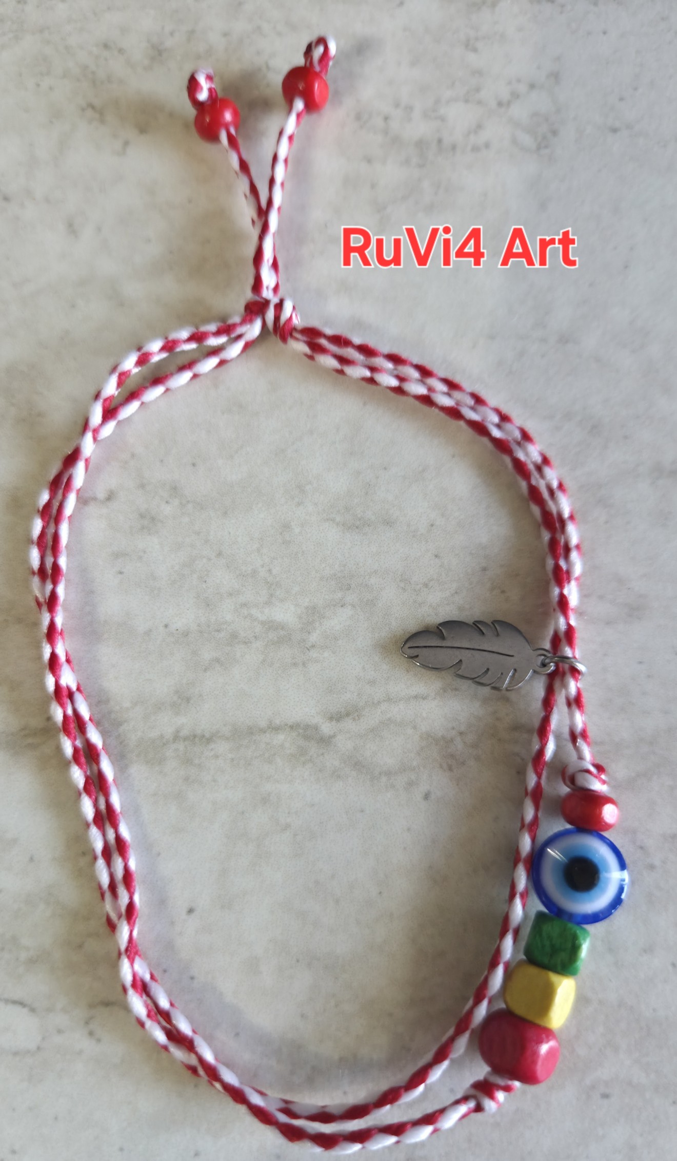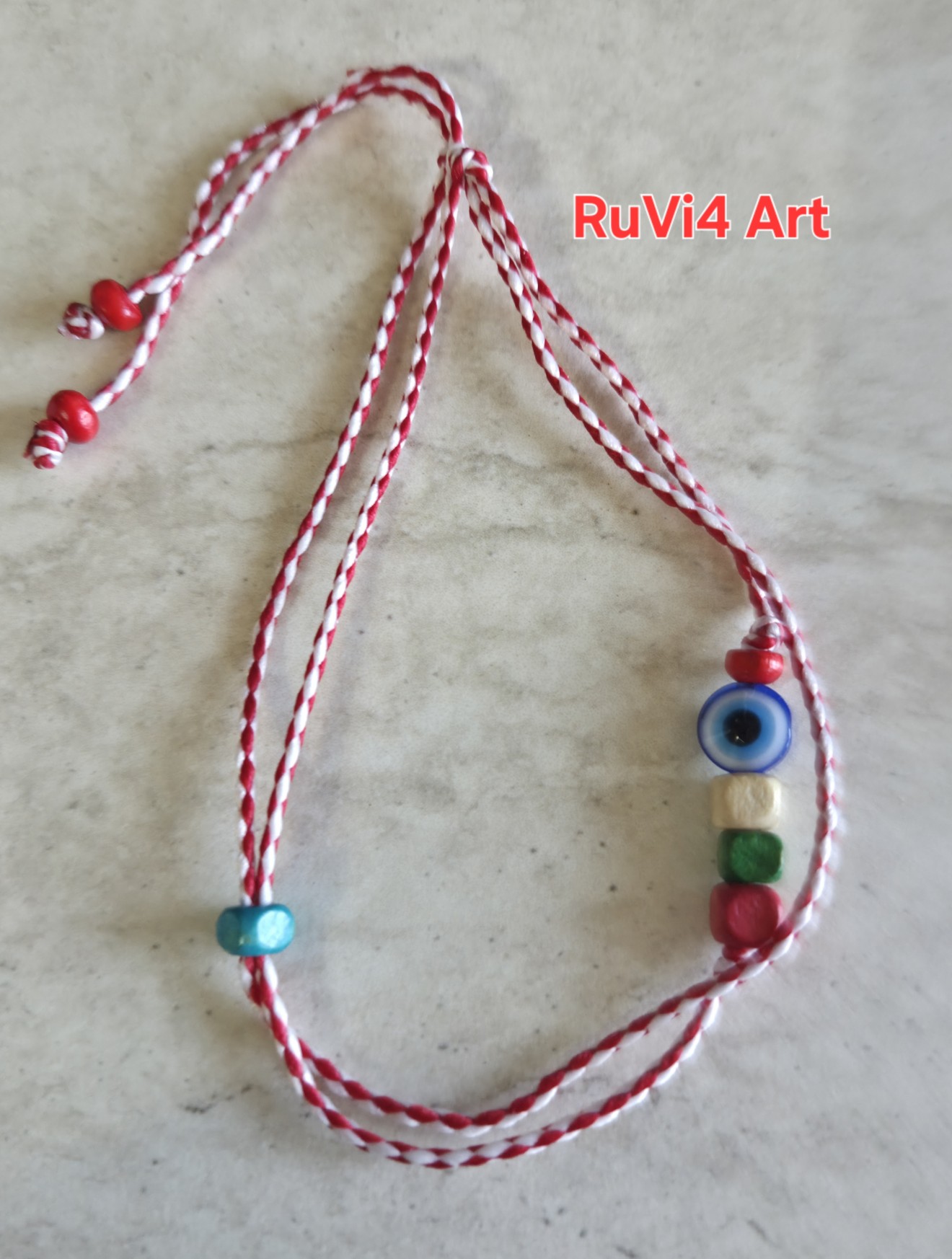 Мартеница, изработена от evil-eye и дървени мъниста, с червено-бял шнур.