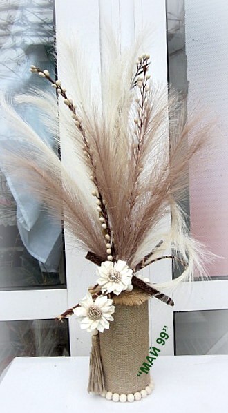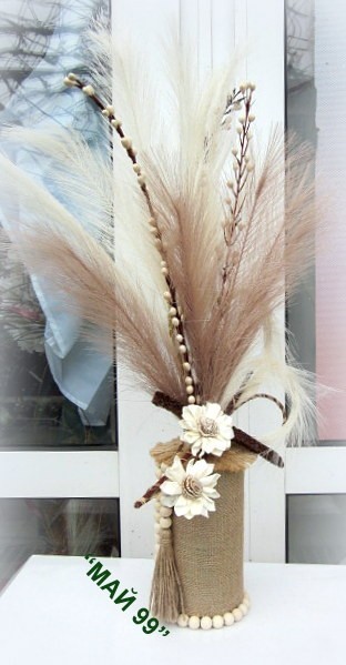 Елегантна ваза обвита в зебло,обиколена с дървени светли мъниста,двуцветна,преливаща ИЗКУСТВЕНА пампаска трева,натурални кафяви клонки и натурални бели цветя и елементи с височина 60 см.