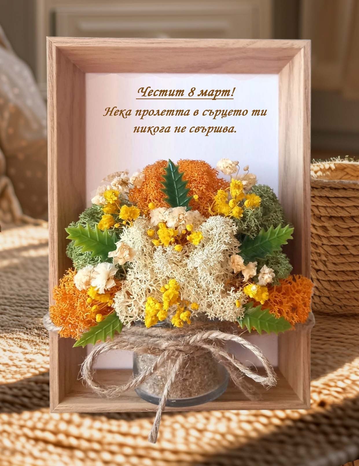 🌹 Идея за стилен подарък за 8-ми март 🌹 Перфектен жест за мама, баба, любима, сестра, приятелка, учителка– подарък, който остава и радва дълго след празника ✨ 🌷 Скандинавски мъх и сухи цветя в бурканче с морски пясък и канап за завършек 🌷 Елегантна рамка и артистична визия 🌷 Надпис по желание – „Честит 8-ми март“, лично послание или име 🌷 Уникален дизайн – всяка бройка е различна 🎁 Вместо букет, който увяхва – подарете спомен 💝 Вместо нещо обикновено – изберете нещо специално
