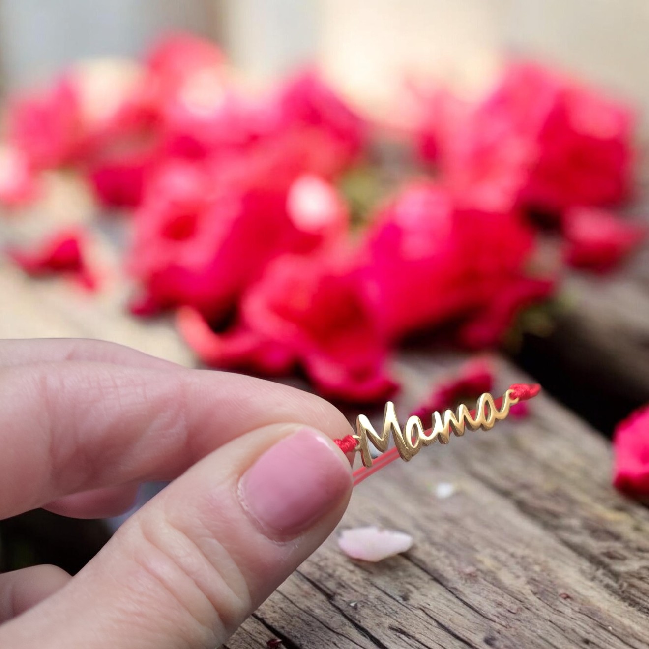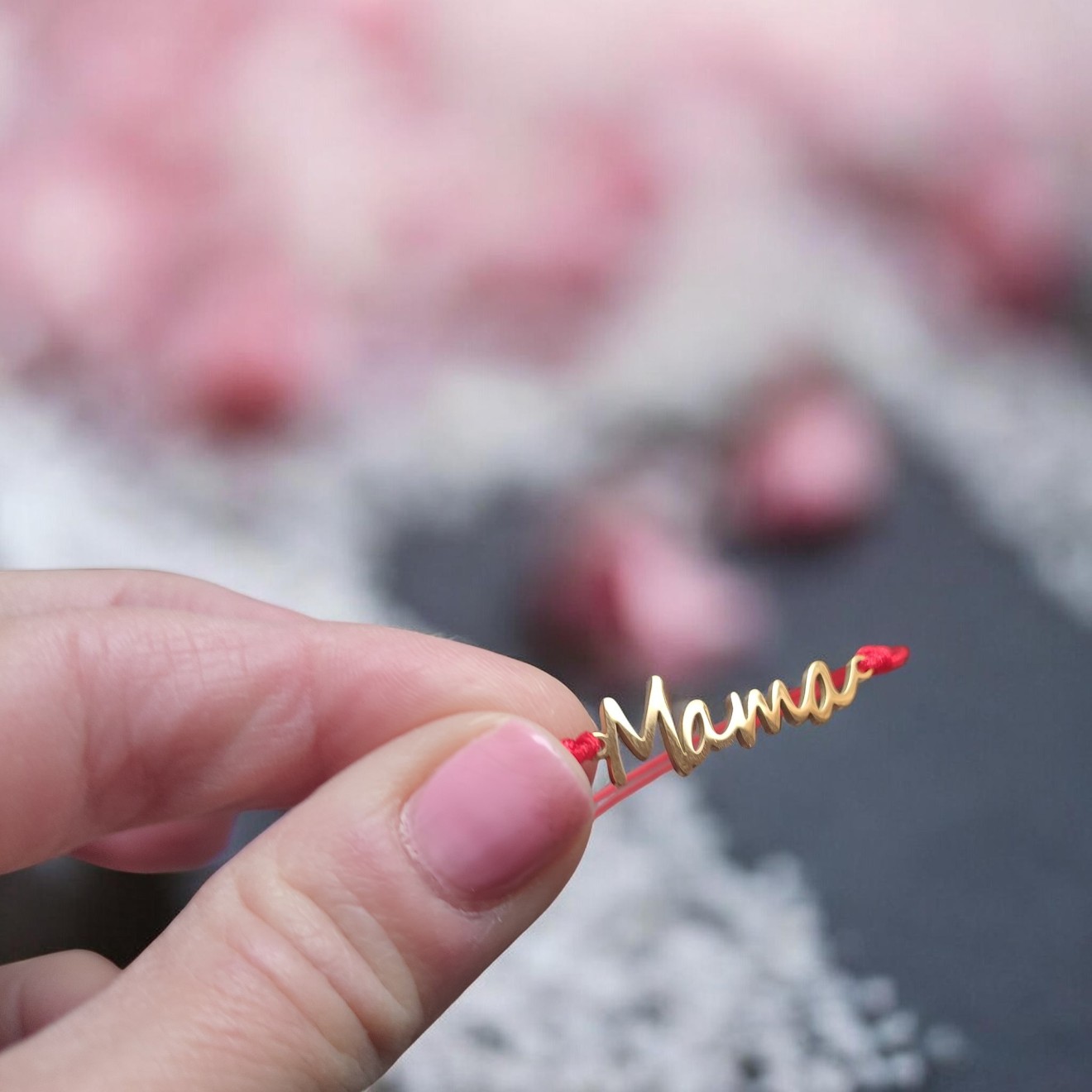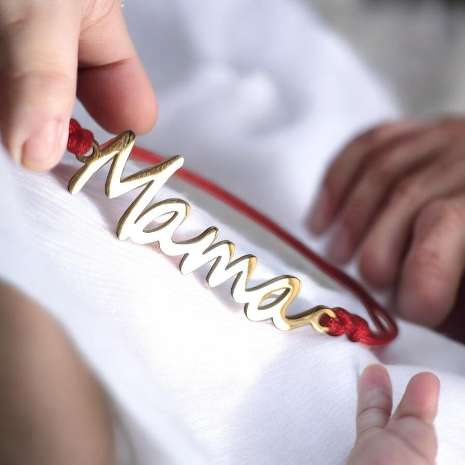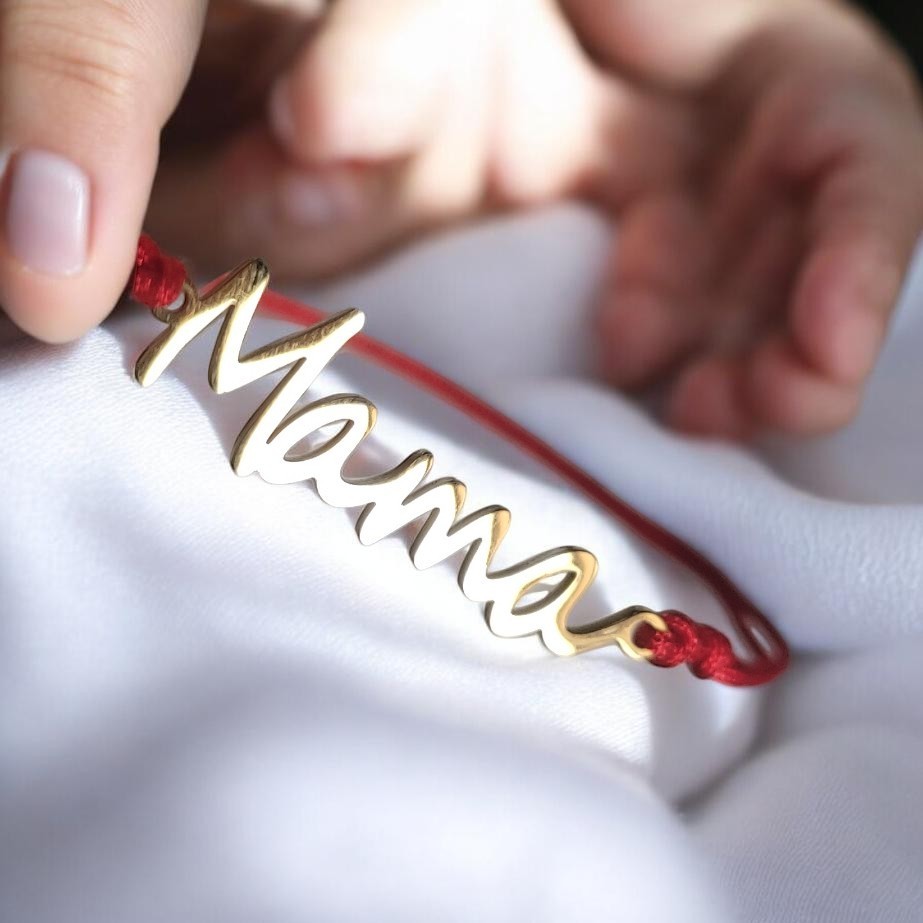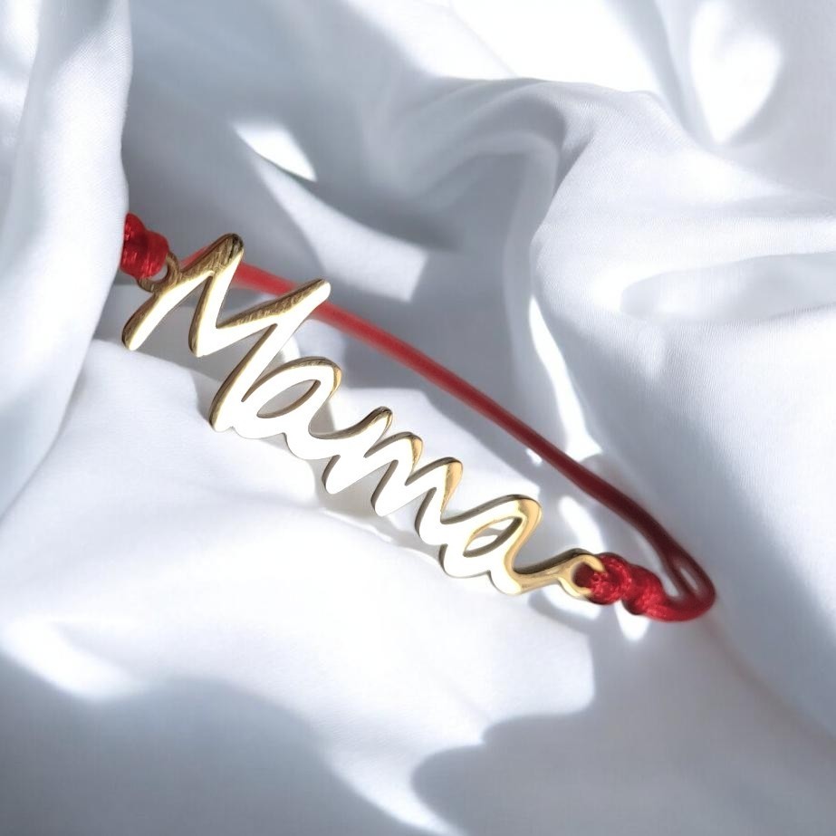 Ръчно изработена гривна с бижутерски шнур и надпис от стомана и златно покритие "МАМА"