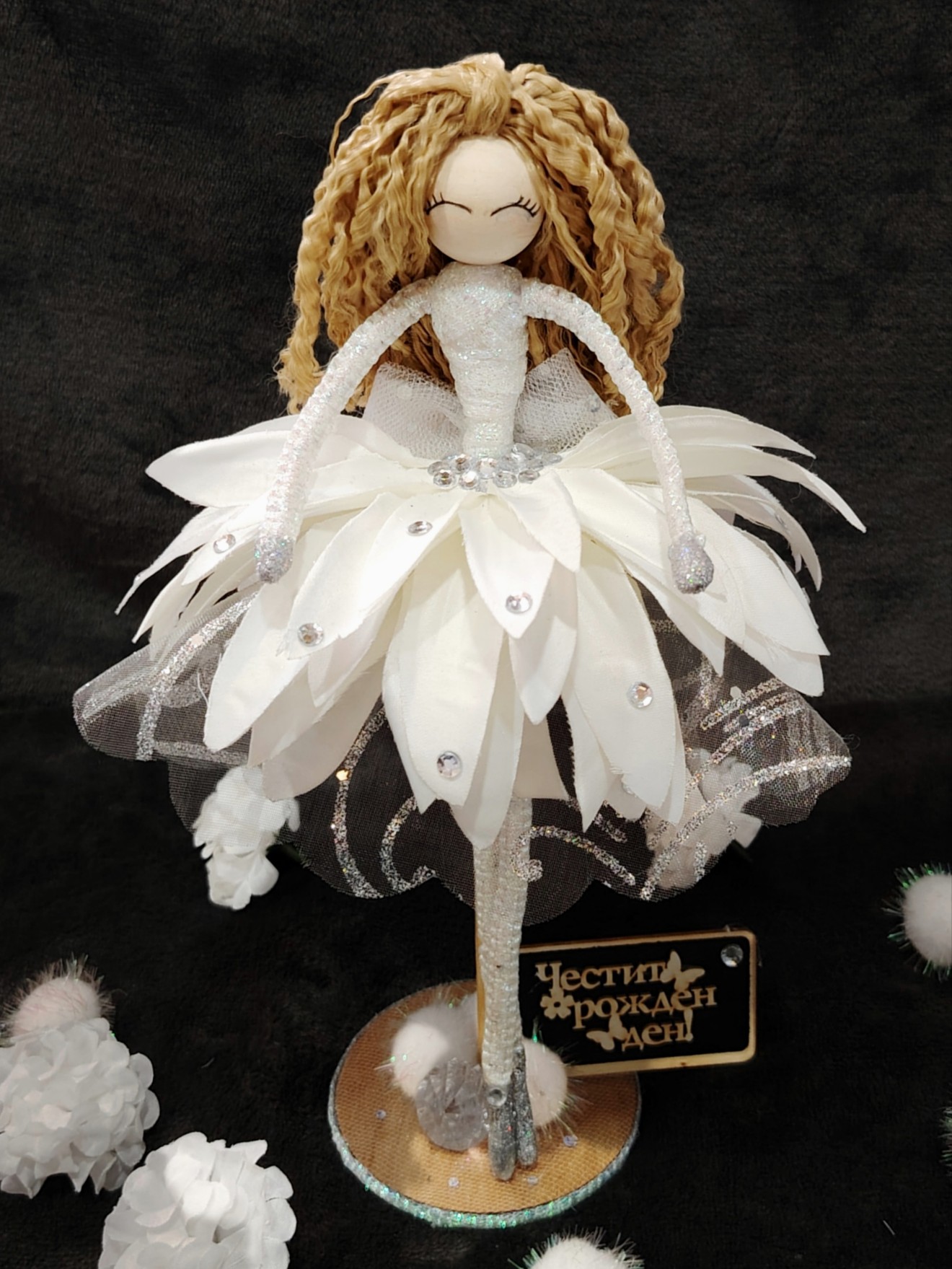✨ Нежност, блясък и усмивка в едно ✨ Тази кукла е създадена, за да носи радост в специалния ден на любим човек. С ефирна рокля , деликатни кристали и сияен завършек, тя е перфектен подарък за рожден ден или специален повод. ✨ Подходяща за подарък за рожден ден, имен ден, юбилей, 8ми март или просто като мил жест към близък човек. Надписа може да бъде персонализиран според повода! Размер - 28см /куклата стои самостоятелно / Цена - 20€ Налична - 1 брой.