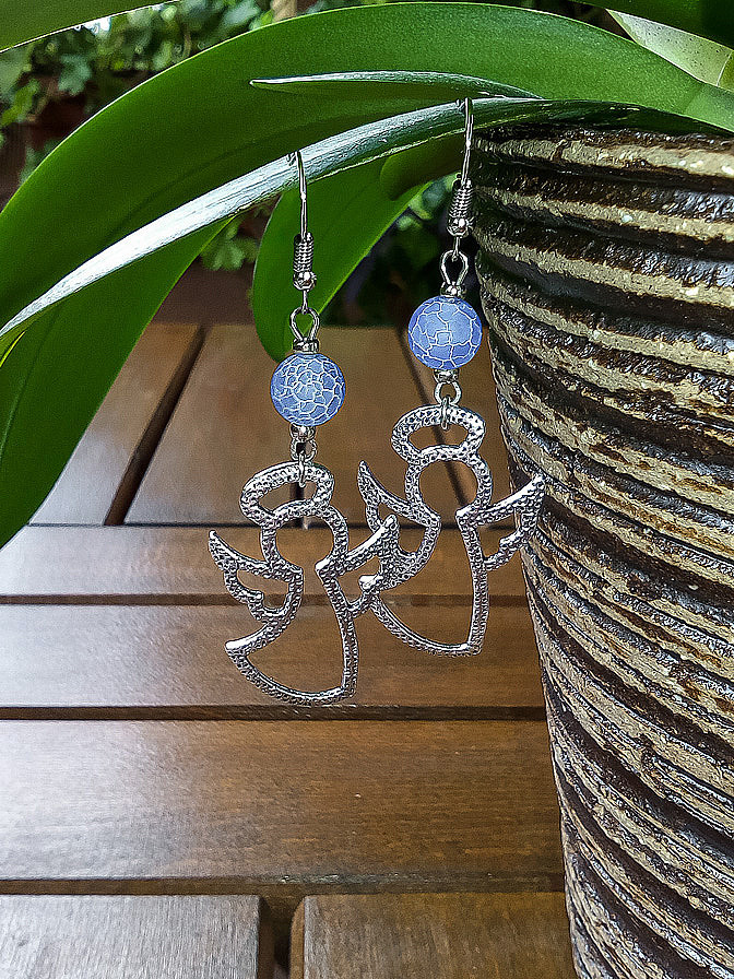 Нежен дамски комплект изработен от бижутерска сплав и полускъпоценни камъни Син напукан ахат - 8 мм Бял кварц - 8 мм Метални елементи - бижутерска сплав (ЦАМ) Цвят - сребро антик Всички части се продават и по отделно Цена Обеци - 7 лв. Цена Гривна - 15 лв.