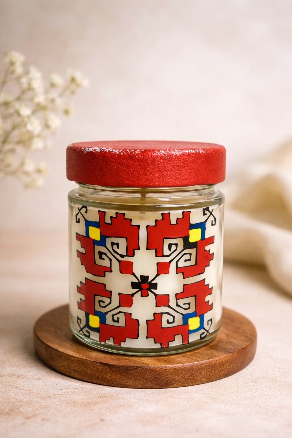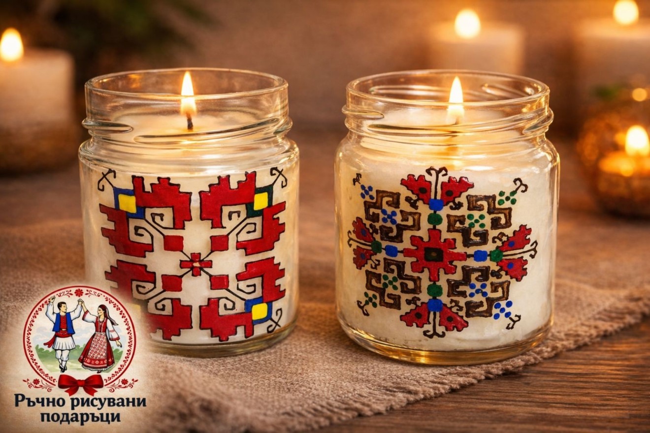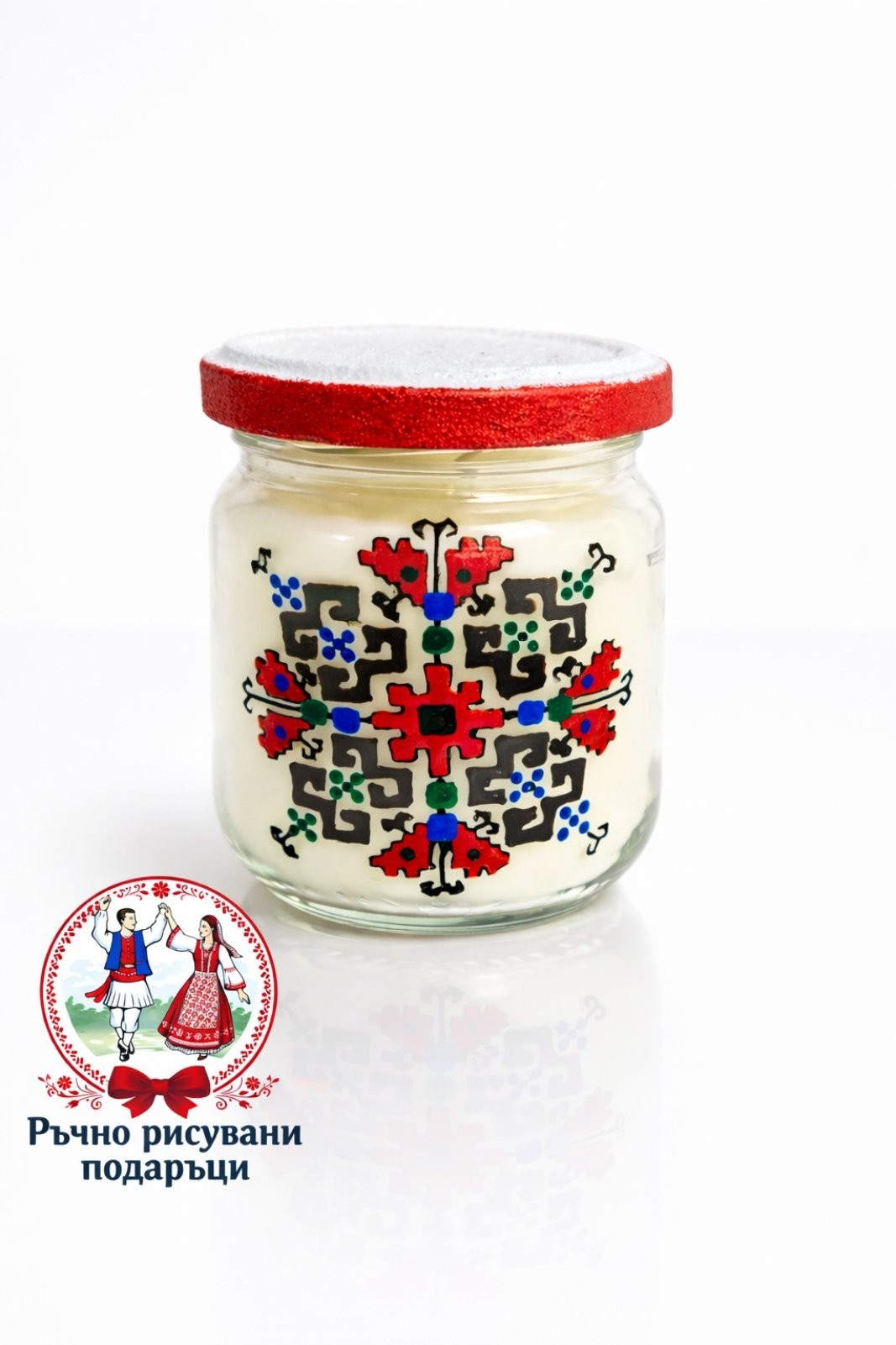 Ароматна свещ в ръчно рисувано бурканче с шевици, изцяло ръчна изработка. В наличност, за гр. Варна е възможно и лично предаване.