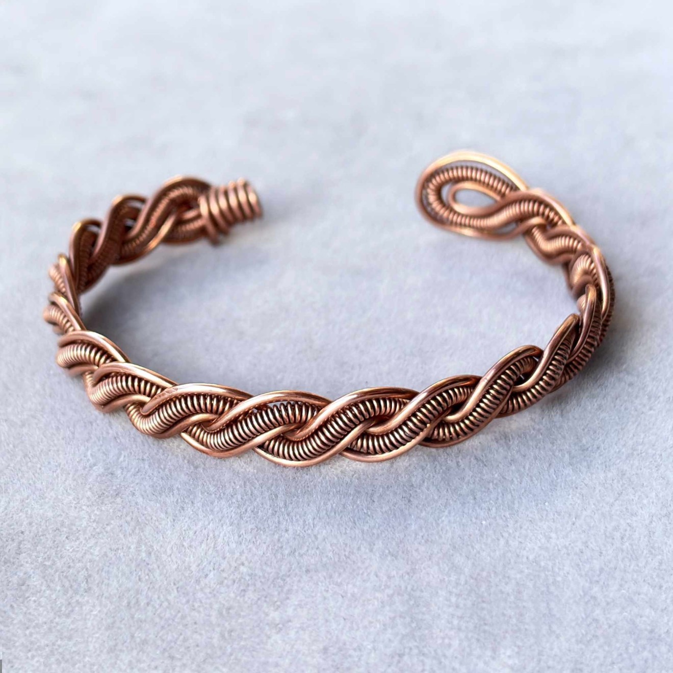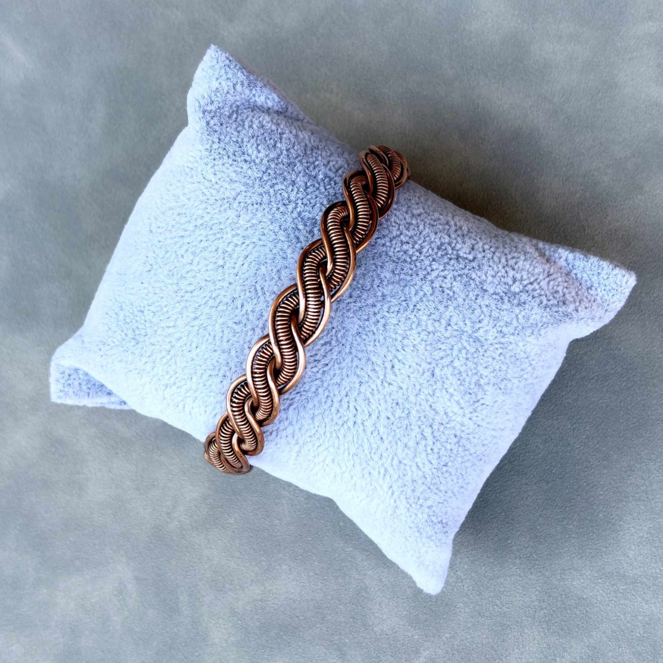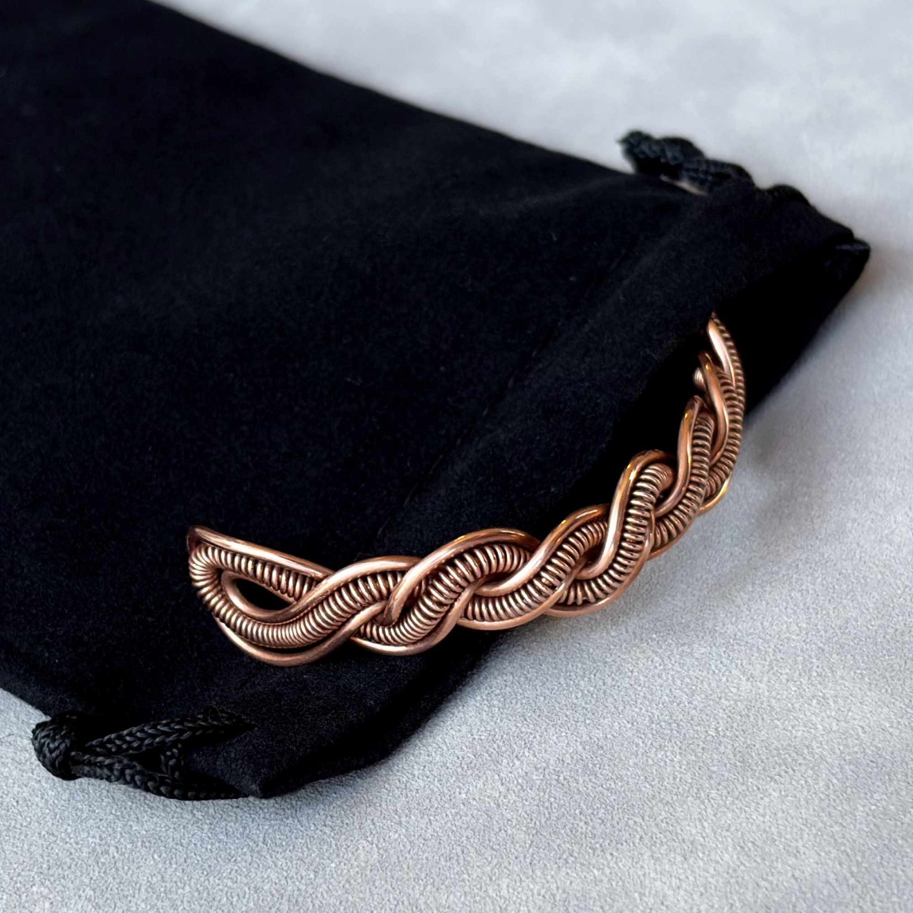 Пренесете се в света на свободния дух с тази уникална плетена гривна, изработена с любов и внимание към детайла. Създадена е изцяло на ръка от рециклирана медна тел, превръщайки устойчивите материали в истинско произведение на изкуството с бохо характер. Полирана, оксидирана и защитена със специална вакса. • Материал: Чиста рециклирана медна тел, която с времето развива красива патина, придавайки още повече характер на бижуто • Размер на елипсата: 6.4 х 5.5 см • Гъвкава конструкция, позволяваща лека регулация за перфектно прилягане Идеален подарък: Гривната може да бъде изпратена в торбичка от зебло, черна велурена торбичка или дори в луксозна кутия за бижута, готова за връчване на любим човек. Перфектен избор за рожден ден, имен ден, юбилей или просто като знак на внимание за ценителките на ръчно изработените бижута.