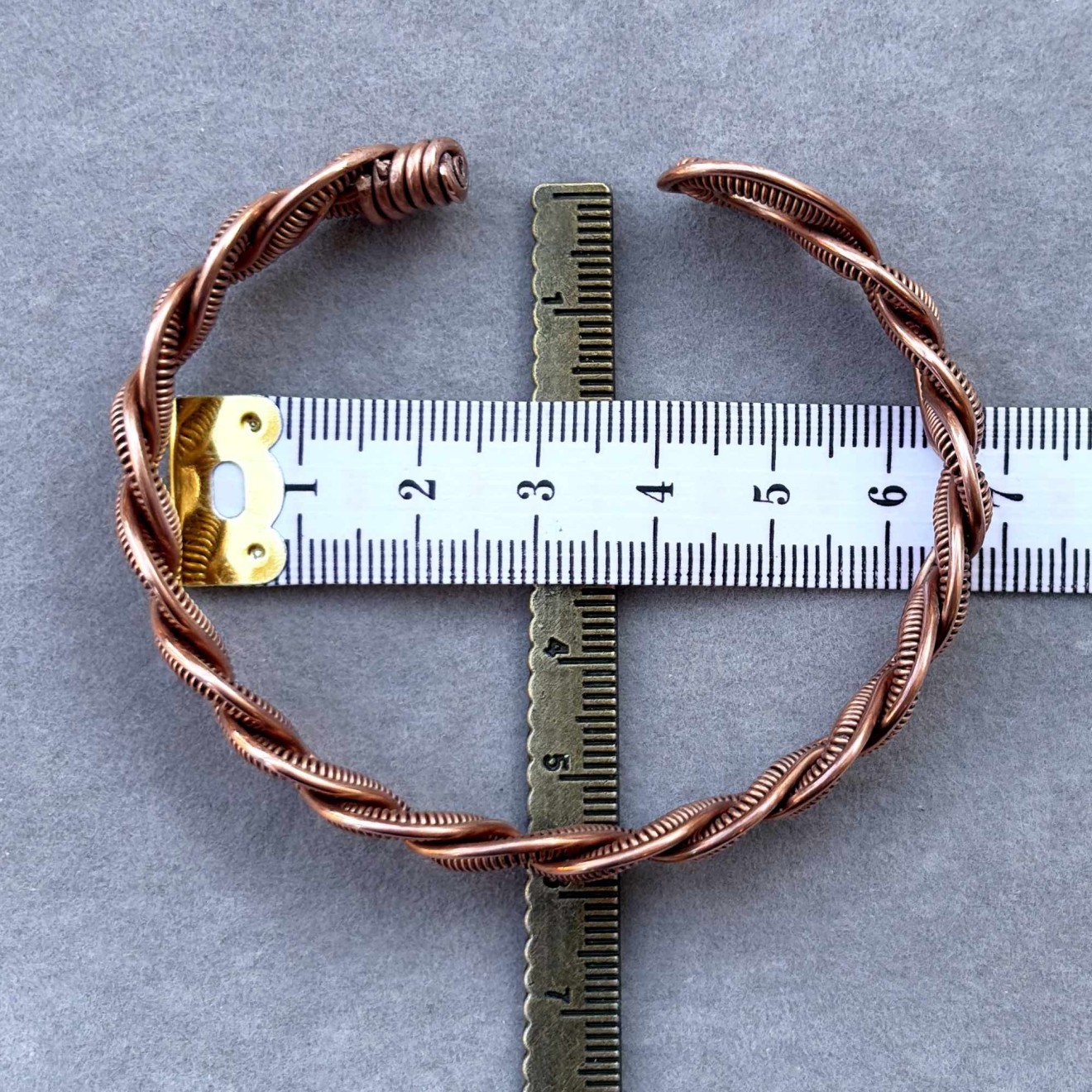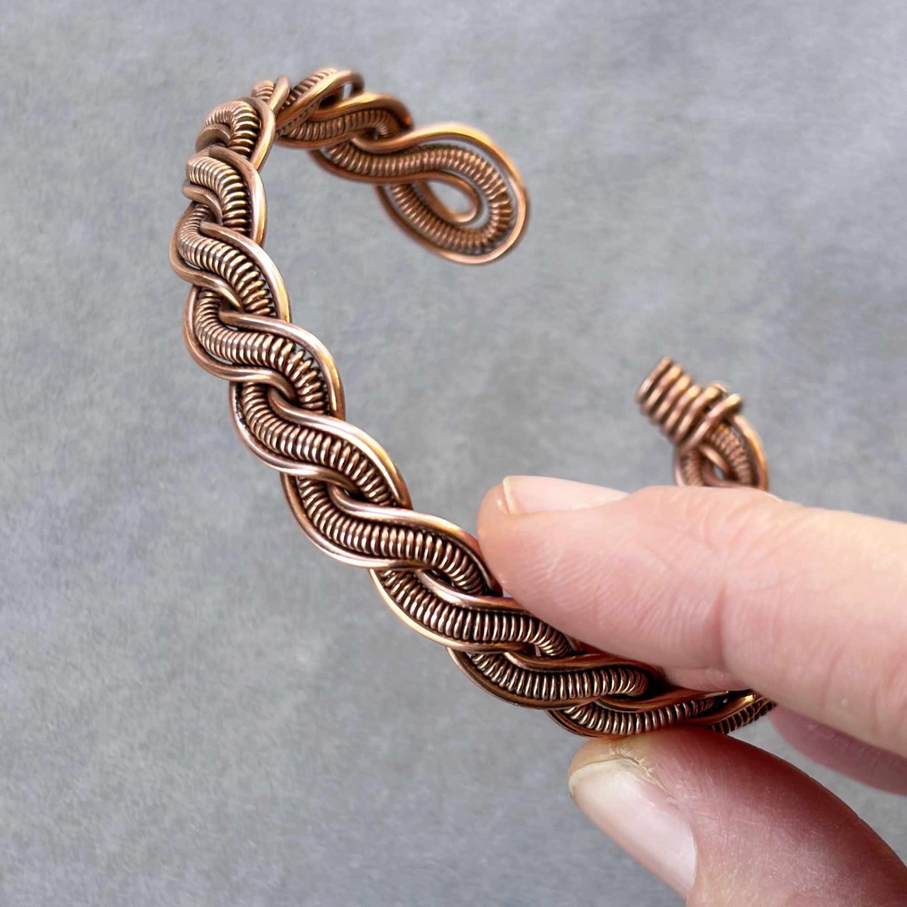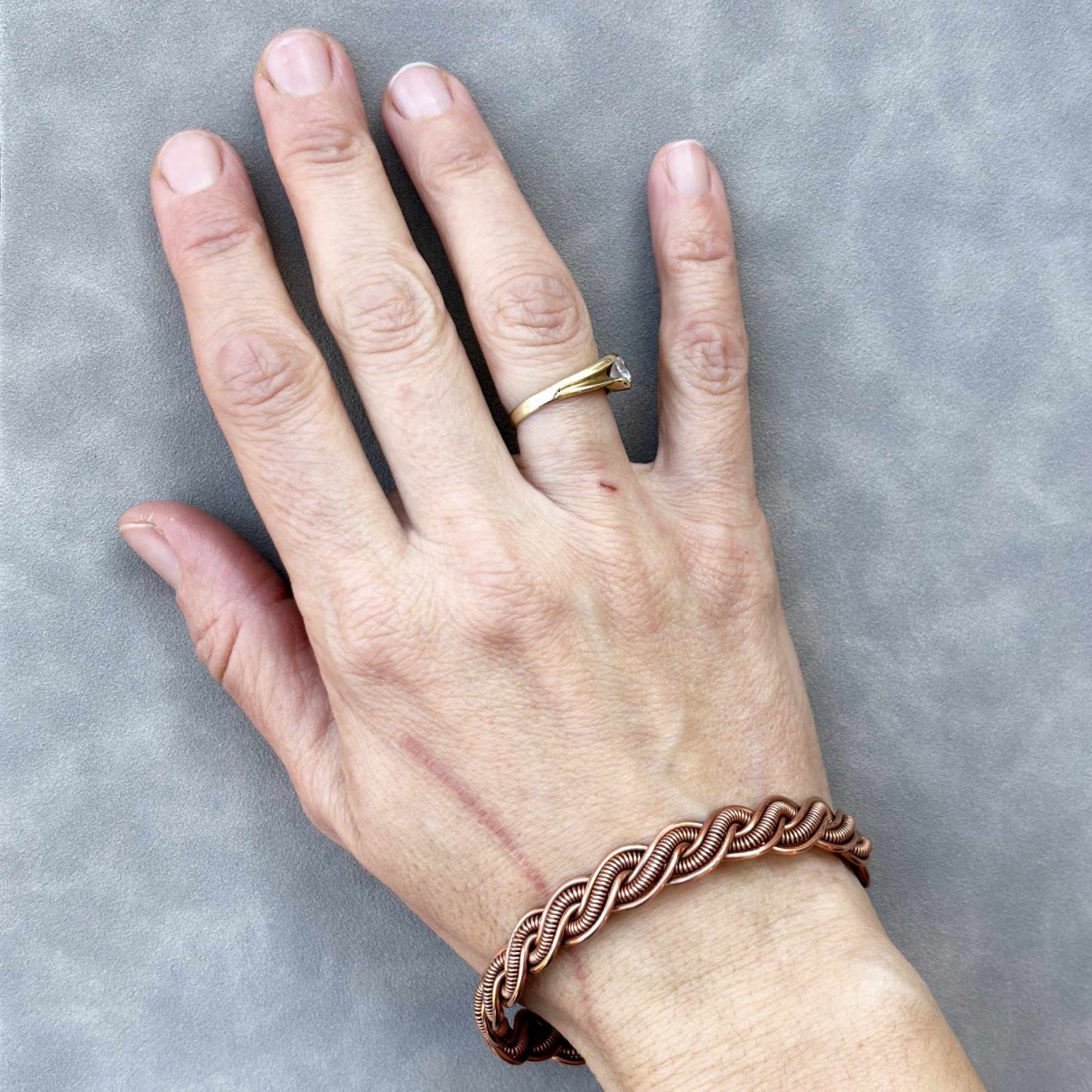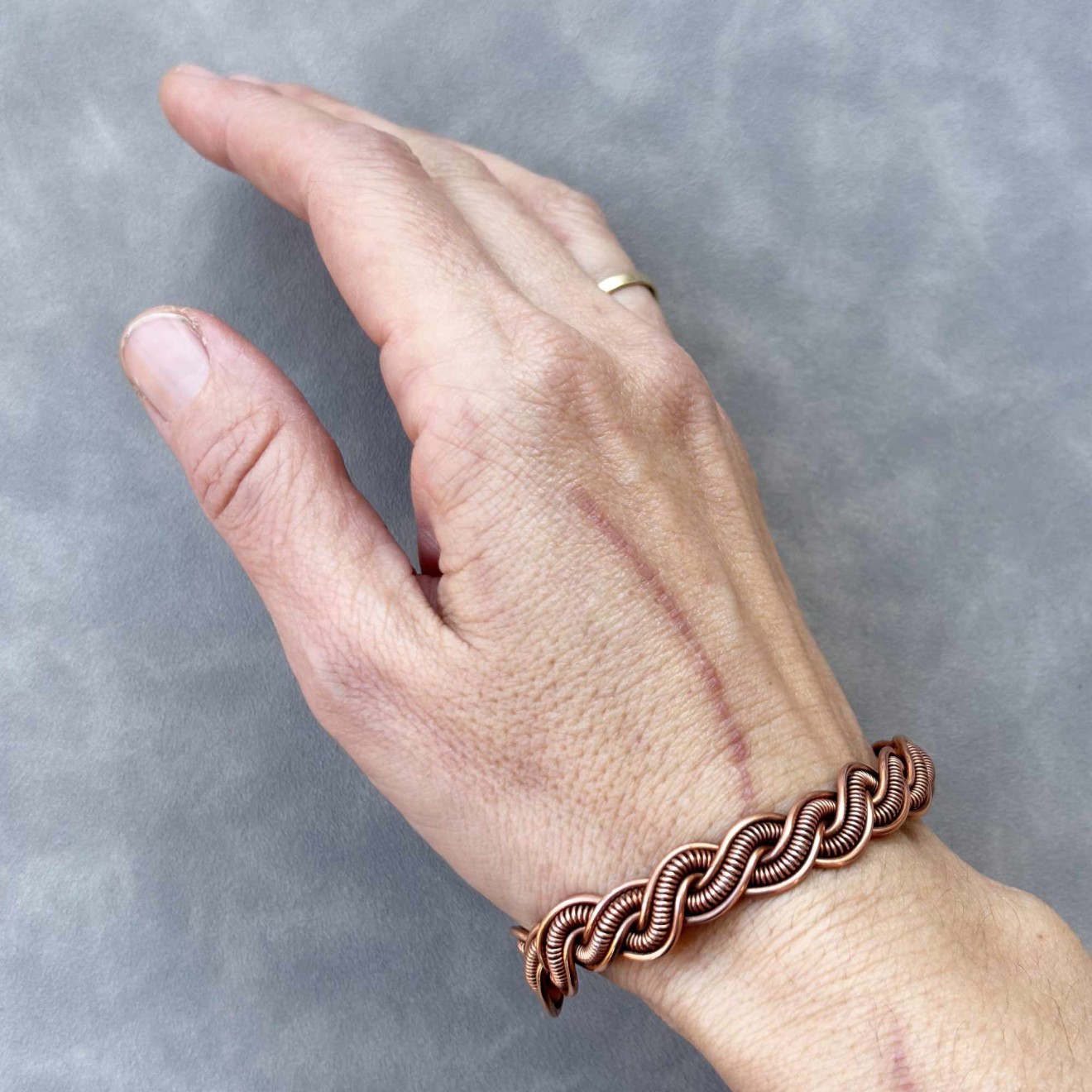 Пренесете се в света на свободния дух с тази уникална плетена гривна, изработена с любов и внимание към детайла. Създадена е изцяло на ръка от рециклирана медна тел, превръщайки устойчивите материали в истинско произведение на изкуството с бохо характер. Полирана, оксидирана и защитена със специална вакса. • Материал: Чиста рециклирана медна тел, която с времето развива красива патина, придавайки още повече характер на бижуто • Размер на елипсата: 6.4 х 5.5 см • Гъвкава конструкция, позволяваща лека регулация за перфектно прилягане Идеален подарък: Гривната може да бъде изпратена в торбичка от зебло, черна велурена торбичка или дори в луксозна кутия за бижута, готова за връчване на любим човек. Перфектен избор за рожден ден, имен ден, юбилей или просто като знак на внимание за ценителките на ръчно изработените бижута.