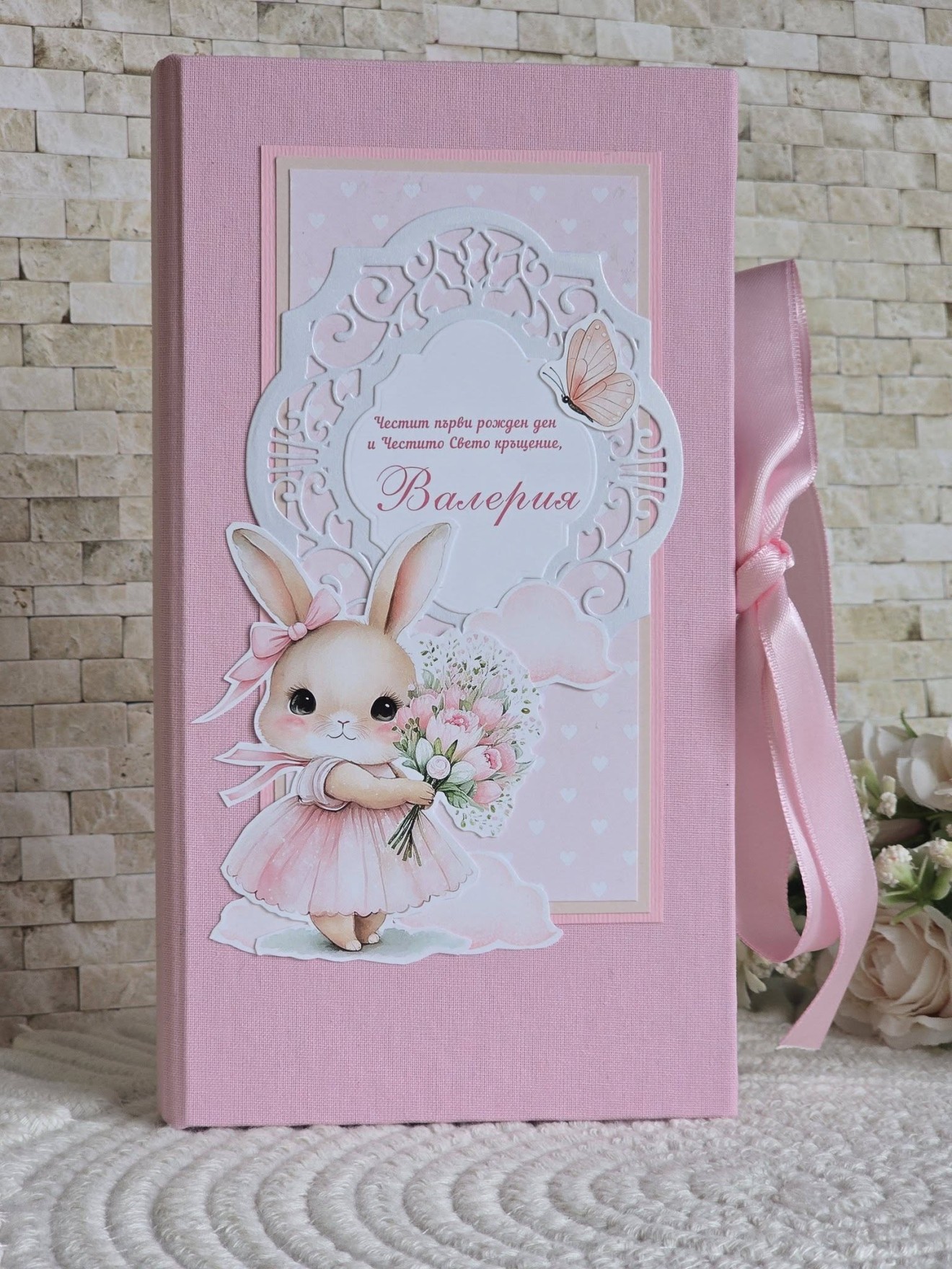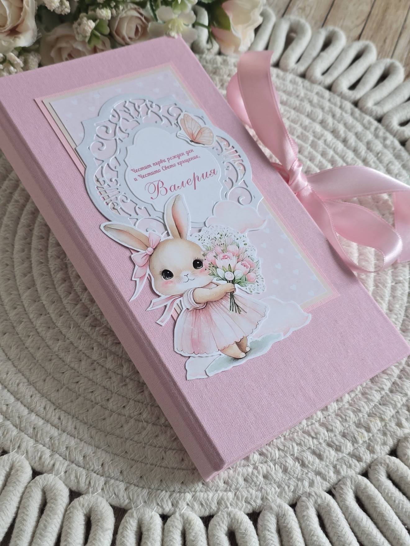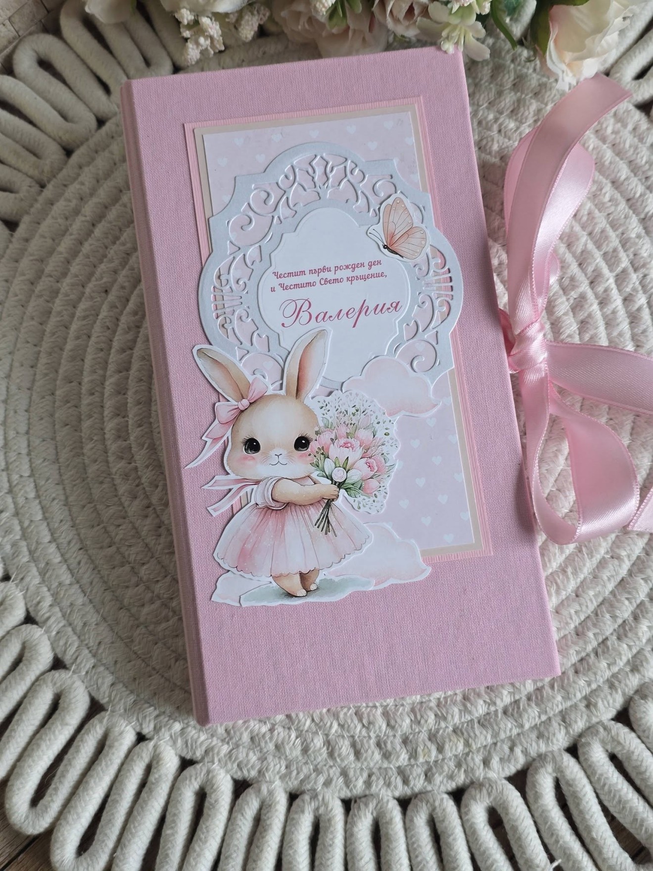 Поздравителна картичка за Свето Кръщение и Първи рожден ден 🌸 Картичка-Папка с размер 21/11см Корици облечени в плат- книговезко платно в пастелно розово Нежен акцент зайче, пеперуди. С включено пожелание С място за паричен подарък или ваучер #craftstudiog #картичка #Свето #Кръщение #първирожденден #Поздравителна #персонализиране #зайче #ръчнаизработка #ръчноизработеникартички