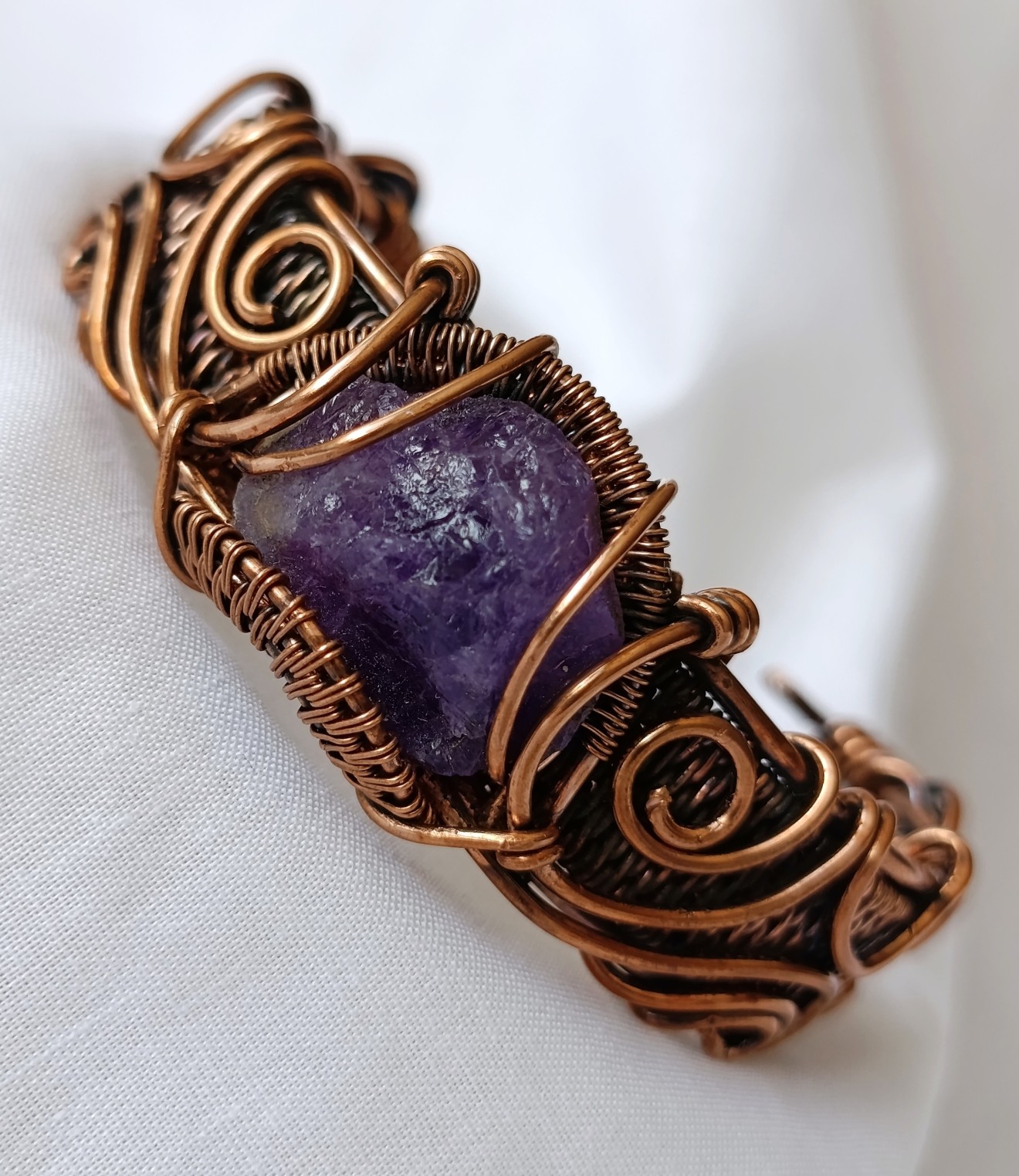 Тази гривна не може да бъде пресъздадена, което я превръща в уникална и единствена, точно както са всички хора, приличаме си, но сме изключително различни ♥️ Гривната е изработена от медна тел в съчетание с необработено парченце аметист. Оплетена, патинирана и полирана, изключително здрава и стабилна с възможност за регулиране по китката. ✨ Подходяща е за китка с диапазон на размера от 16-18см. 🌿 Ако имате нужда от повече информация или желаете да поръчате може да се свържете с мен тук или във фейсбук страницата ми Tale Trinkets, като ми пишете ☀️♥️🪻