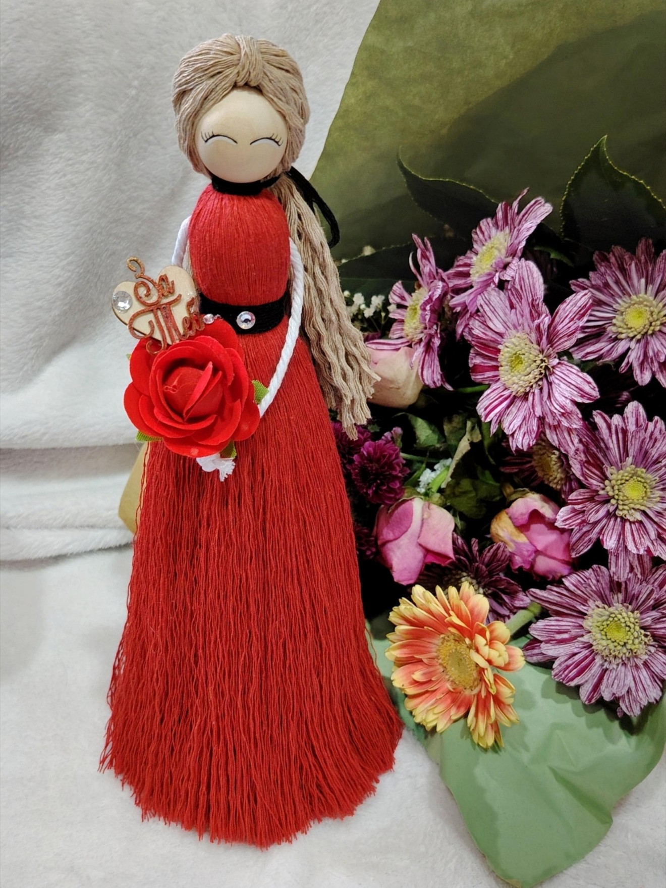 🌹 Прекрасно допълнение към един красив букет, защото никоя жена не е твърде голяма за една кукла ❤️ Тя носи усещане за нежност, уют и малко вълшебство – точно като усмивката на човека, за когото е предназначена. Подарък, който носи настроение, топлина и остава мил спомен дълго време. ✨Подходяща за рожден ден, имен ден, празник или просто като мил жест към любима жена. ✨ Ръчна изработка 🎁 Оригинална идея за подарък Размер - 28см /куклата стои самостоятелно / Цена - 19.50€