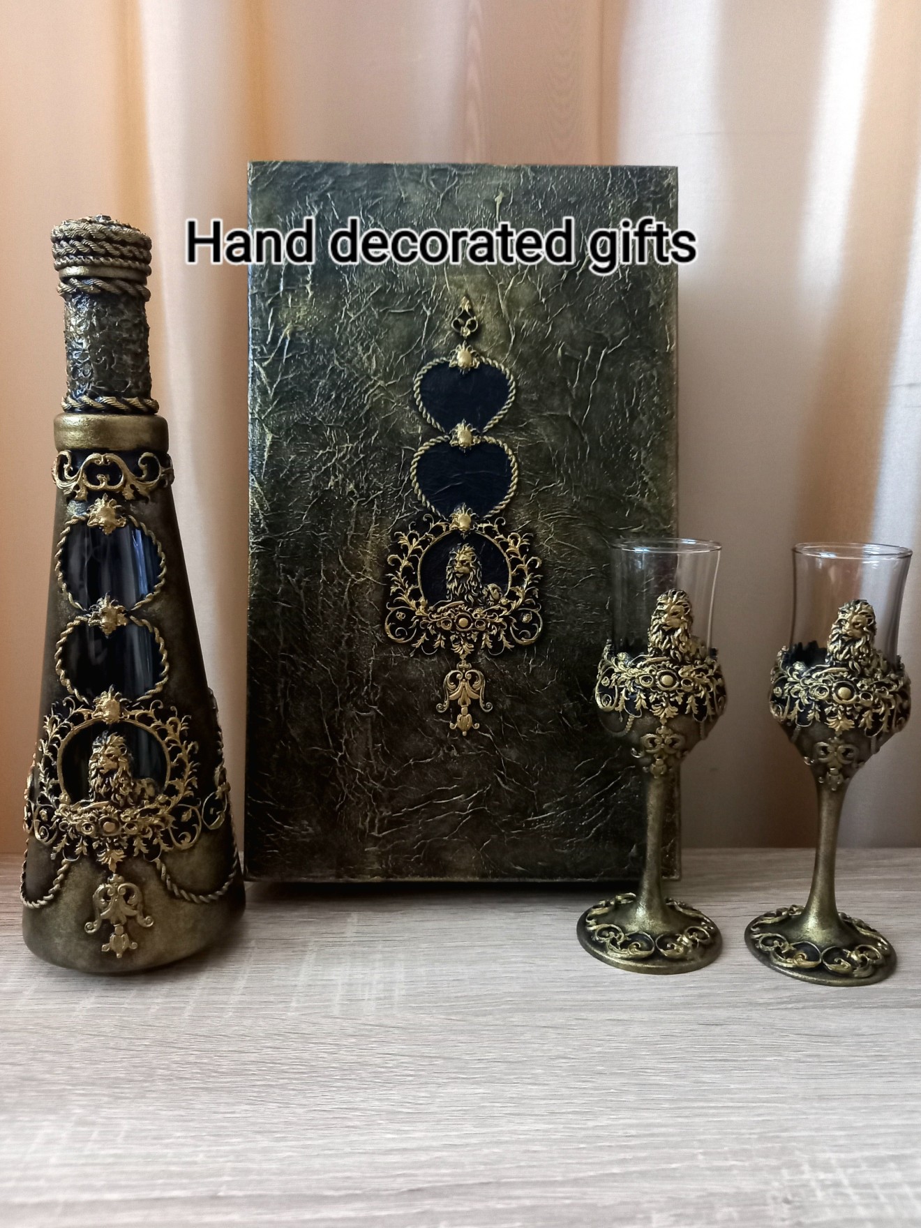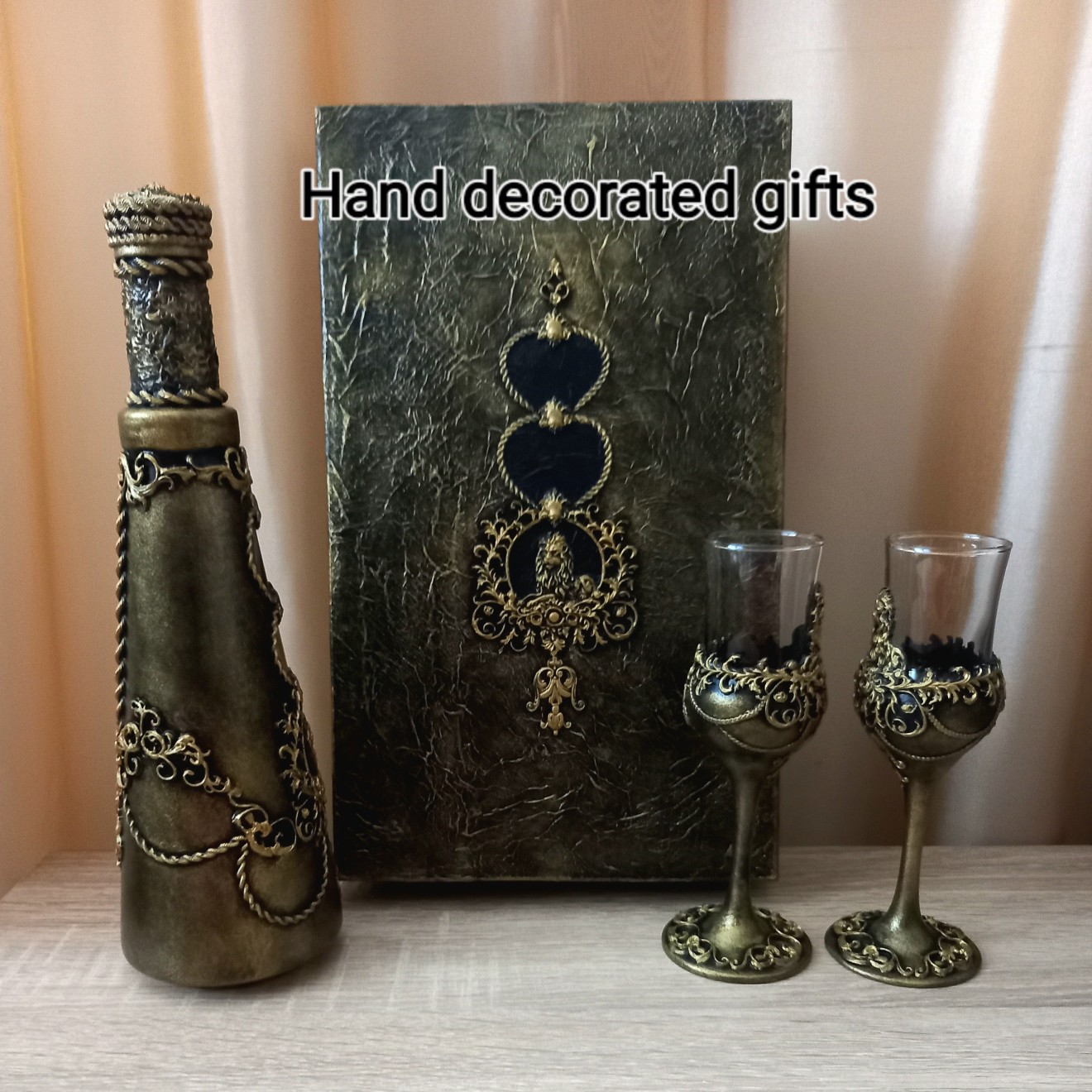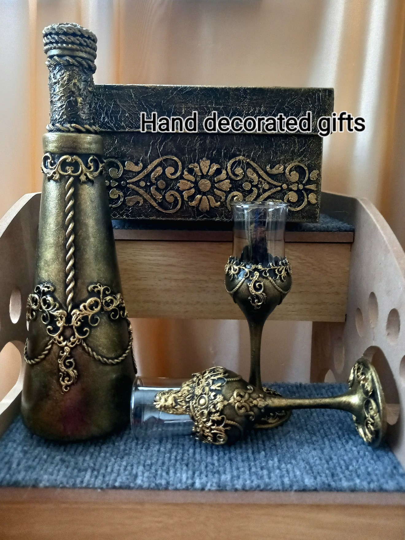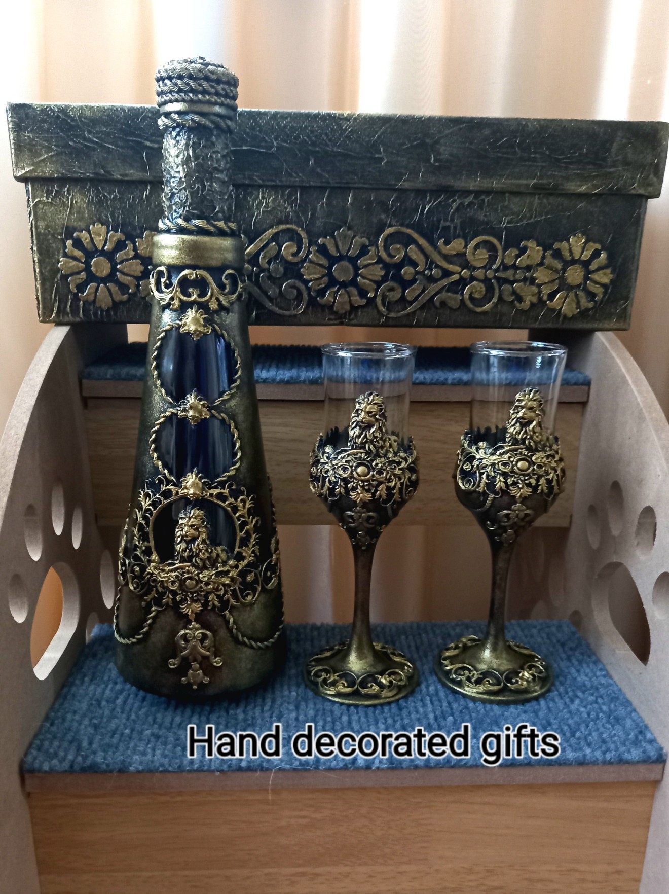 Комплект от бутилка с две чаши в декорирана кутия. Използвала съм бои за стъкло и други материали.Препоръчвам само ръчно миене с хладка вода на чашите и почистване с влажна кърпа на кутията.