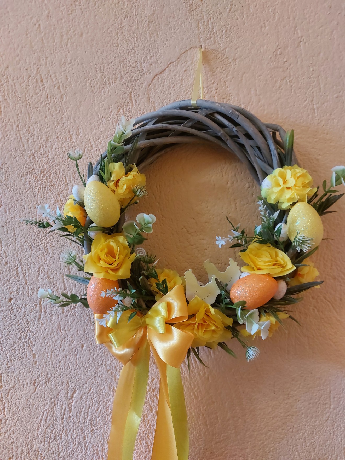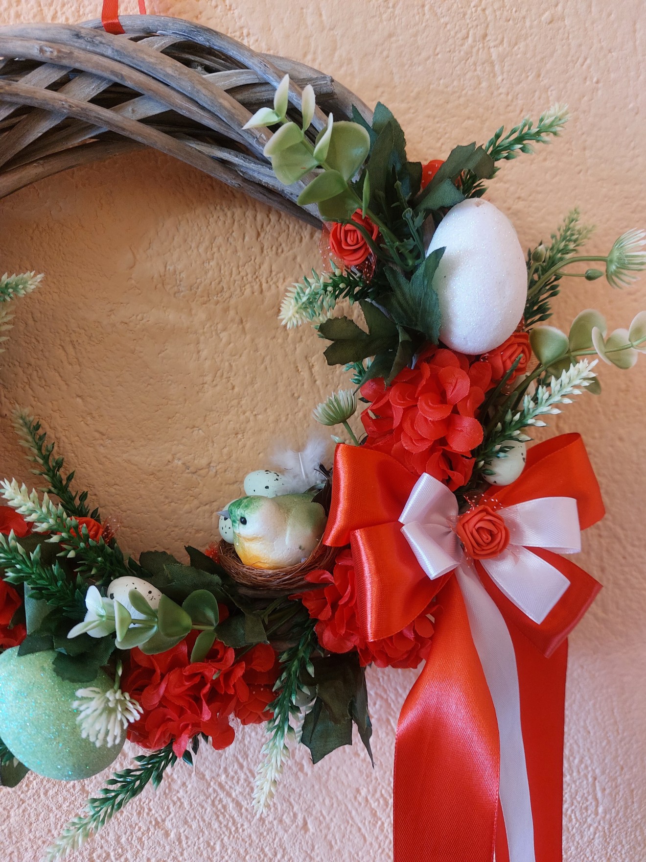 Ръчно изработен ратанов великденски венец с цветя и яйца в жълто, червено и синьо