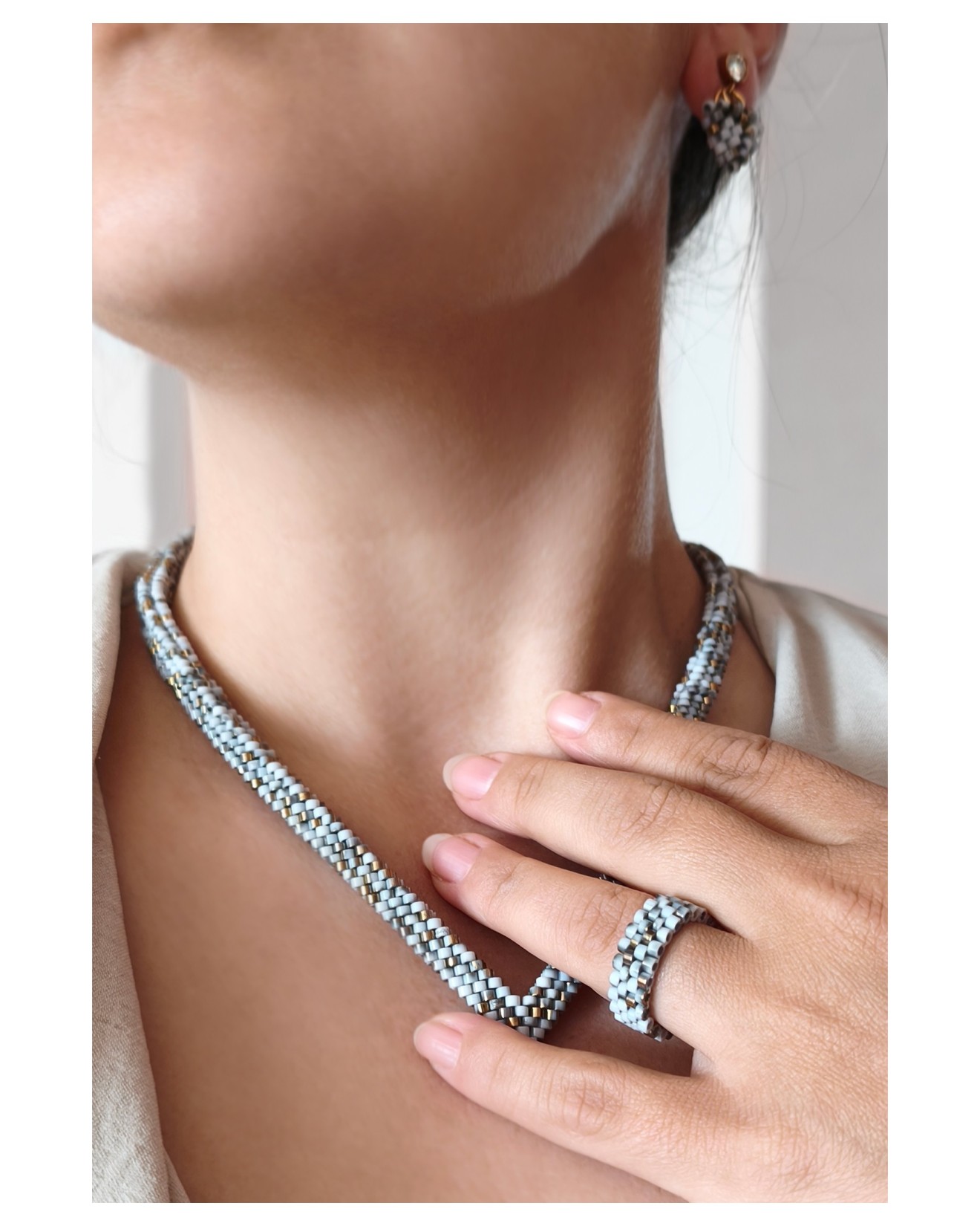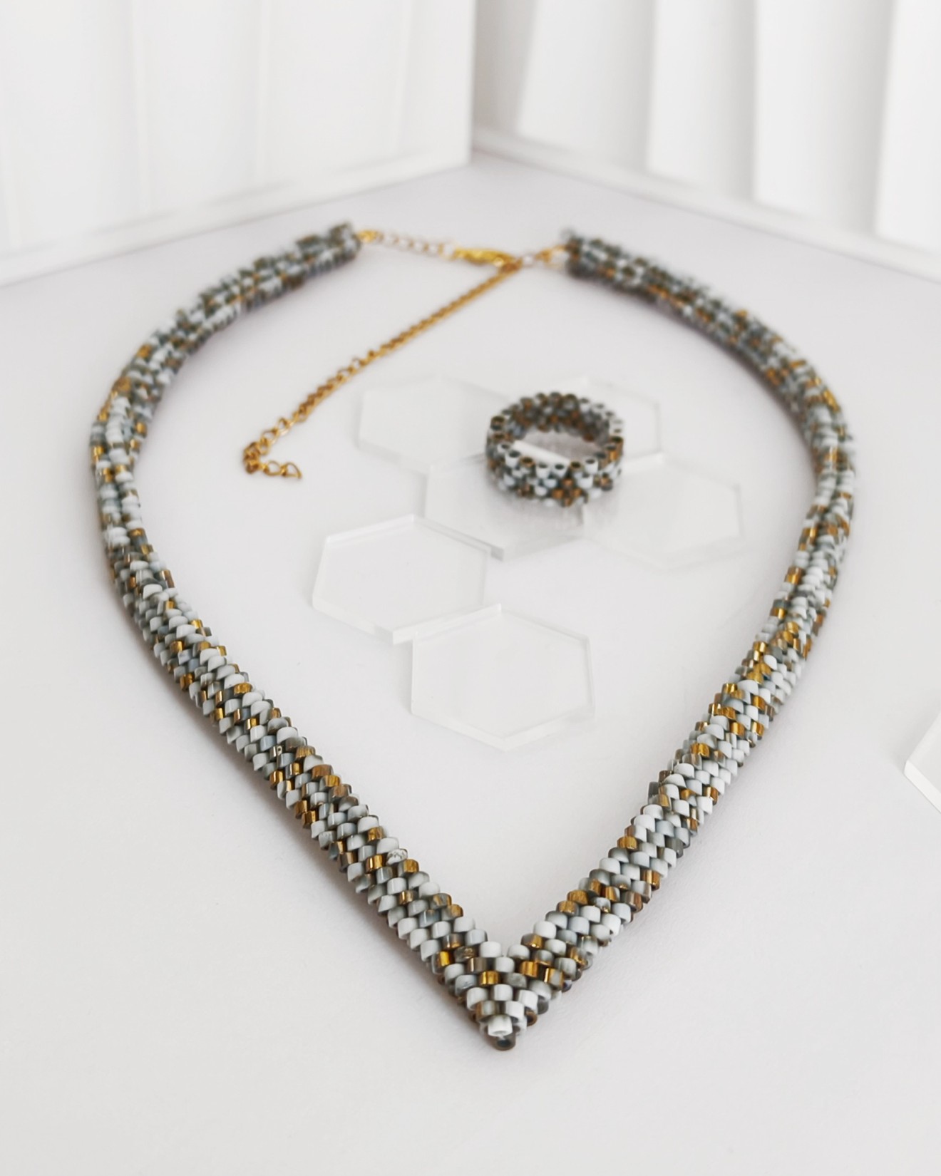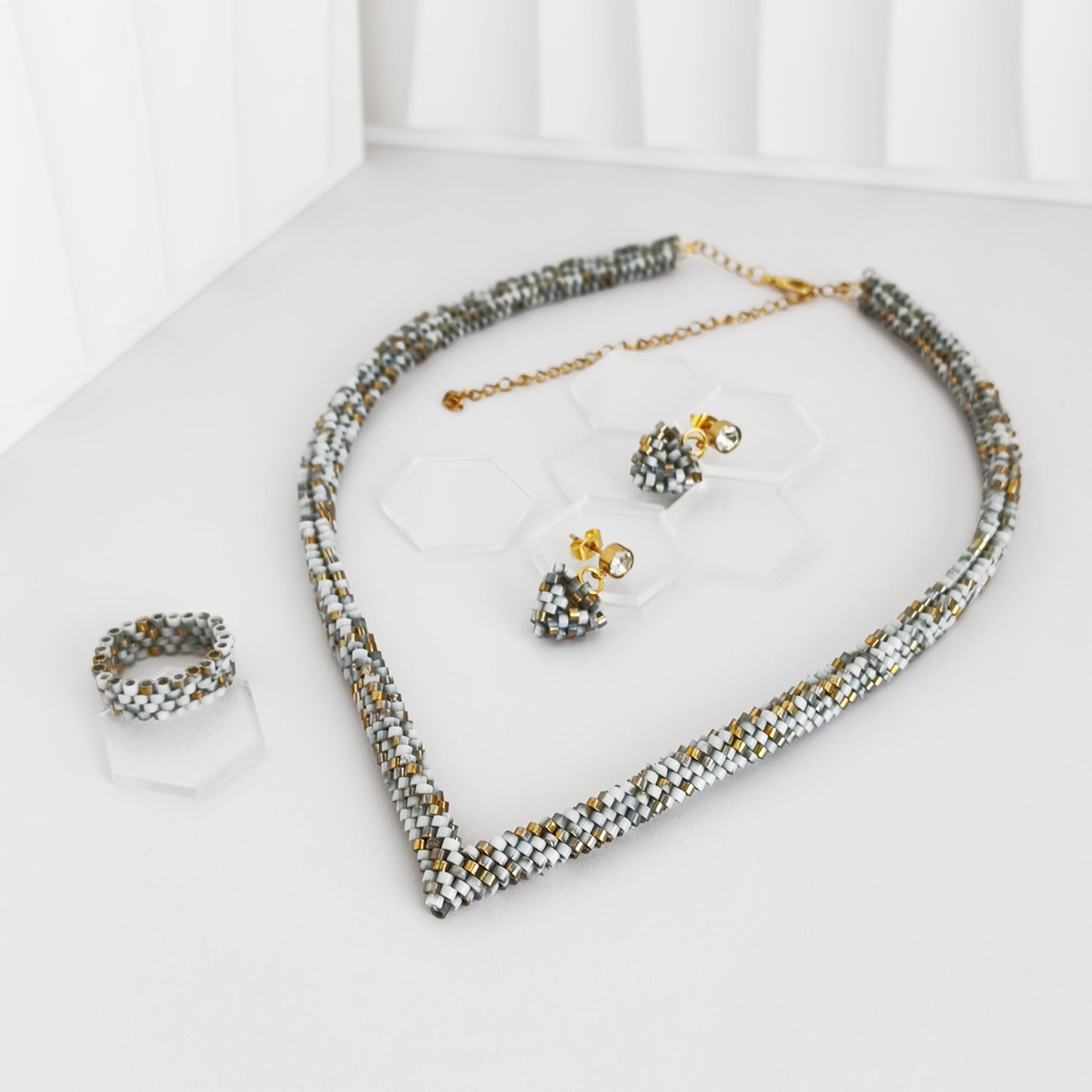 - Мъниста: Бели със златисти и сиви акценти - Дължина на колието: 45 см + 10 см верижка - Широчина на колието: 1 см - Обеци: 2.5 см х 1.5 см х 5 мм - Пръстен: вътрешен диаметър 1.7 см - Плетено на ръка Можете да разгледате и други модели във - Фейсбук: collier.jewelry.j.j - Инстаграм: collier.j.j