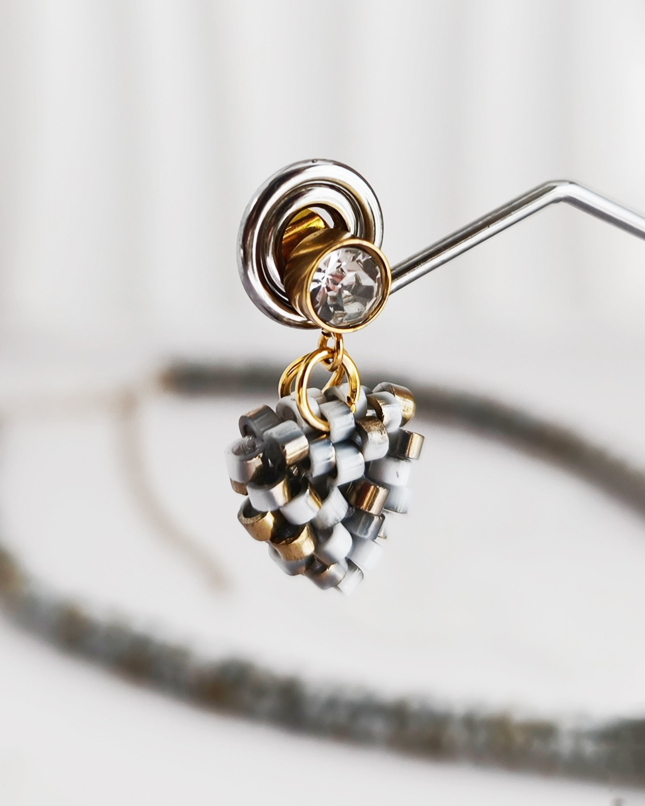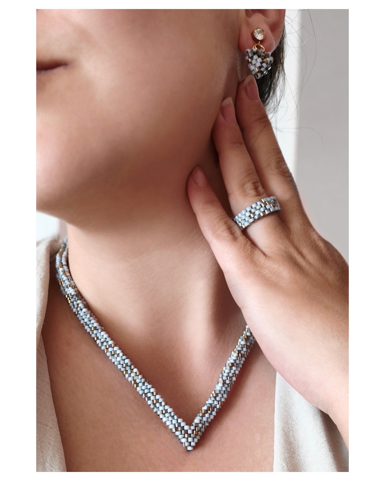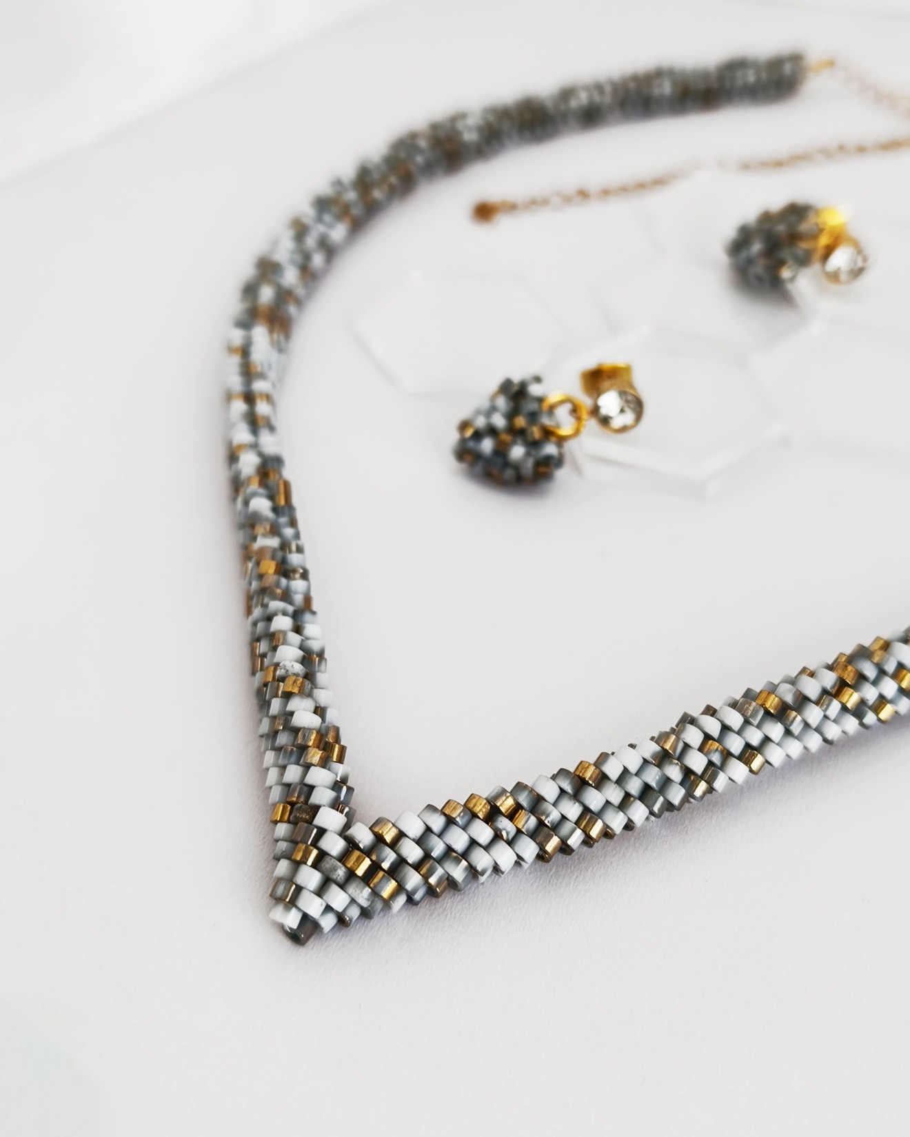 - Мъниста: Бели със златисти и сиви акценти - Дължина на колието: 45 см + 10 см верижка - Широчина на колието: 1 см - Обеци: 2.5 см х 1.5 см х 5 мм - Пръстен: вътрешен диаметър 1.7 см - Плетено на ръка Можете да разгледате и други модели във - Фейсбук: collier.jewelry.j.j - Инстаграм: collier.j.j