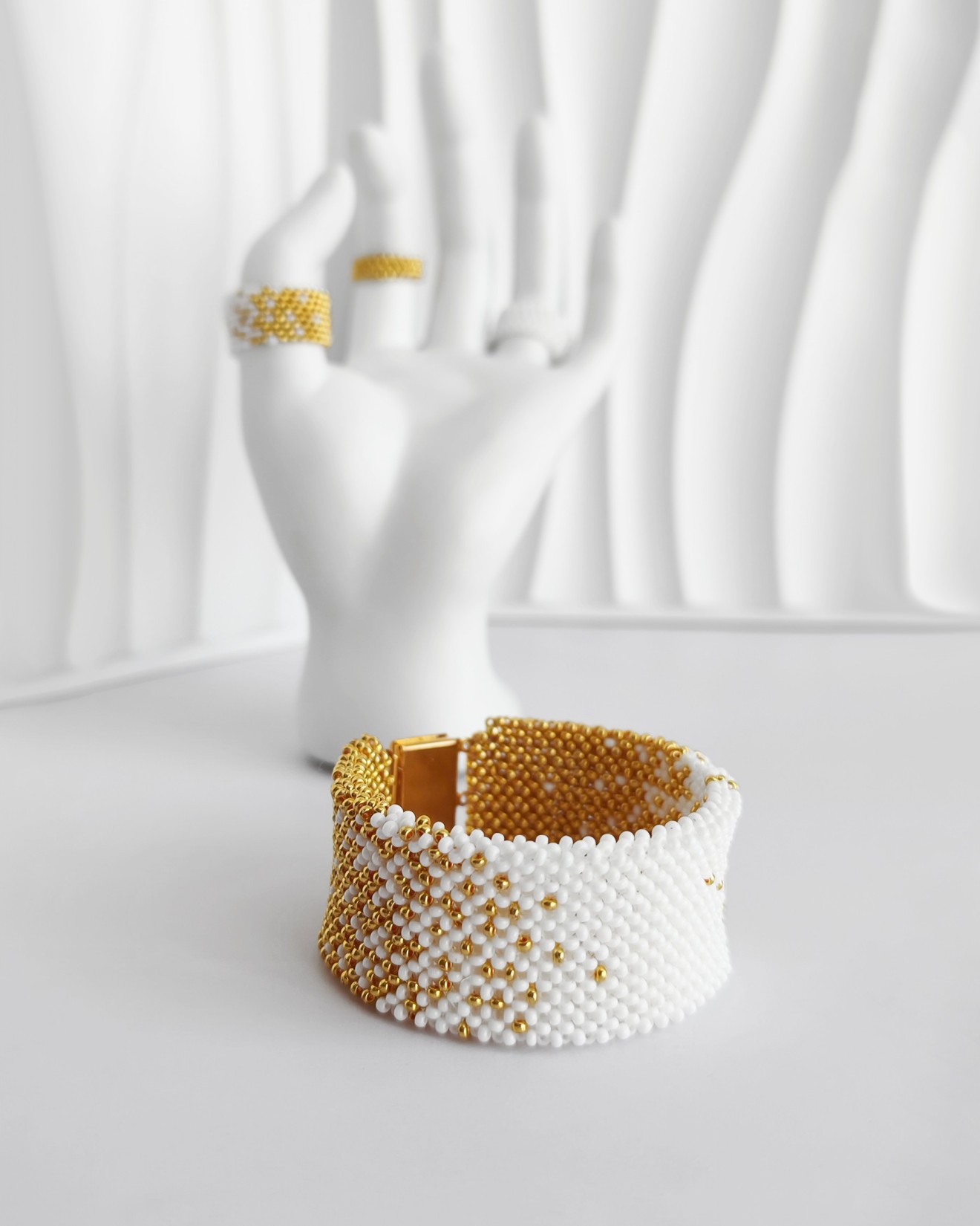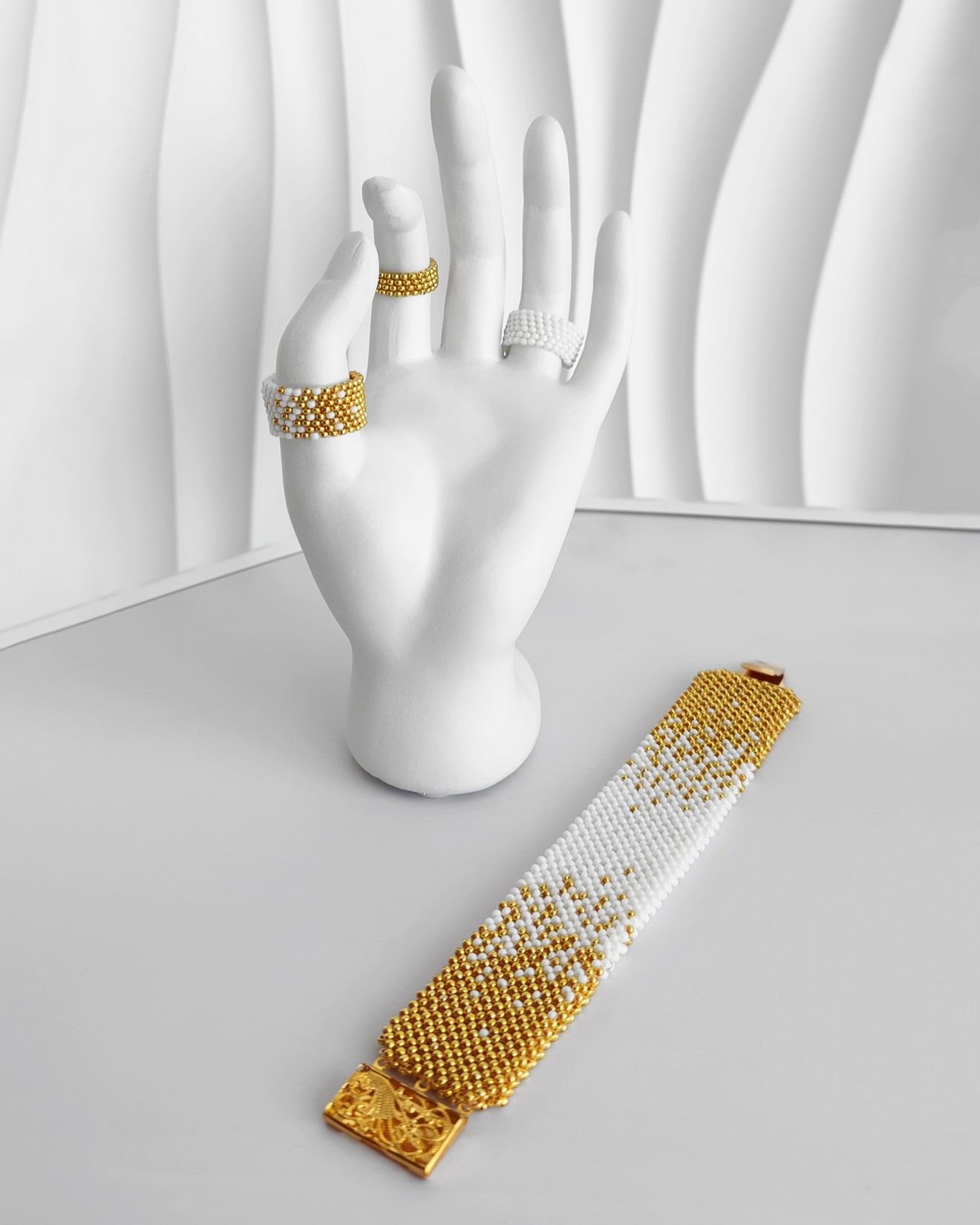 - Чешки мъниста: млечно бели и сребристи - Дължина на гривната: 18 см със закопчалката - Широчина на гривната: 3 см х 5 мм - Диаметри на пръстените: златен 15 мм, бял 17 мм, преливащ 19 мм - Плетено на ръка Можете да разгледате и други модели във - Фейсбук: collier.jewelry.j.j - Инстаграм: collier.j.j