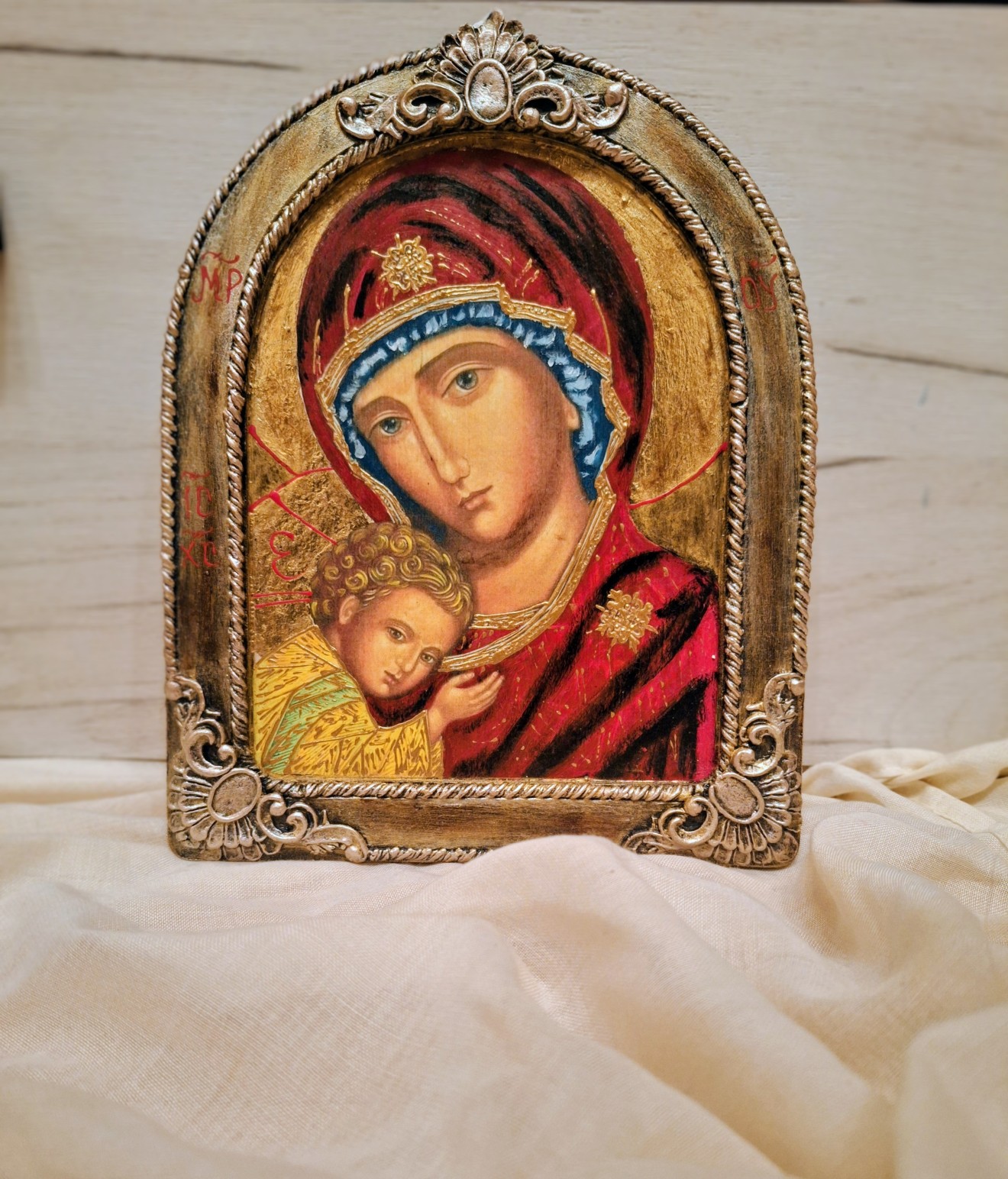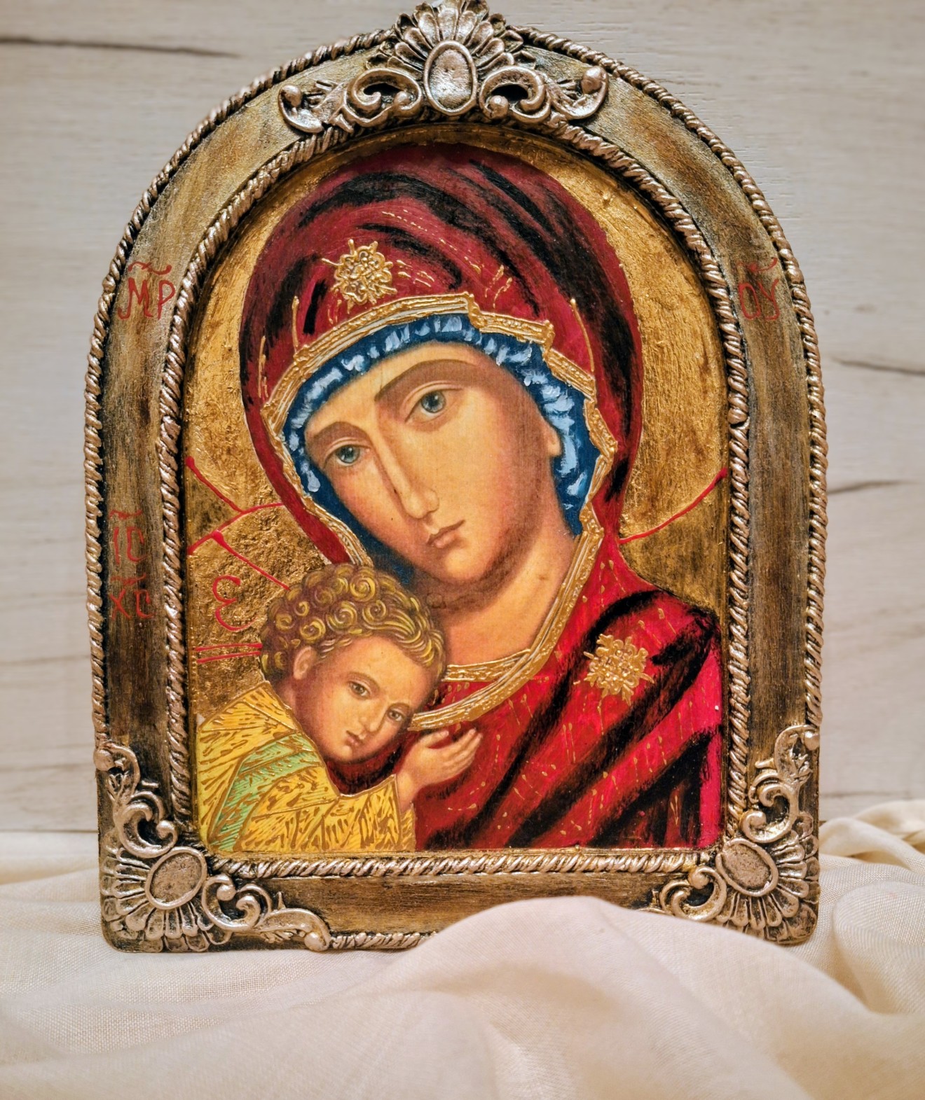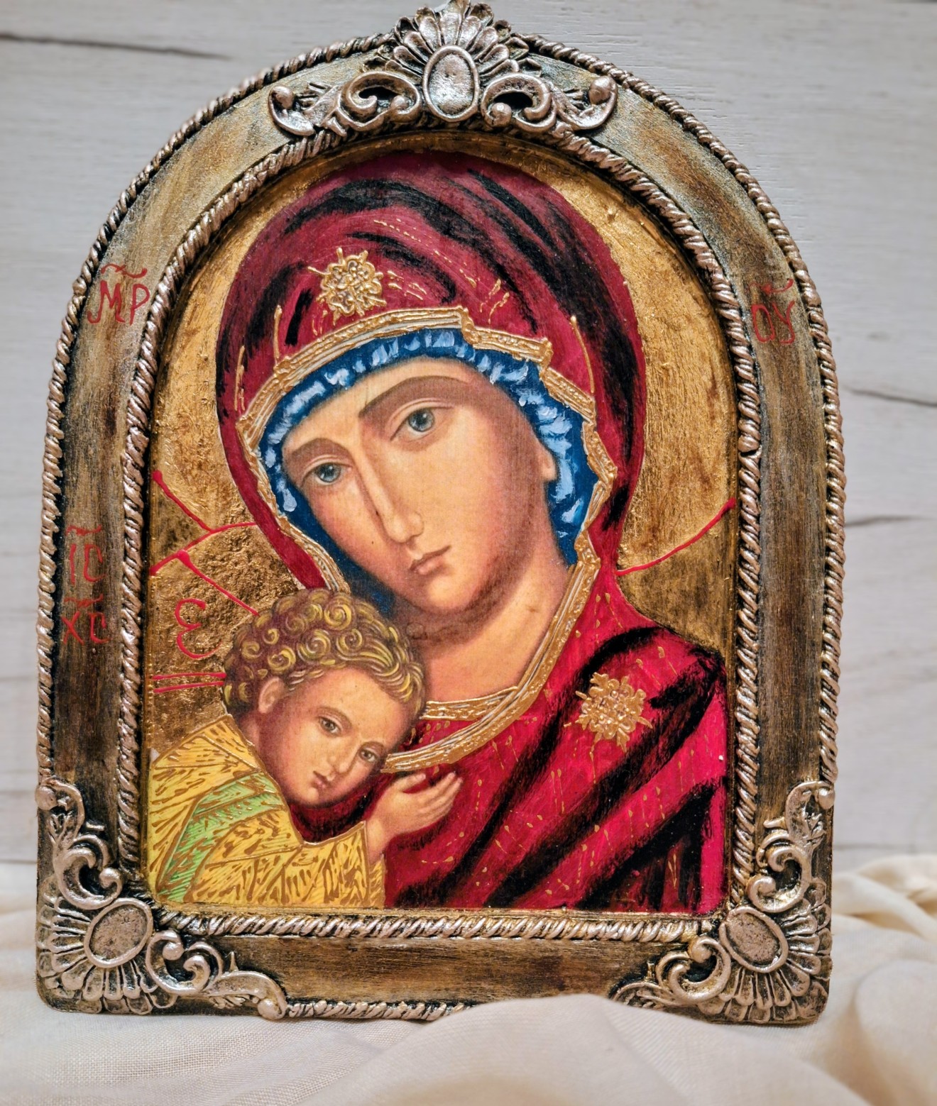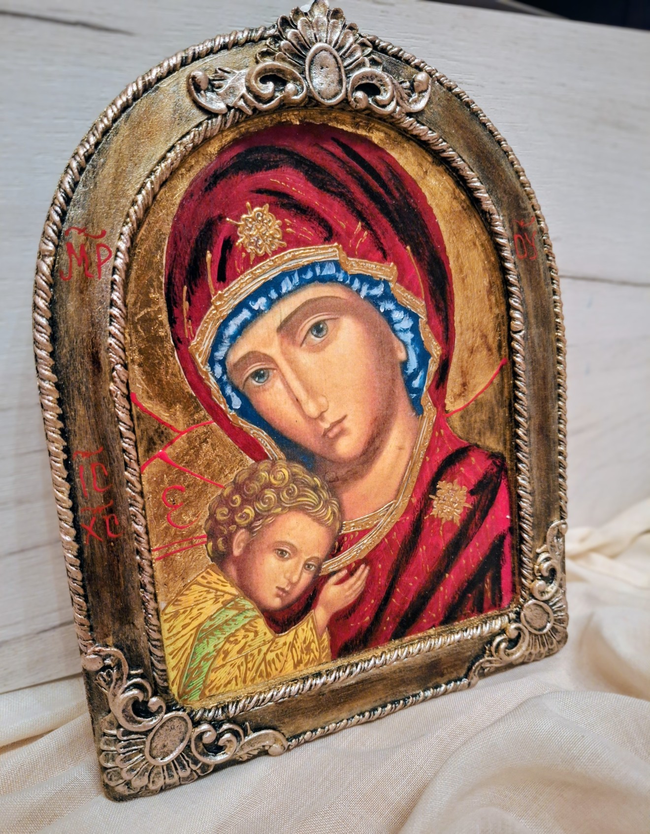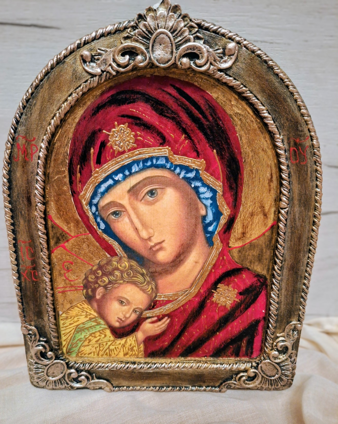 Икона на Св. Богородица с Младенеца. Обемти елементи, златен варак.