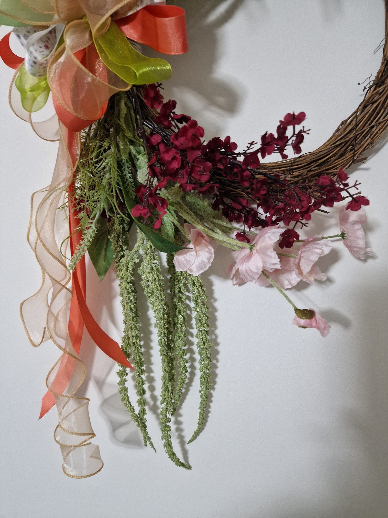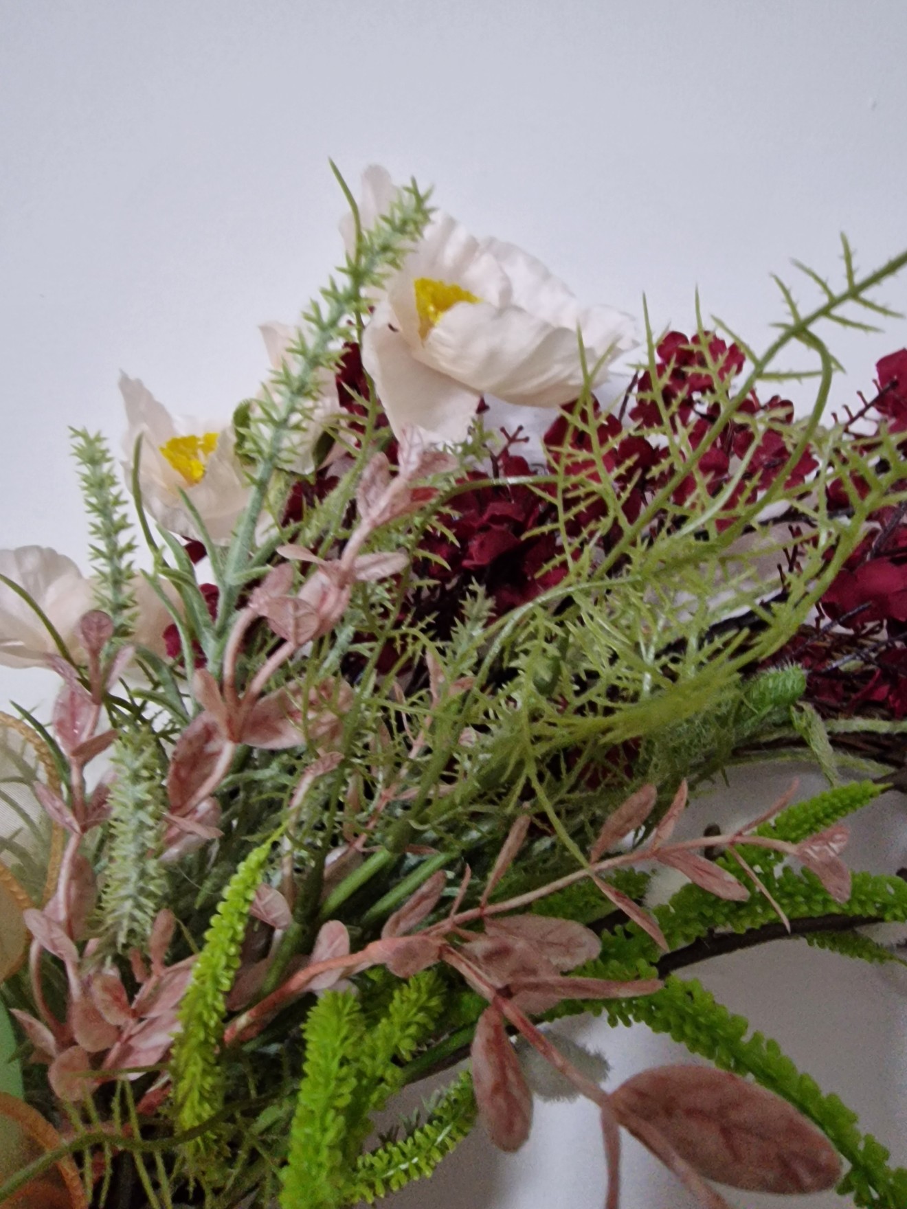 Основа от лозови пръчки и висококачествени изкуствени цветя, зелена растителност и панделки.