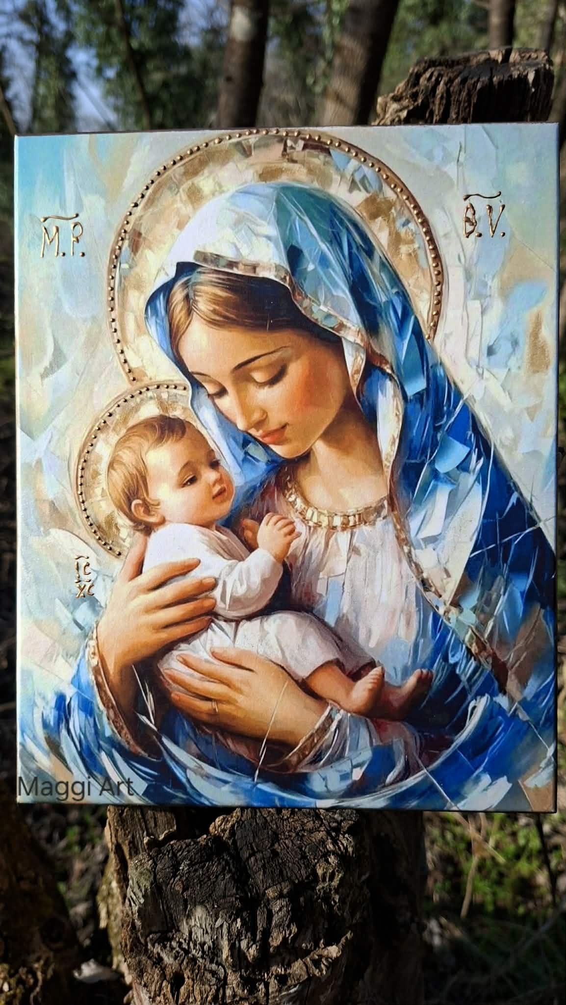 Добро утро в петък,прекрасни хора. Икона на Божията майка с младенеца"Умиление" Иконата е изработена върху дървена основа с размер 20/25/2,5см. Художествен декупаж,акрилни бои,антични и битумни пасти,байц,контури и пчелен восък. При желание може да бъде изработена и в други размери и персонализирана с текст-пожелание за различни поводи.