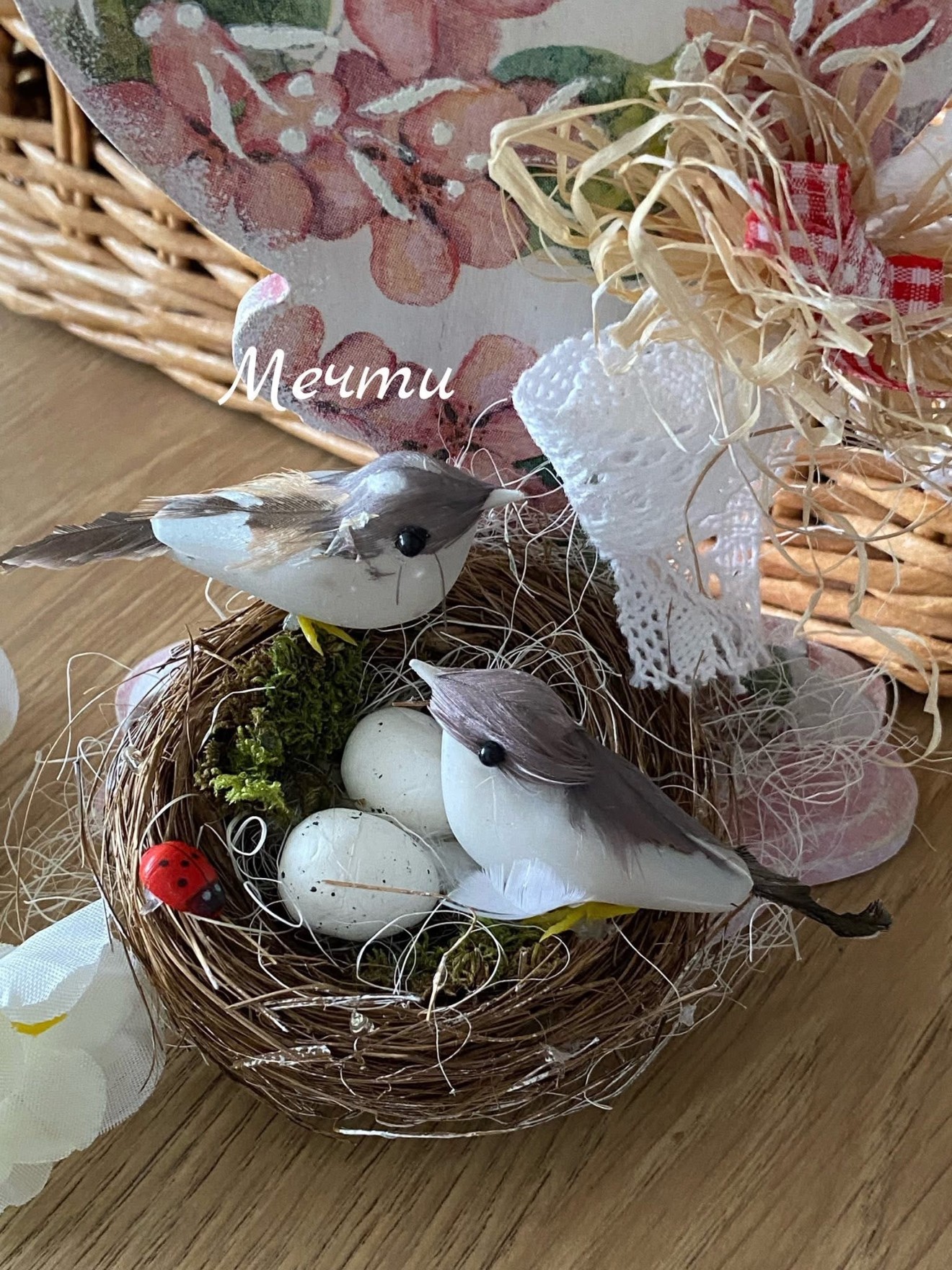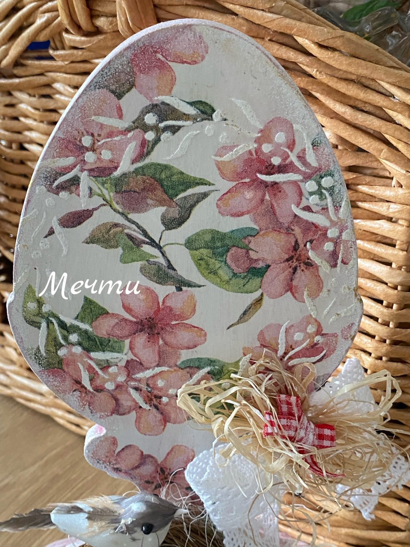 Великденско яйце-Черешов цвят!🌸🌸🌸 Яйце от мдф на стойка, декорирано с декупаж, гнездо с пиленца, кокосова трева, рафия…🪺🪹🪶 Размери; 20см./10,7см. #Великден #декорация #handmade #ръчнаизработка #пролет #яйце #ЧерешовЦвят