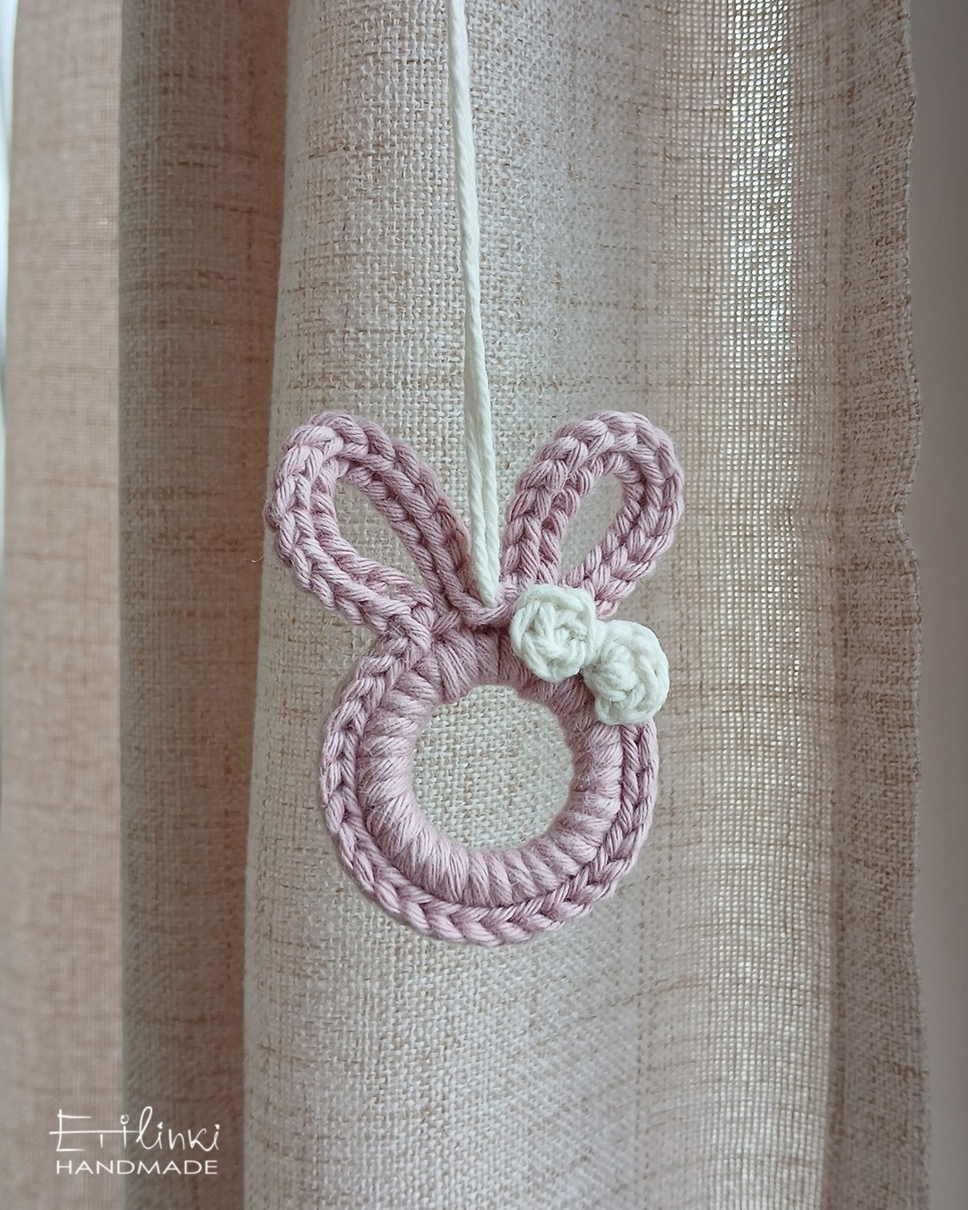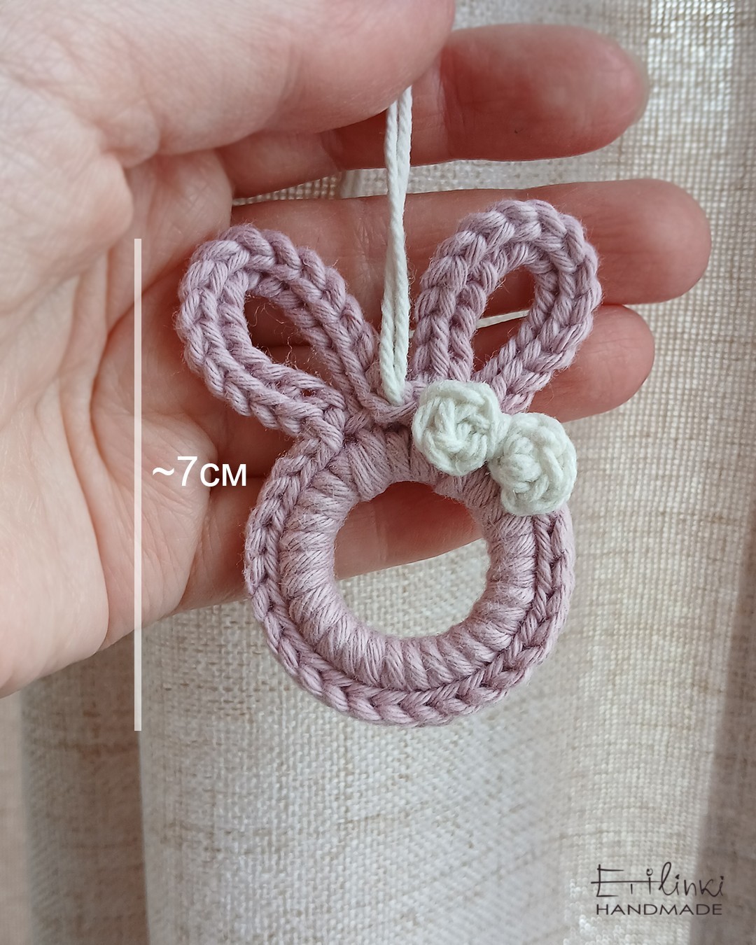 Ако обичаш минималистичната украса, това зайче-орнамент е за теб. Ръчно изпелтено на една кука около акрилен ринг. Размер във височина ок. 7 см.