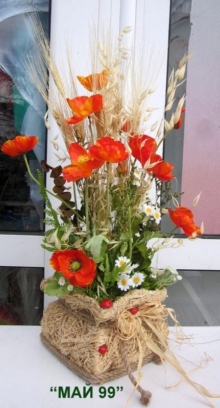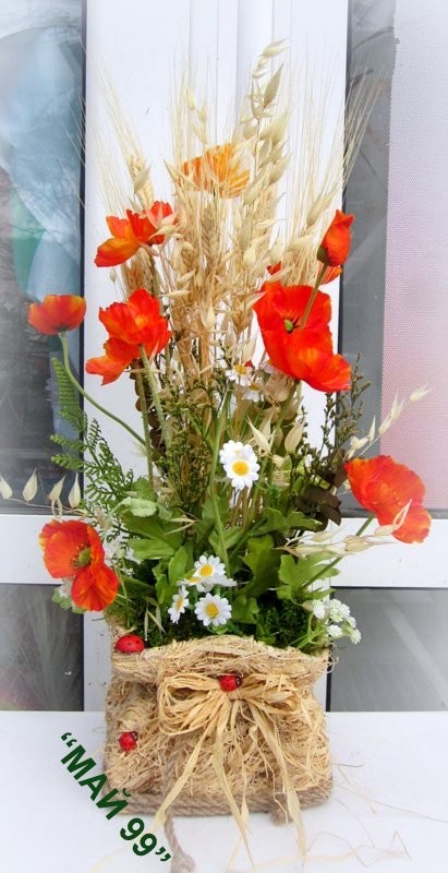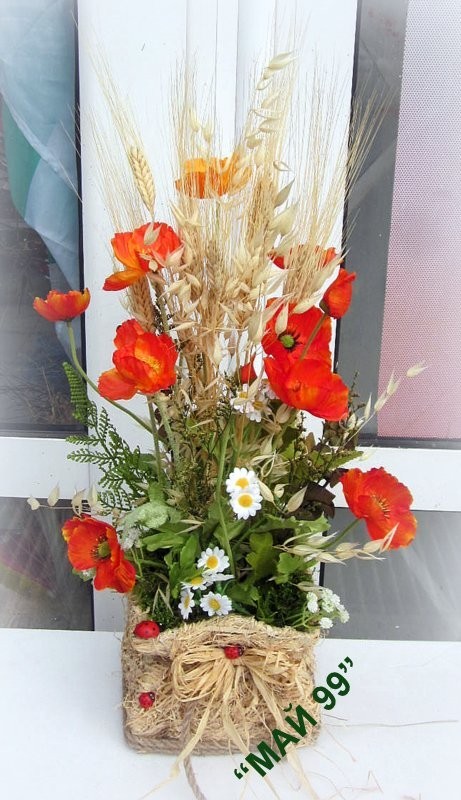 Богата аранжировка в сламена квадратнва кашпа с въже и слама от житни класове,изсушени лайки и маргаритки,зелени треви и оранжеви макове с размери 17/55 см.