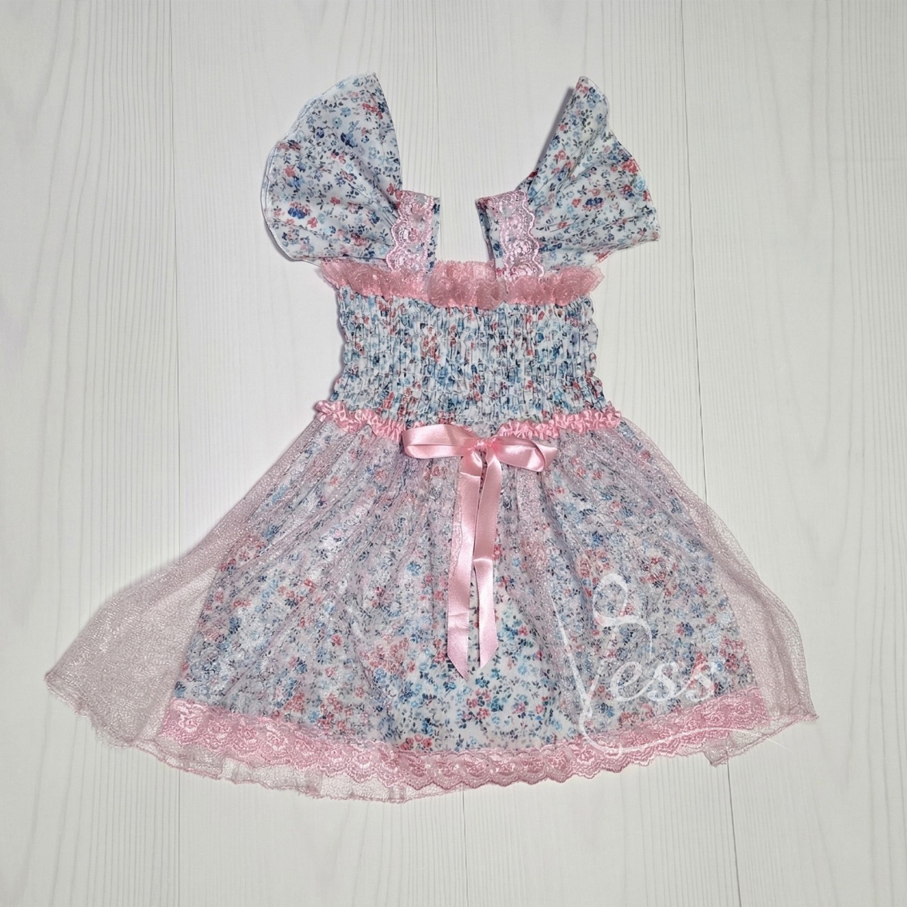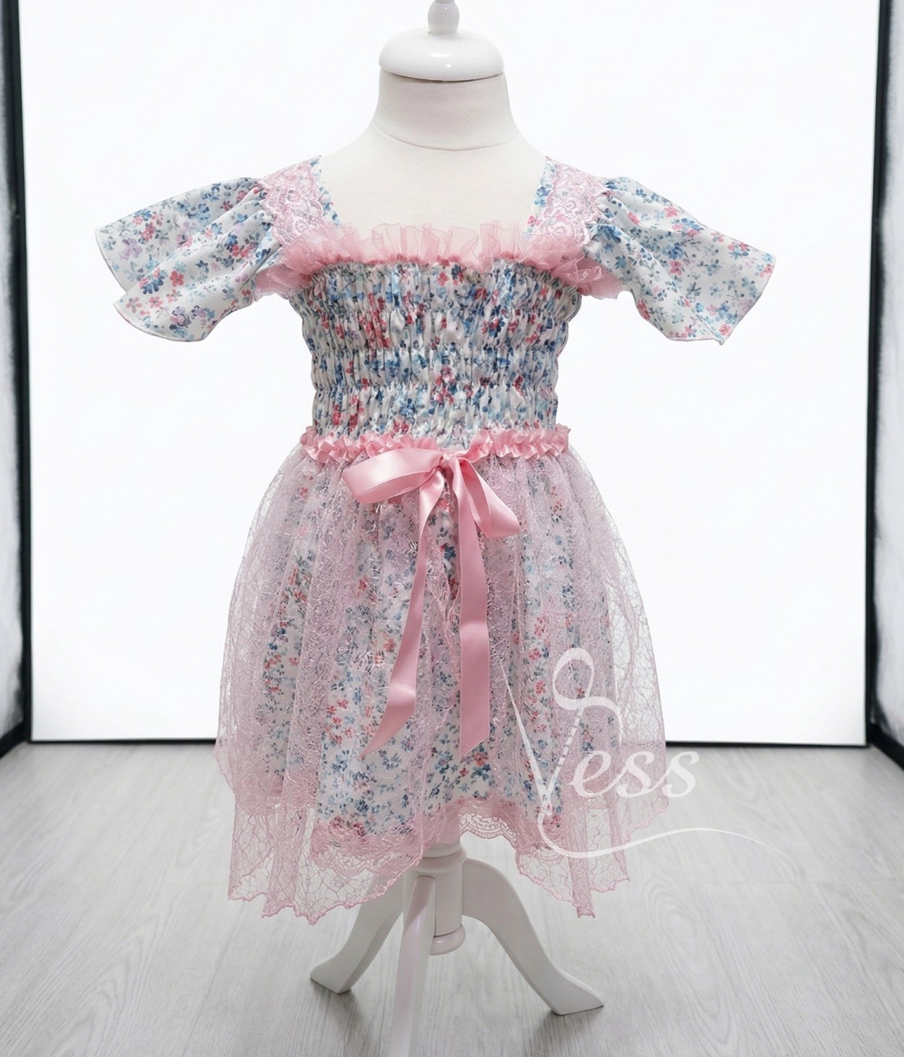 Роклята е изработена от лек памучен текстил на ситни пролетни цветя в синята и розовата гама. Горната част е прецизно набрана с ластични конци, което осигурява комфорт и перфектно прилягане по тялото. Деколтето и талията са подчертани от нежни розови волани и дантела. В предната част е добавена изящна розова сатенена панделка, която служи за нежен фокусен център. Ръкавите са тип „крилца“, придаващи ефирност. Полата е покрита с богат пласт фина розова дантела, която завършва с вълнообразен подгъв, създавайки обем и приказна визия.