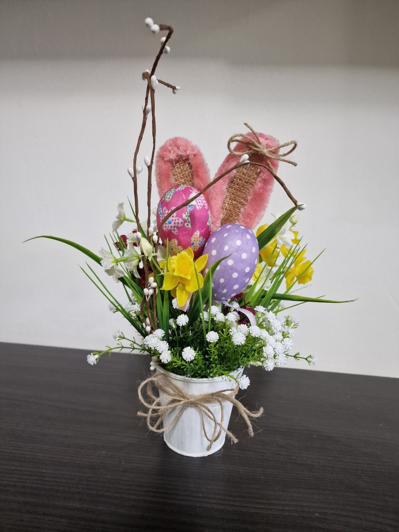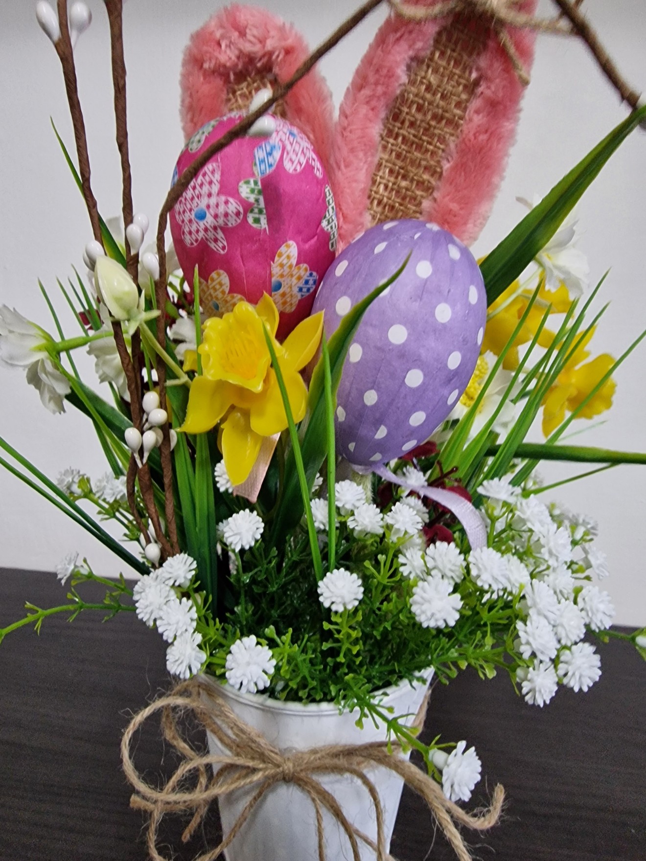 Декорация за Великден в кофичка. Изкуствени цветя и зеленина.