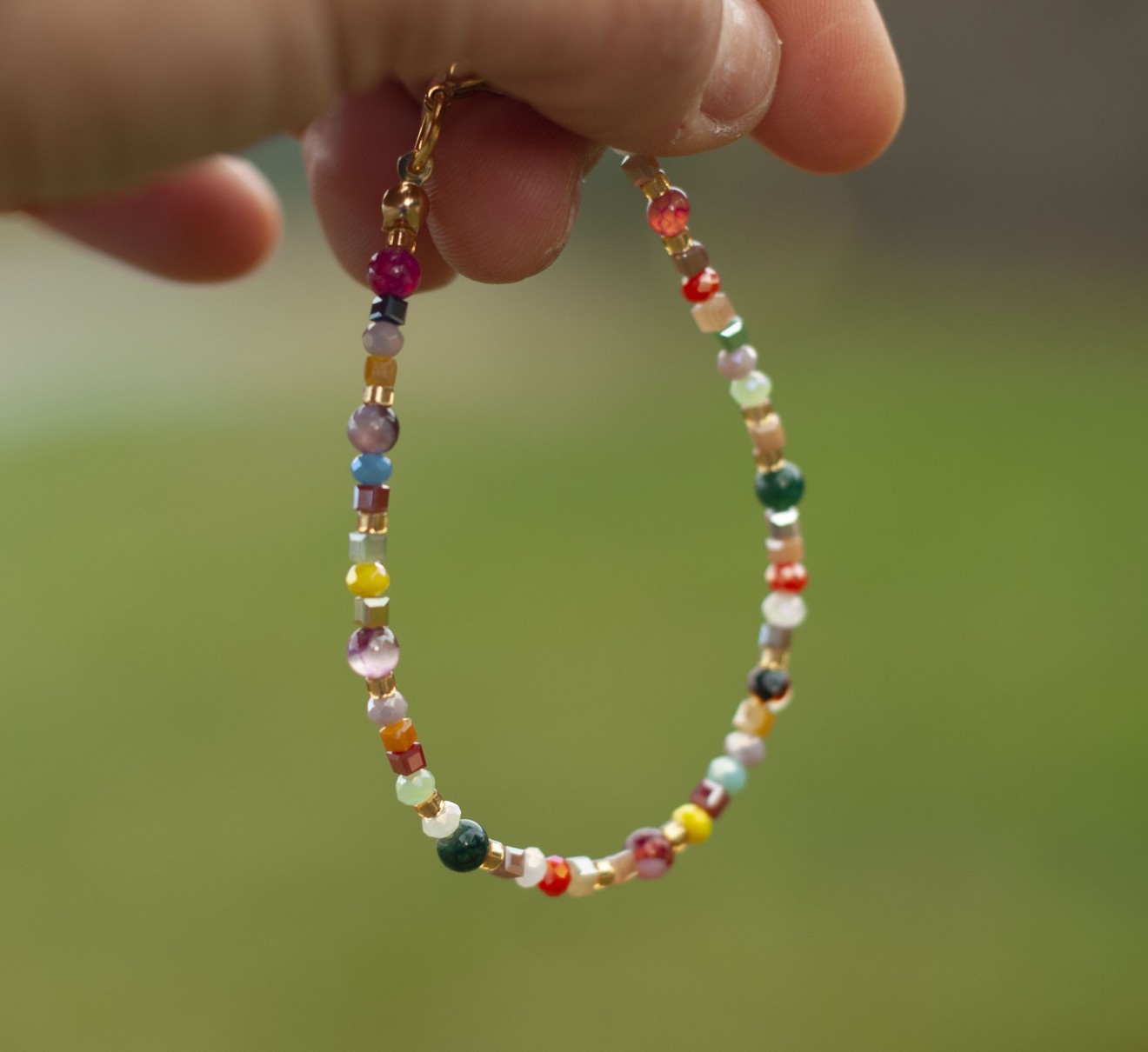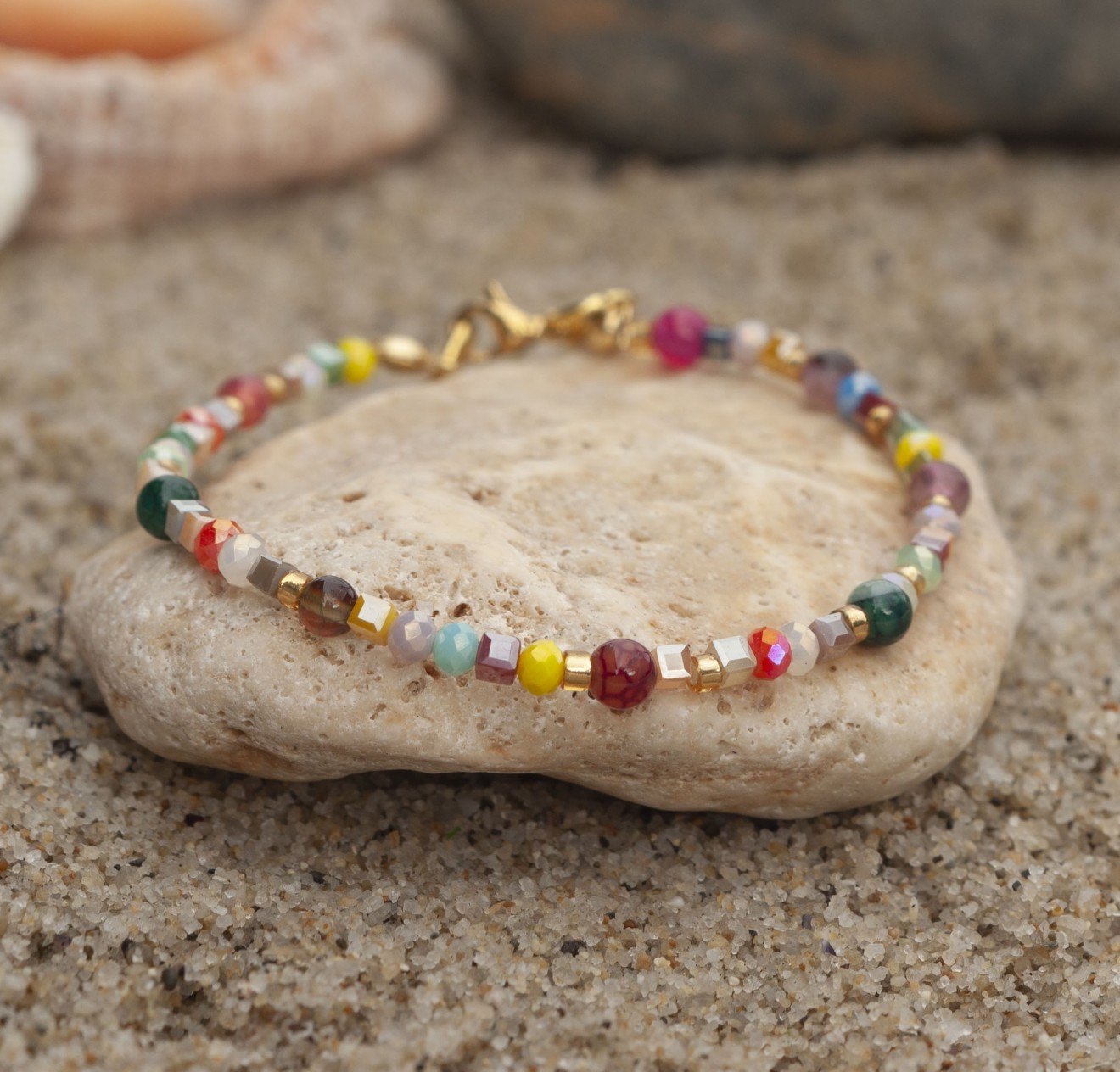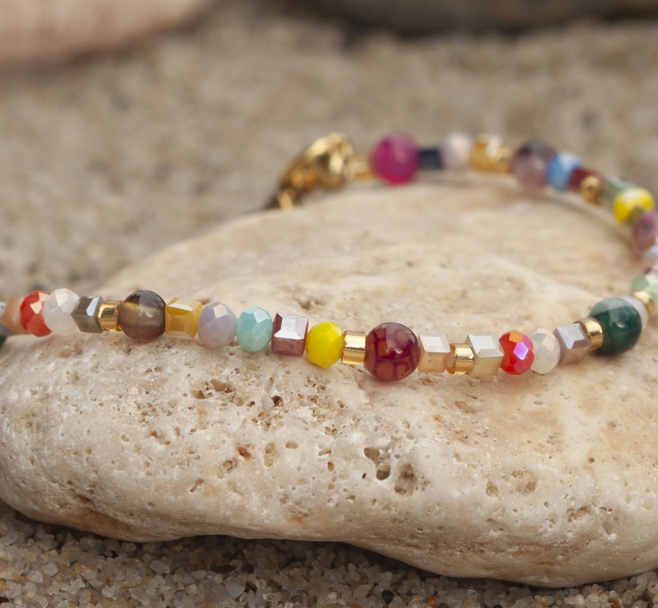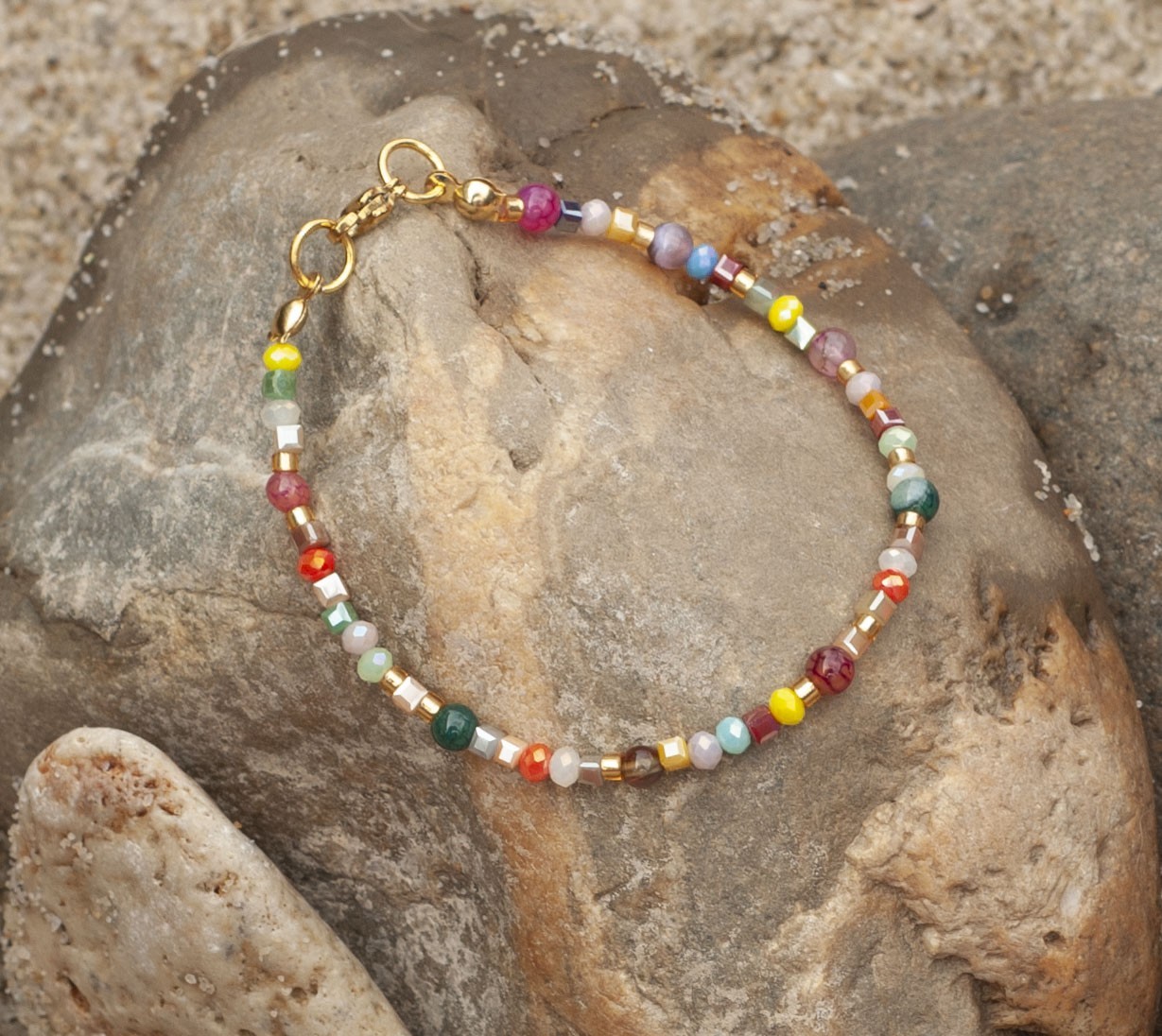 Тази гривна онези дни, в които искаш да ти е цветно, леко и малко по-дръзко. Използвах Драконов ахат - камък, който изглежда сякаш е напукан от слънцето, и го смесих с фасетирани кристали, които искрят при всяко движение. Малко детайли: ✨ Камъни: Естествен Драконов ахат (4мм) и малки стъклени акценти. ✨ Закопчалка стомана (златиста). ✨ Размер: 18см. + удължител 5см 🎁 Поръчки над 25 евро - доставката до офис на Спиди е от мен.
