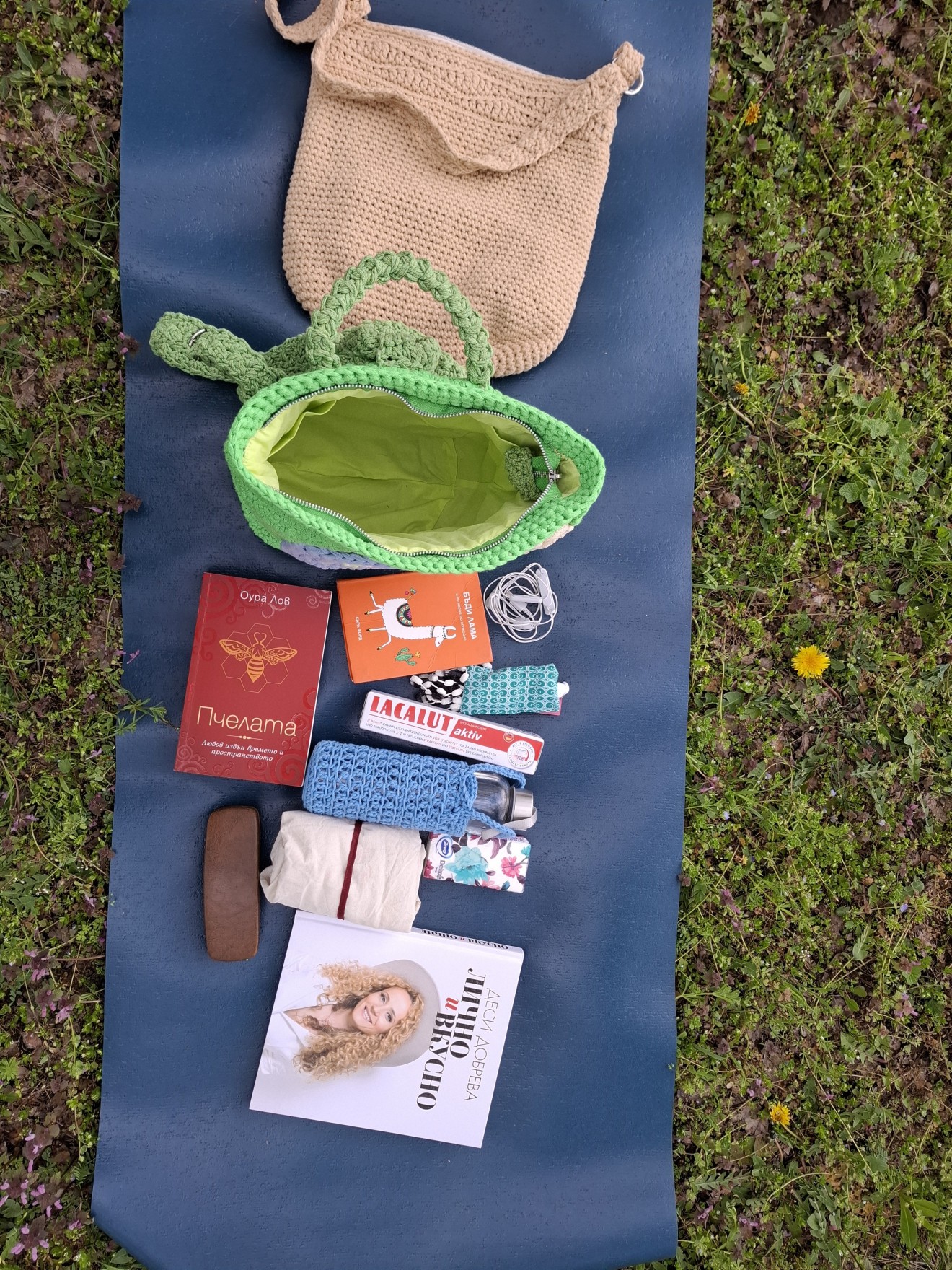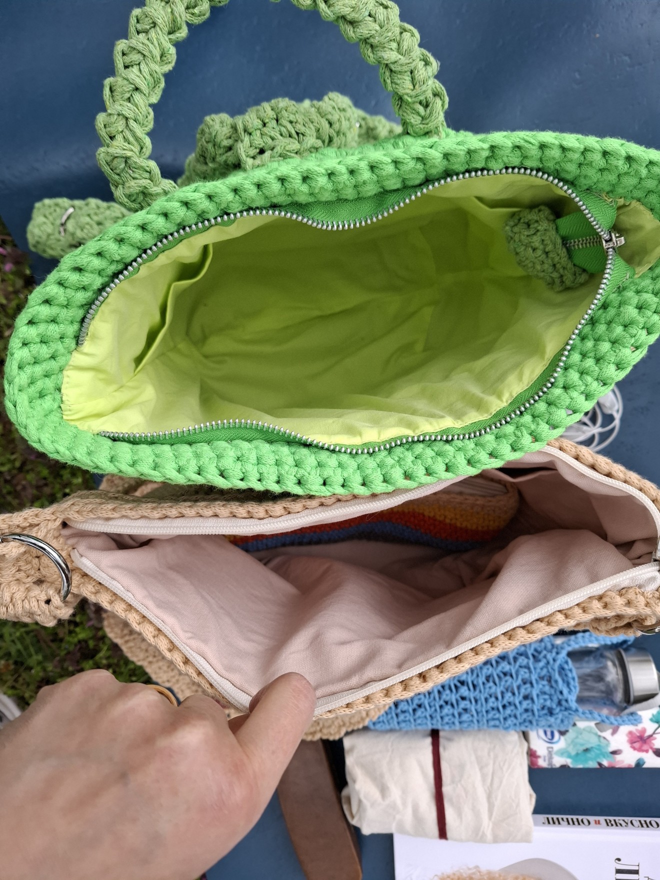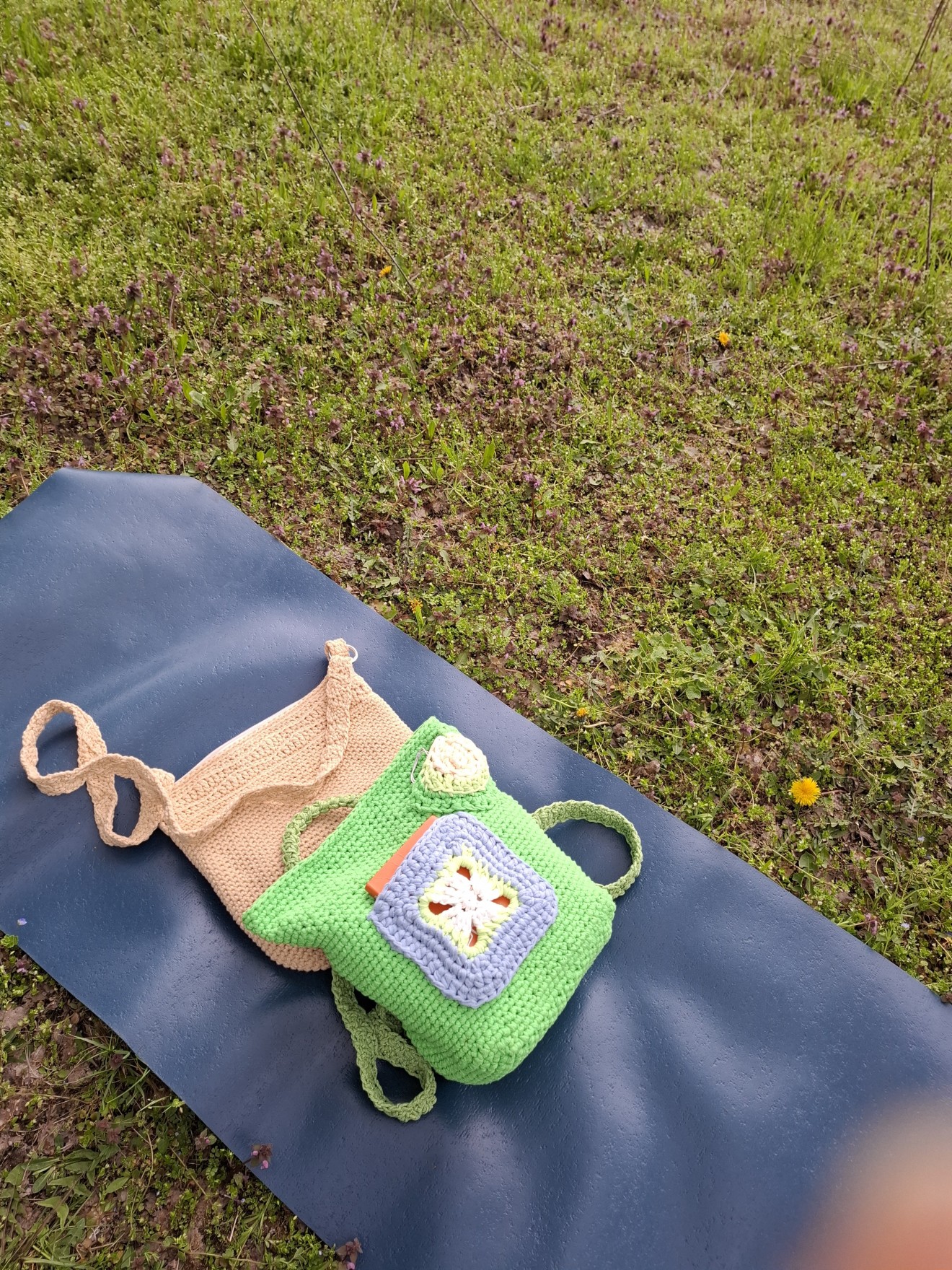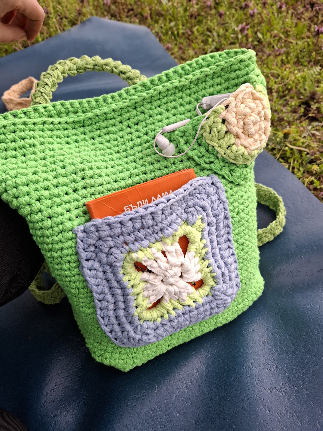 Дамска раница "Пролетни цветя". Получи името си, малко преди да изляза да я снимам. Вкъщи я описаха, че цила зелена и с цветя, точно като пролетта. Има два малки външни джоба и се закопчава с цип отгоре. Изплетена е от лека равномерна памучна лента. Плетени дръжки от тънко памучно въже, които могат да се регулират. Има подплата с два вътрешни джоба от едната страна. Размери: Височина 30 см. Дъно 26/13 см. На снимките се вижда какво събира, включително във външните джобчета. Напишете съобщение, ако я познаете за себе си или за подарък. Поздрави! Пълноцветни дарове