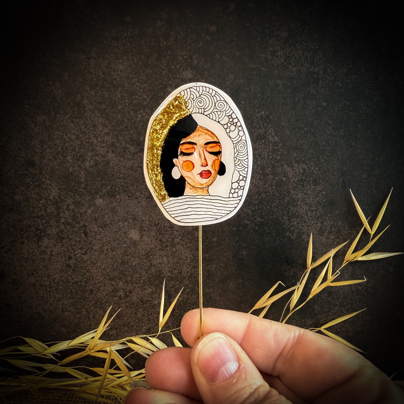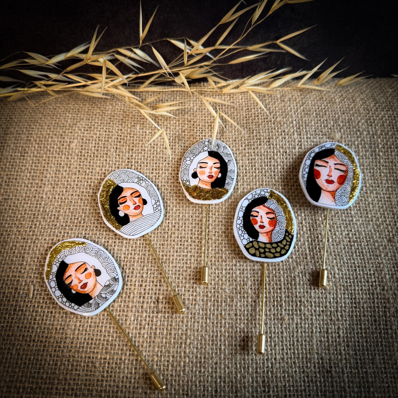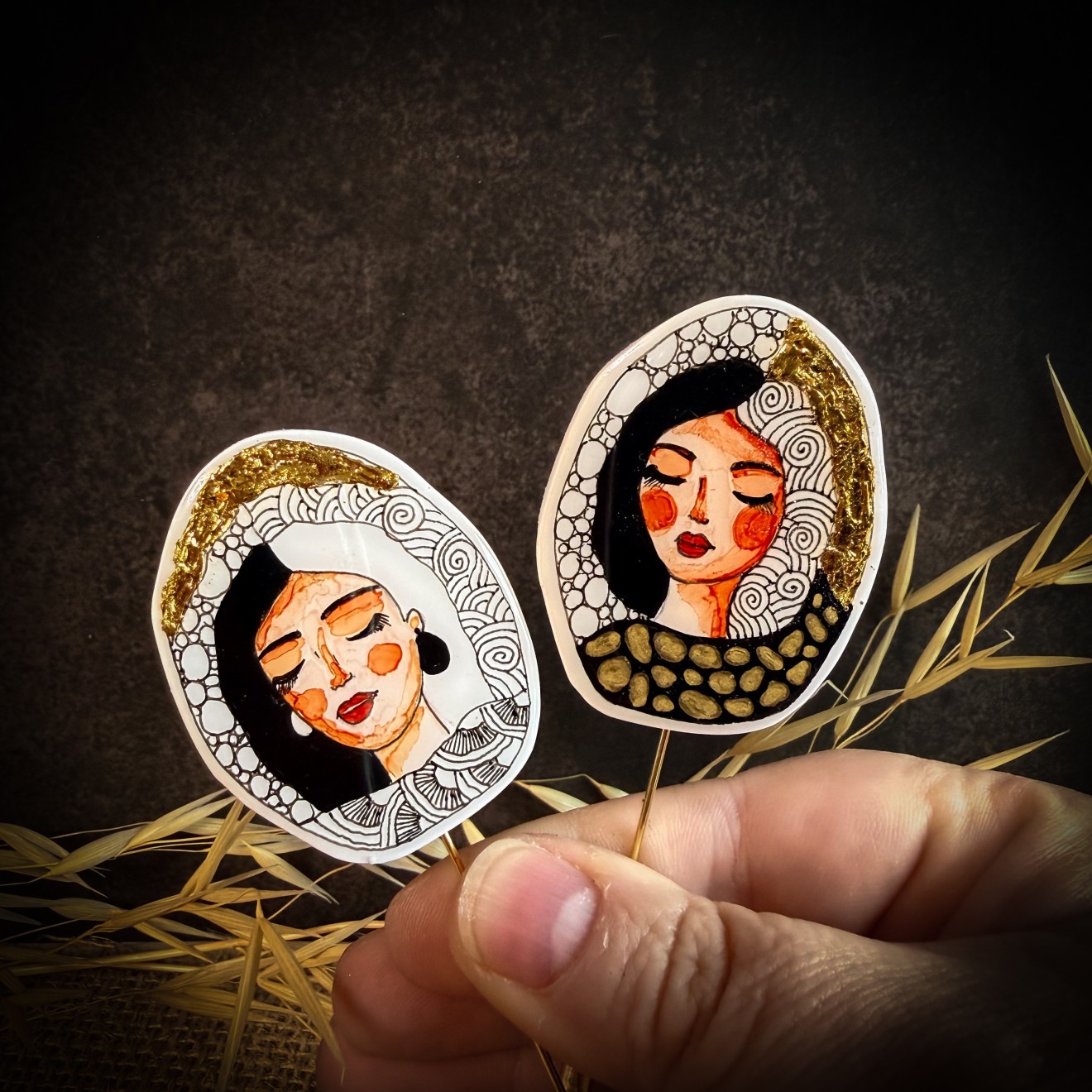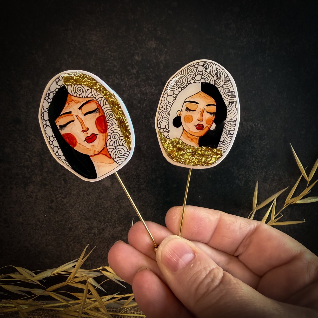Ръчно изрисувани брошки “Маракеш”, които разказват истории. Няма две еднакви, абсолютно уникални. Декорирани са със златен варак.