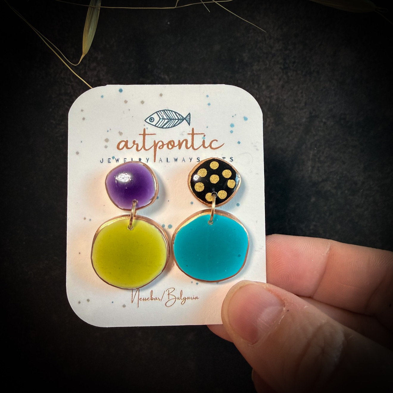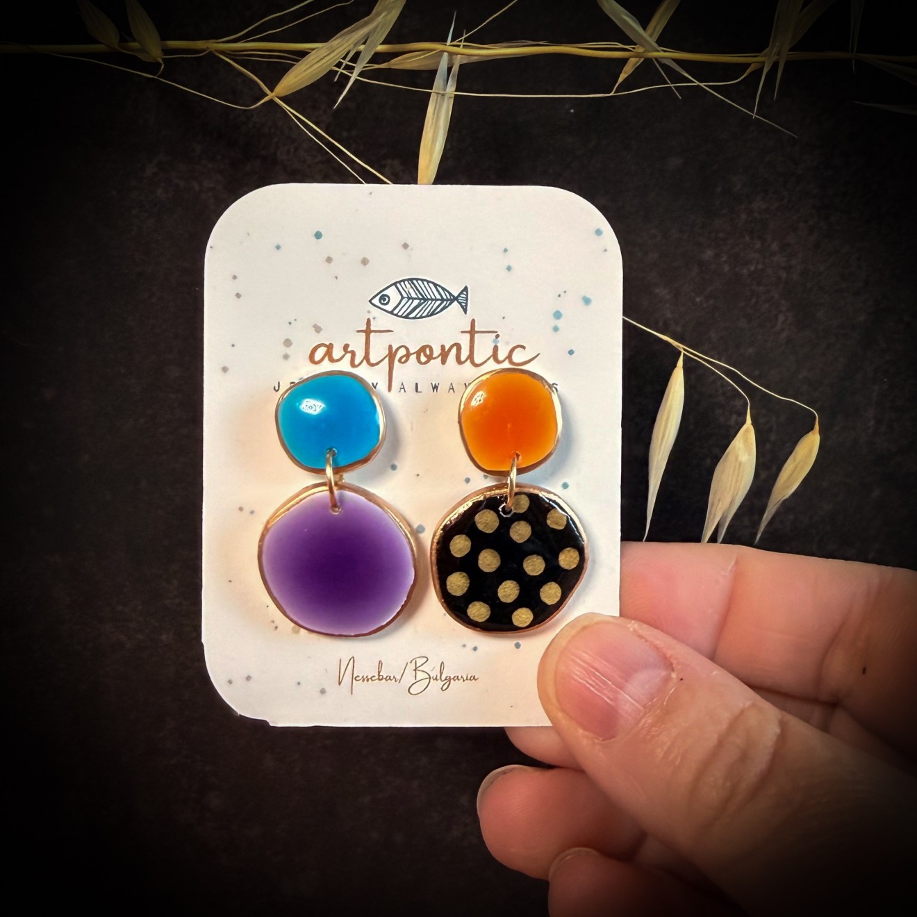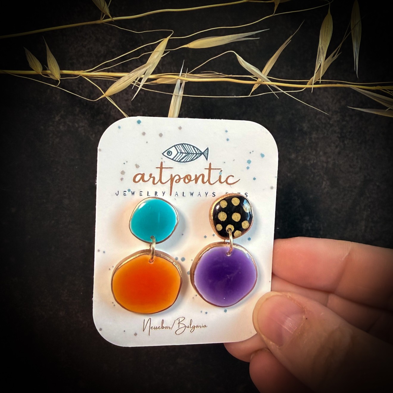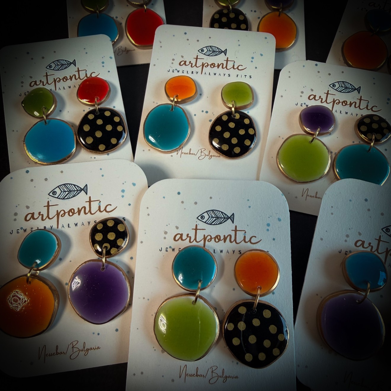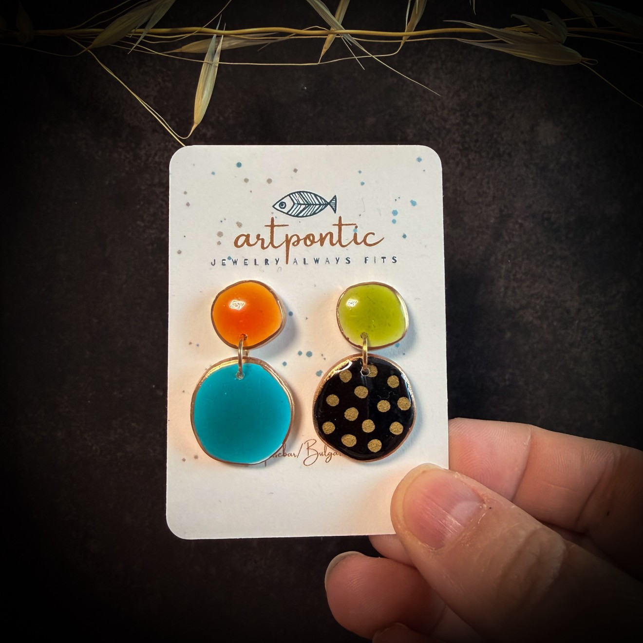 Разкошни, супер сладурски обеци, изработени в различни цветове от глина и оцветена смола. Обкантени със течно злато на стоманен щифт. Попитайте за налични цветове!