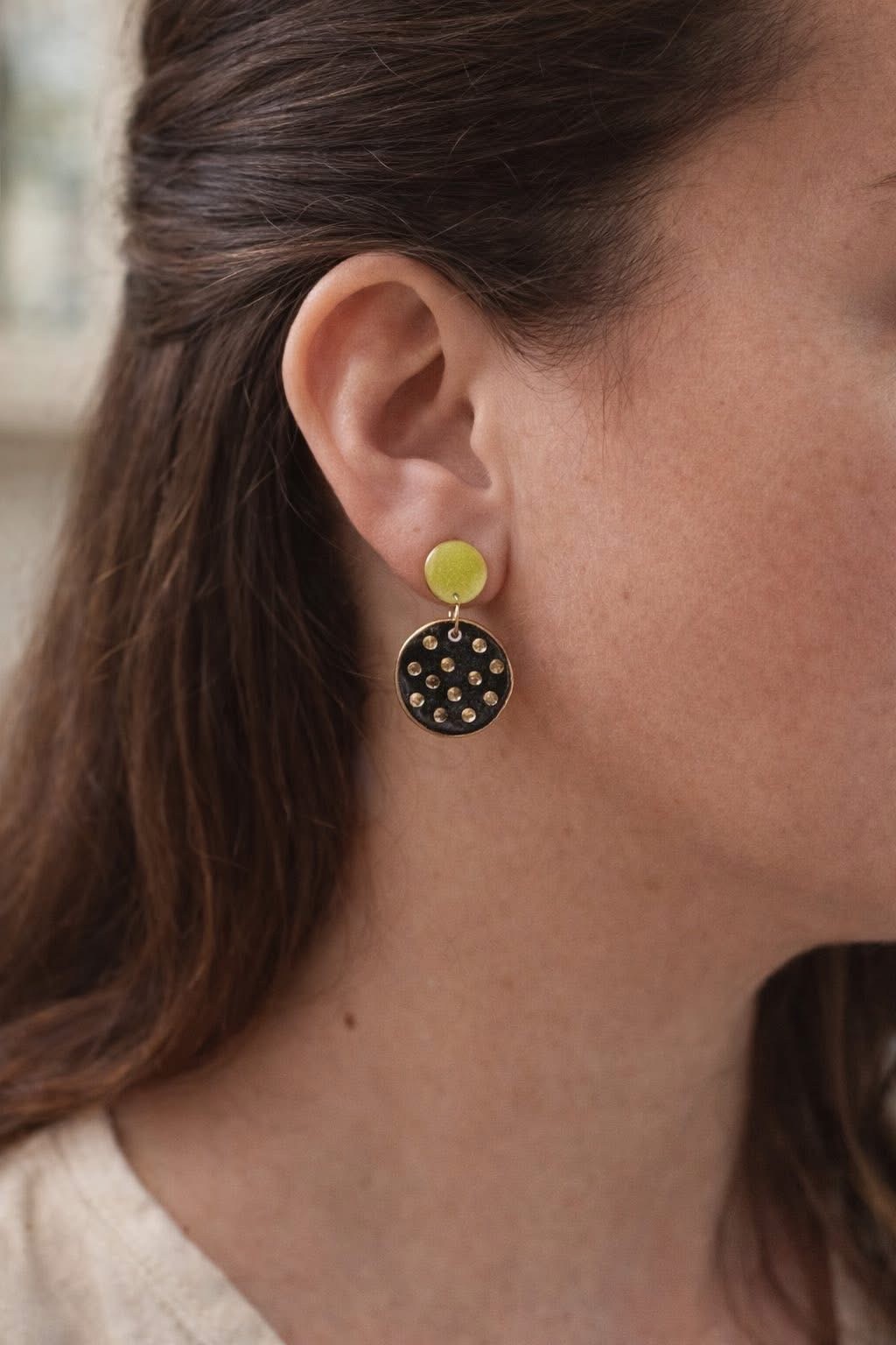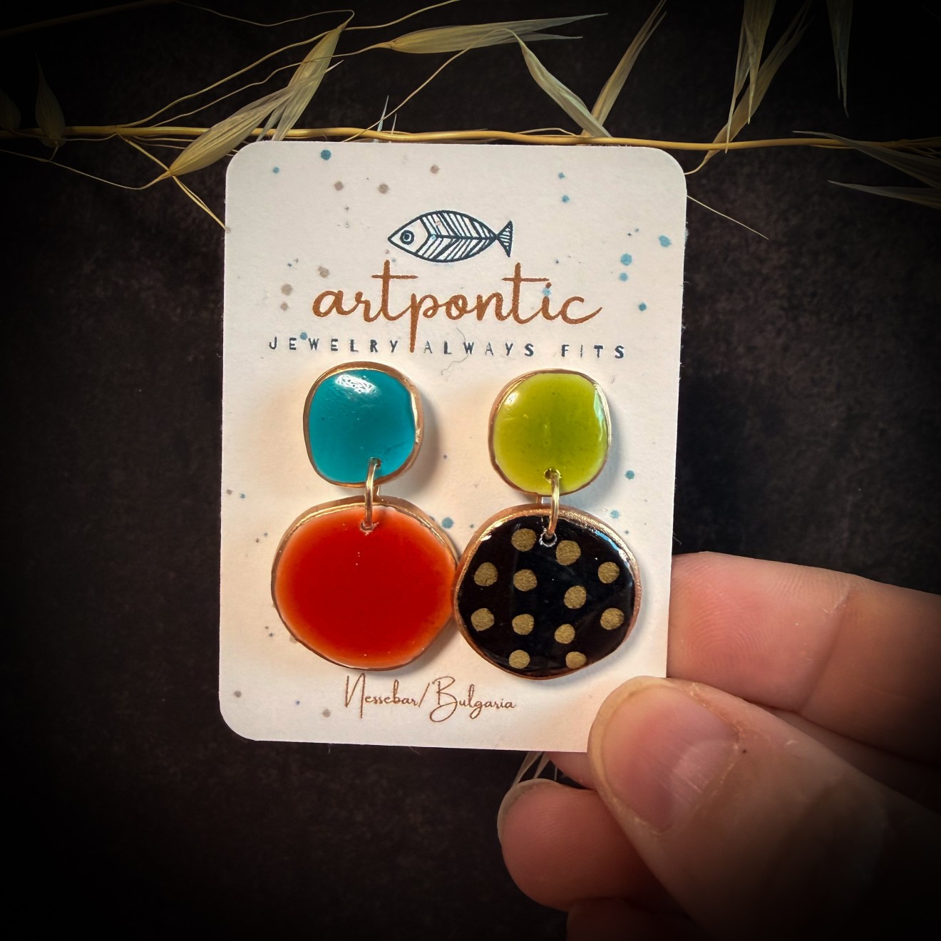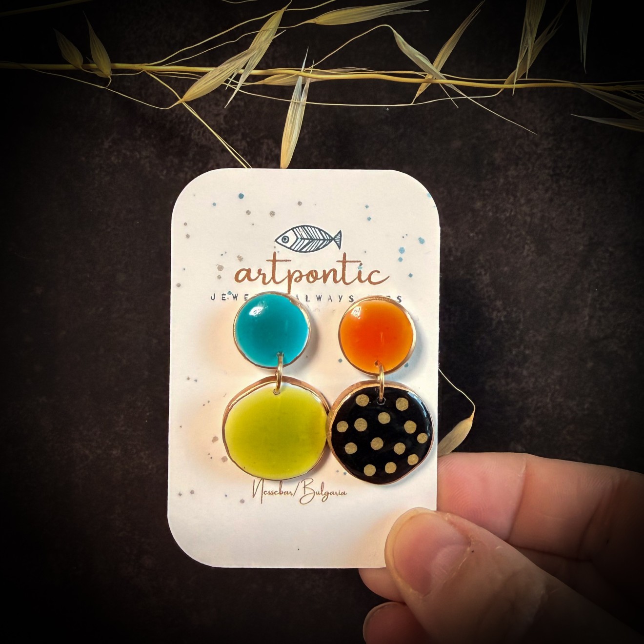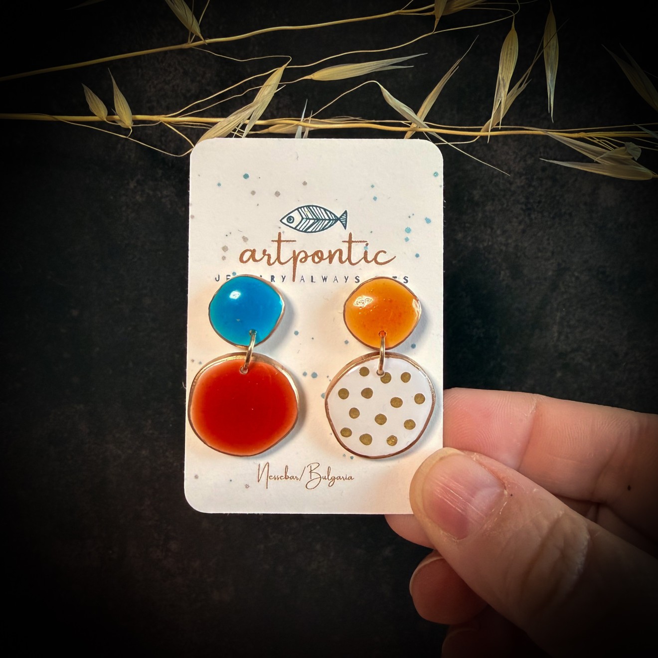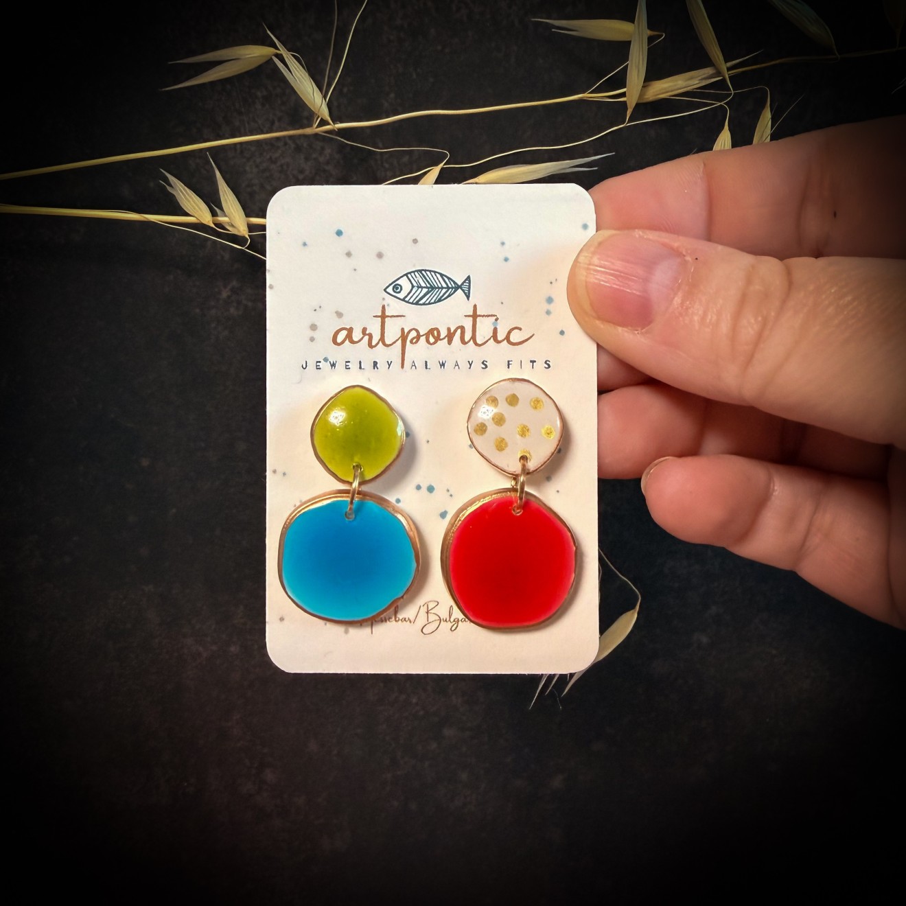 Разкошни, супер сладурски обеци, изработени в различни цветове от глина и оцветена смола. Обкантени със течно злато на стоманен щифт. Попитайте за налични цветове!
